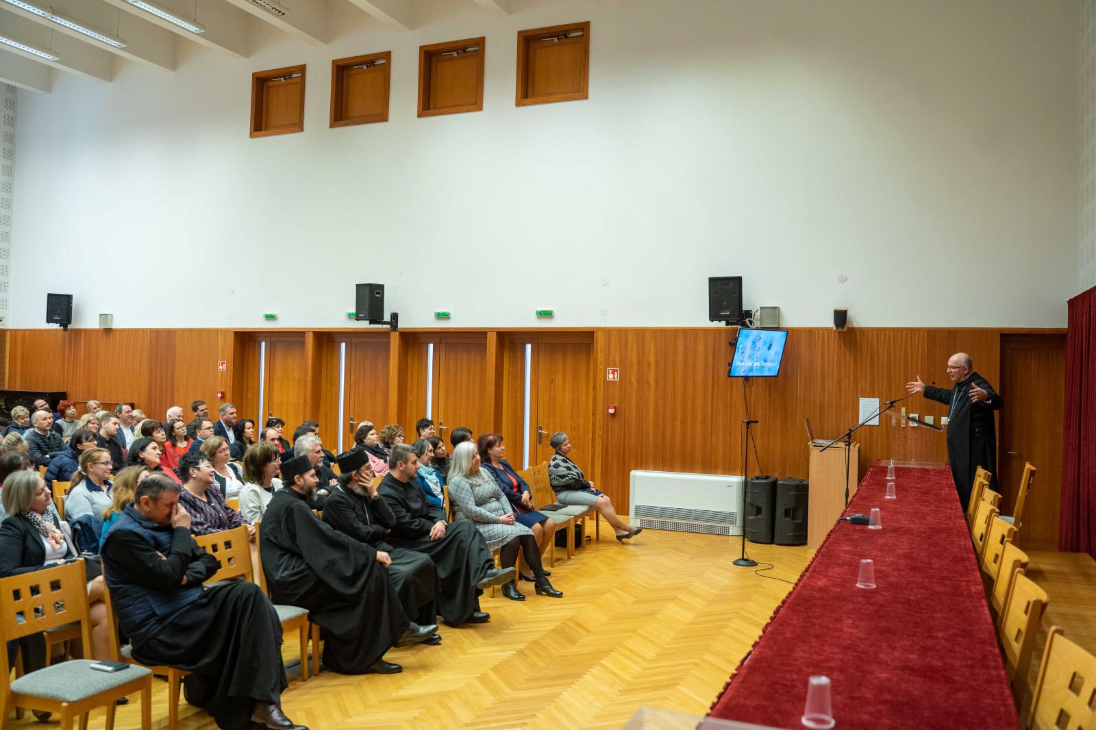 Az előadópárosok után Hortobágyi T. Cirill pannonhalmi főapát következett. A Pannonhalmi Főapátság 10+1 iskola fenntartója, s a főapát a rendszeresen megtartott pedagógiai napok mottóját hozta a hallgatók elé: „Tanárok vagyunk, de ha csak tanítunk és többé már nem tanulunk semmit, akkor valami nincs rendben.”