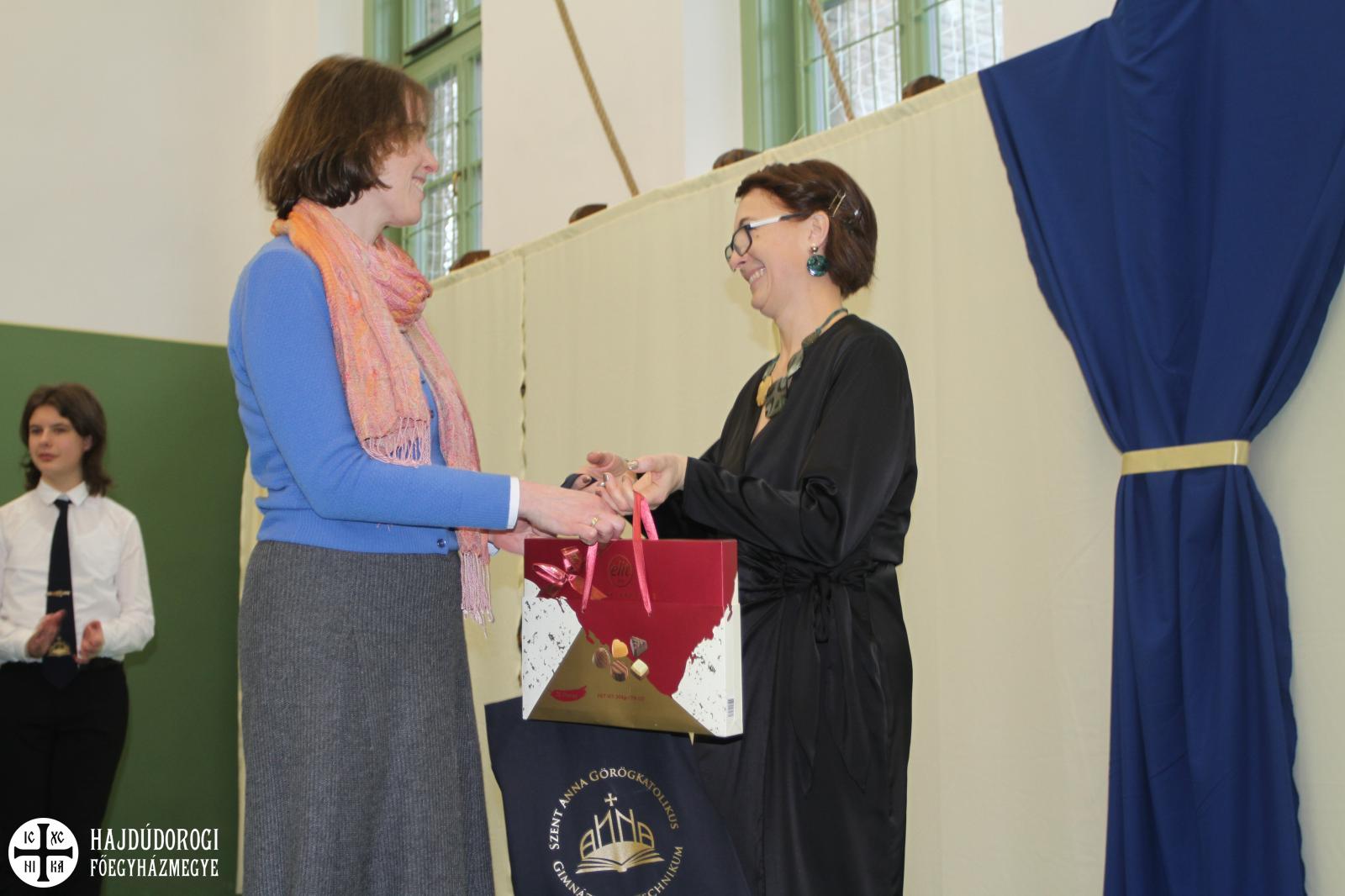 Az igazgatónő az alapító okiratból is idézett: “Az alapítvány célja a Szent Anna Görögkatolikus Gimnázium és Technikum 2021. szeptember elsejétől induló szakmai programjában lefektetett célkitűzések támogatása önállóan, valamint más jogi személyekkel és magánszemélyekkel együttműködésben. Az alapítvány támogatja az iskola tevékenységét, tanulóit és volt tanulóit, tantestületének tagjait és az iskola oktatási és nevelési tevékenységébe bekapcsolódó világi és egyházi személyeket, a gimnáziumi és szakképzési, nevelési és oktatási tevékenység iskolán belül és kívüli formáit, ideértve a tehetséggondozást és felzárkóztatást, belföldi és külföldi tanulmányutak támogatását, pedagógiai, szakmai tevékenységek, tantestületi utánpótlás programok megvalósulását, iskolai közösségben végzett szabadidős tevékenységek, iskolán belül végzett kulturális tevékenységek, karitatív hitéleti tevékenységek elősegítését. Továbbá az iskola szakmai programjában megjelenő célkitűzések szerint kiemelkedő teljesítményt nyújtó személyek anyagi és erkölcsi elismerését is szem előtt tartja, az iskola pályázati tevékenységét segíti.” Vénusz Edina hálás köszönetét fejezte ki Dr. Ritter Eszternek, aki pro bono megteremtette az egyesület működési és jogi hátterét.