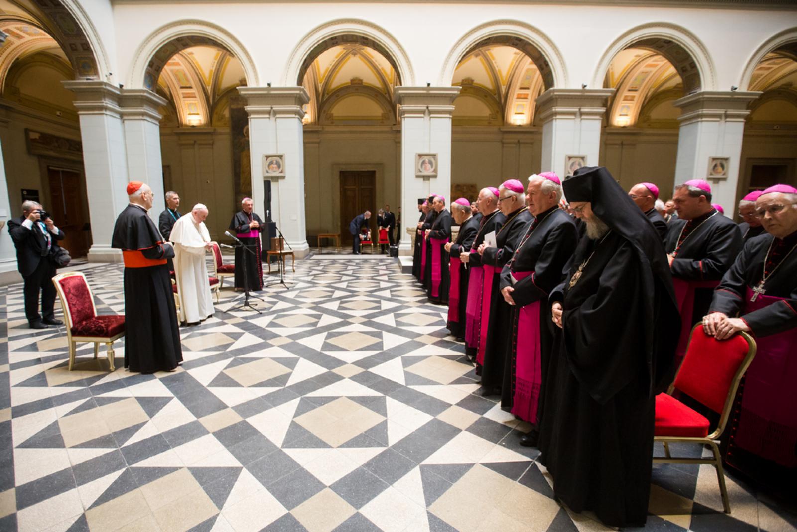 Kedves testvérek, Magyarországnak is arra van szüksége, hogy megújult erővel hirdessük az Evangéliumot, hogy a társadalom és a vallás terén is új testvériség szülessen, hogy új remény épüljön napról napra és örömmel tekintsenek az emberek a jövőbe. Ti vagytok ennek a történelmi folyamatnak, ennek a szép kalandnak a főpásztorai. Isten erősítse meg bennetek a misszió örömét! Köszönöm nektek mindazt, amit tesztek és szívemből megáldalak benneteket. A Szűzanya védelmezzen és Szent József őrizzen benneteket. És ha van egy kis időtök, imádkozzatok a Pápáért. Köszönöm.