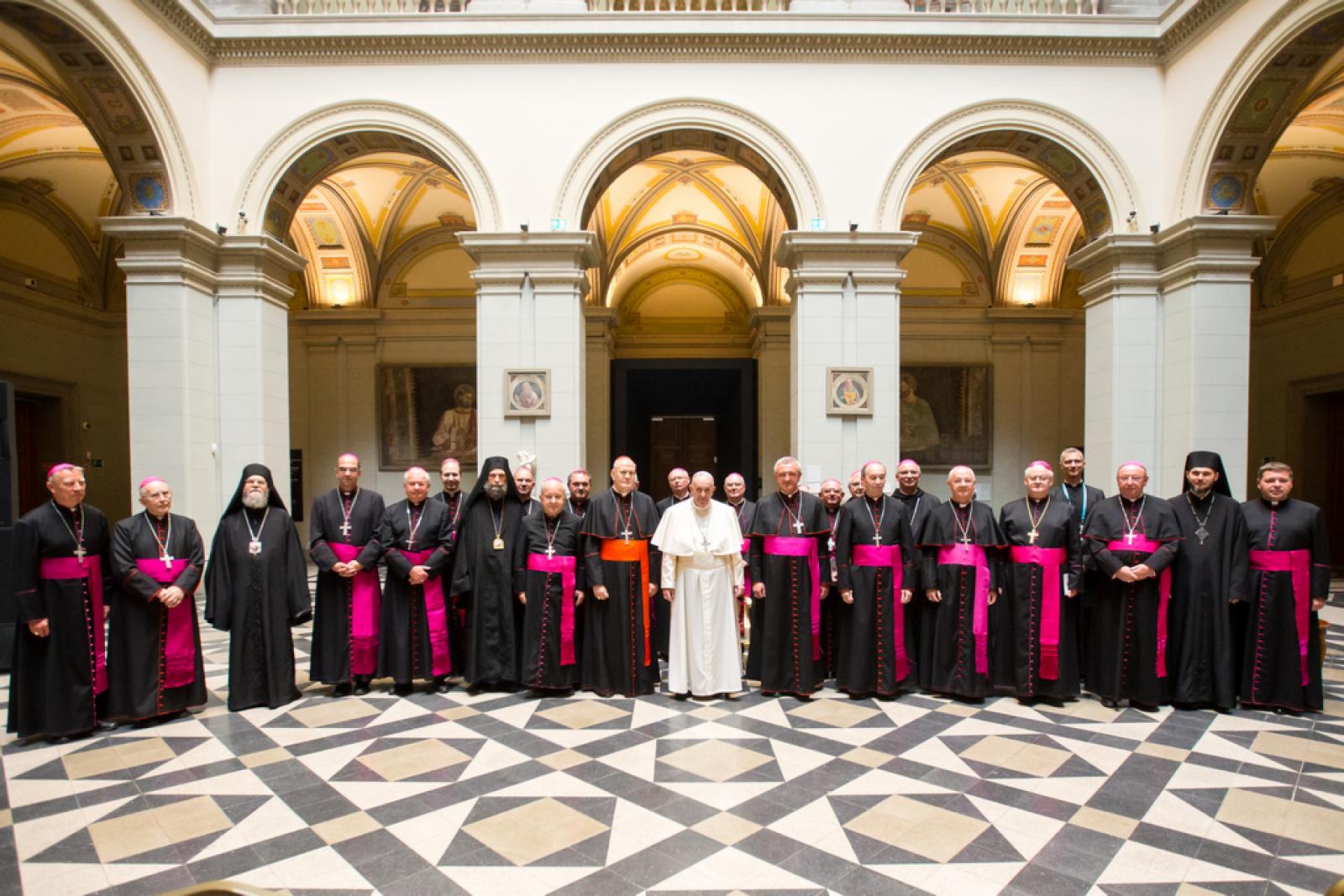 Az első: legyetek az Evangélium hirdetői. Ne feledkezzünk el róla, hogy az Egyház életének középpontjában a Krisztussal való találkozás áll. Néha, főként amikor a minket körülvevő társadalom nem tűnik túl lelkesnek keresztény üzenetünk iránt, a kísértés abban áll, hogy bezárkózzunk az intézmények és struktúrák védelmébe. A ti országotokban manapság nagy változások zajlanak, amelyek általában egész Európát érintik. A hosszú időszak után, amelynek során nem volt szabad megvallani a hitet, a szabadság elnyerésével új kihívásokkal kell szembenézni egy olyan közegben, amelyben a szekularizáció egyre erősebb és egyre kevésbé érzik át az emberek az Isten iránti szomjúságot. Emlékezzünk rá: az élő víz forrása, amely mindig folyik és mindig képes eloltani a szomjat, nem más, mint Krisztus. A struktúrák, az intézmények, az Egyház jelenléte a társadalomban csak arra valók, hogy felébresszék az Isten iránti szomjúságot az emberekben, és elvigyék számukra az Evangélium élő vizét. Ezért a püspökök feladata elsősorban: nem a struktúrák bürokratikus irányítása, nem előjogok és előnyök keresése; ezeket végezzék mások. Arra kérlek benneteket, szolgáljatok. Szolgálók legyetek nem kiskirályok. Mit kérek tőletek? Az Evangéliumért lángoló szeretetet, úgy, ahogyan van. Az örömhír tanúinak és hirdetőinek, az öröm terjesztőinek kell lennetek, atyai szívvel közel lenni a papokhoz és a szerzetesekhez, gyakorolva a meghallgatás művészetét.