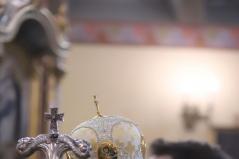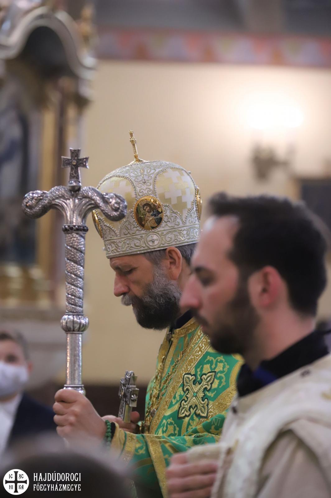 Figyeljük meg azt is, hogy a püspök jobb kezében egy háromágú gyertya van, amely a Szentháromságra utal, bal kezében pedig egy kétágú gyertya, amely Jézus Krisztus isteni és emberi természetét jelképezi. Akárcsak a görögkatolikus keresztvetésben – amelyet minden gyermek tud már –, hogy a három ujjunk összefogásával a Szentháromságot, az Atyát, a Fiút és a Szentlelket valljuk meg, a két behajlított ujjunk pedig Krisztus két természetére utal: ő Isten és ember.