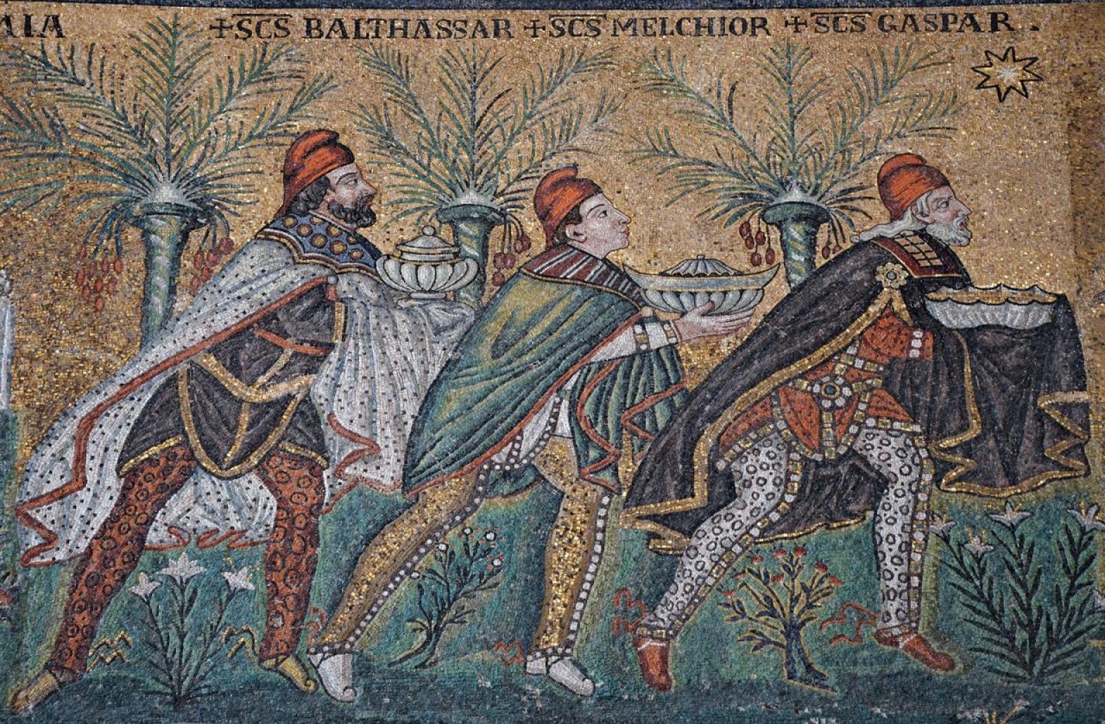 A háromkirályok imádása a betlehemi csillaggal a ravennai Sant Apollinare Nuovo bazilika mozaikján (6-7. század)
