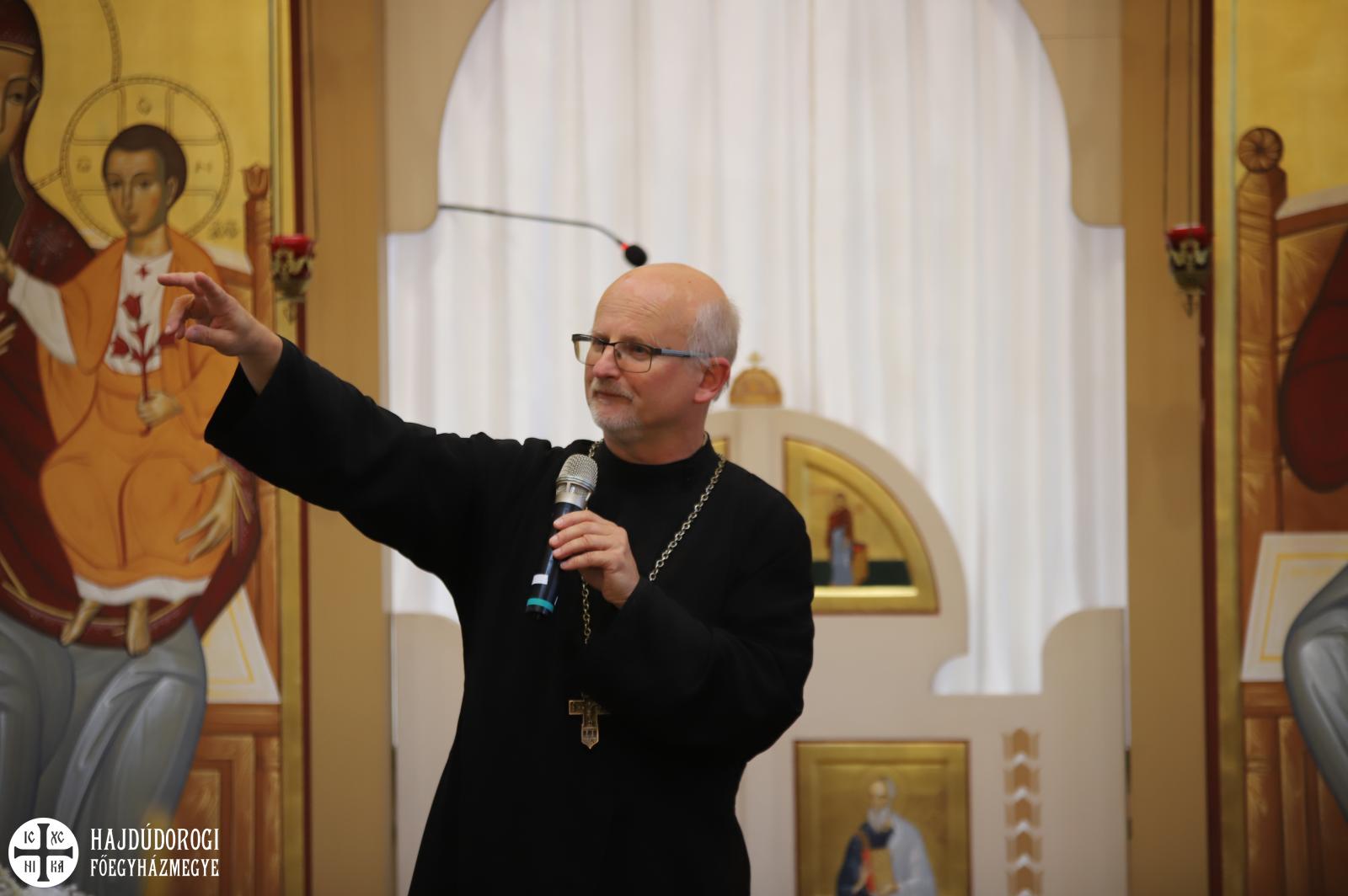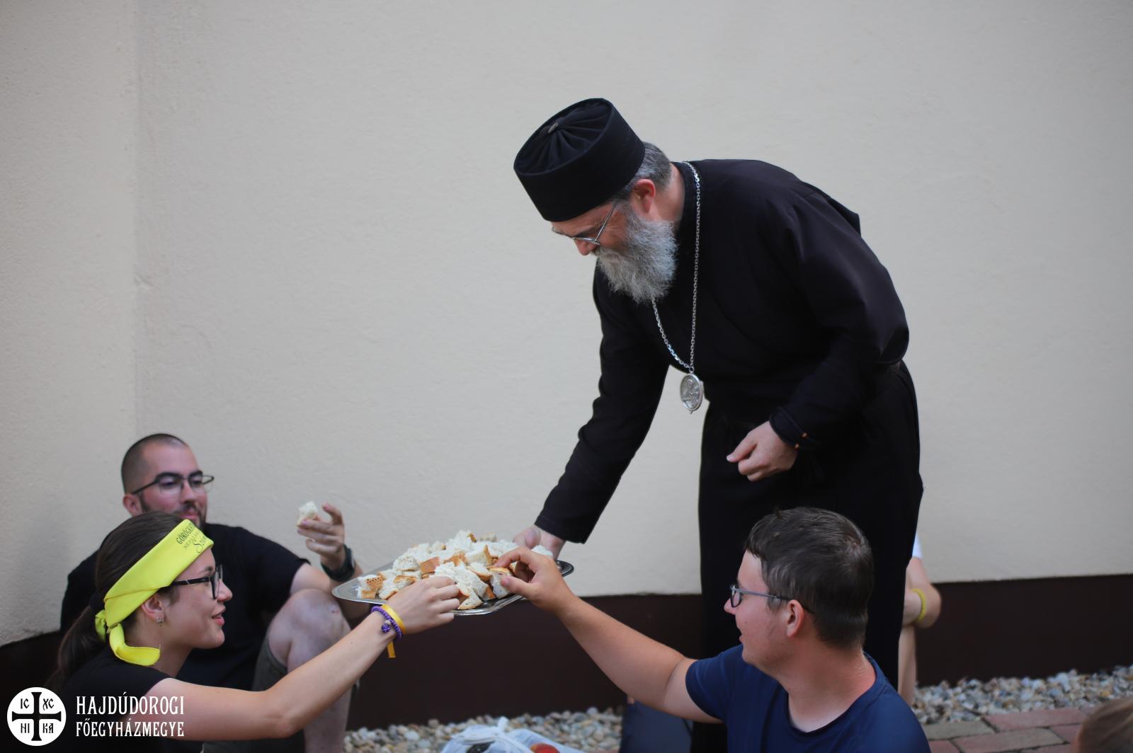A templomban László atya köszöntötte a zarándokokat, bemutatta a Szent Kereszt felmagasztalásának ünnepére keresztelt templomban látható falképeket, ikonokat, majd a templomkertben megvendégelte az elcsigázott vándorokat; Ábel püspök atya által megszegett kenyérből is jutott mindenkinek.