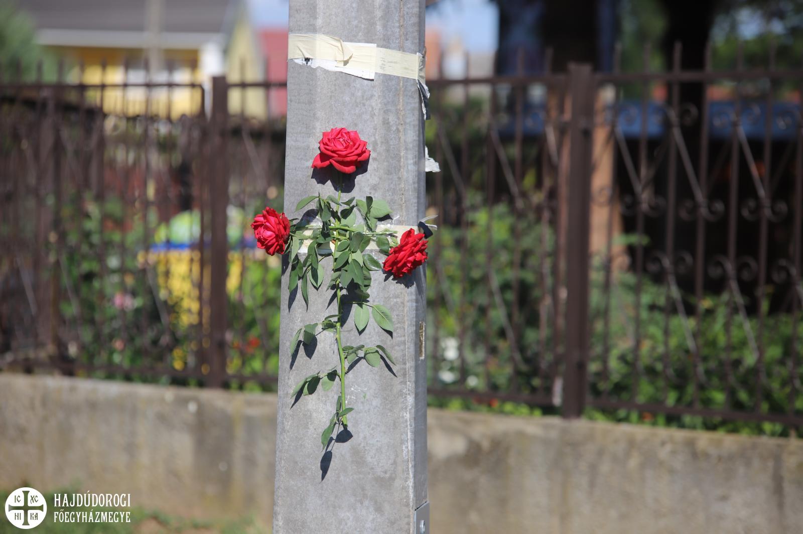 A szeretetteli fogadtatás jele volt a villanyoszlopra kereszt alakban ragasztott rózsa is. A kis útjelző kifejezte a fiatalok felé a közösség tagjainak üzenetét: tudunk rólatok, figyelünk rátok, örülünk nektek és lélekben veletek vagyunk. Ezen a helyszínen csatlakozott újra a csapathoz dr. Orosz Atanáz püspök atya.