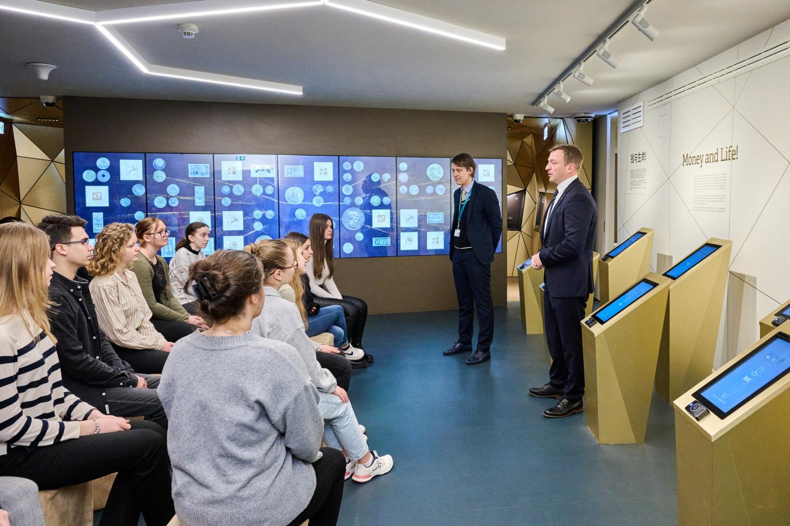 A Szent Anna Görögkatolikus Gimnázium és Technikum diákcsoportja is ellátogatott a kiállításra. A középiskola profiljához egyébként is közel álló témák nem voltak ismeretlenek a diákok előtt, mégis újdonságot és különlegességet jelentett a pénzügyi kérdések újszerű megközelítése, valamint a rendhagyó tárlatvezetés. A kiállítás élményútjára ugyanis Novák Katalin köztársasági elnök férje, Veres István is csatlakozott a diákokhoz. A Magyar Nemzeti Bank pénz- és devizapiaci igazgatója a gyerekekkel közösen próbálta ki a tárlat interaktív felületeit, bekapcsolódott a pénz funkcióit megértetni hivatott játékokba, és mindeközben saját tapasztalatait is megosztotta a tanulókkal.