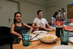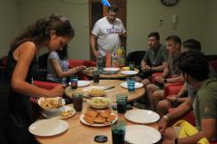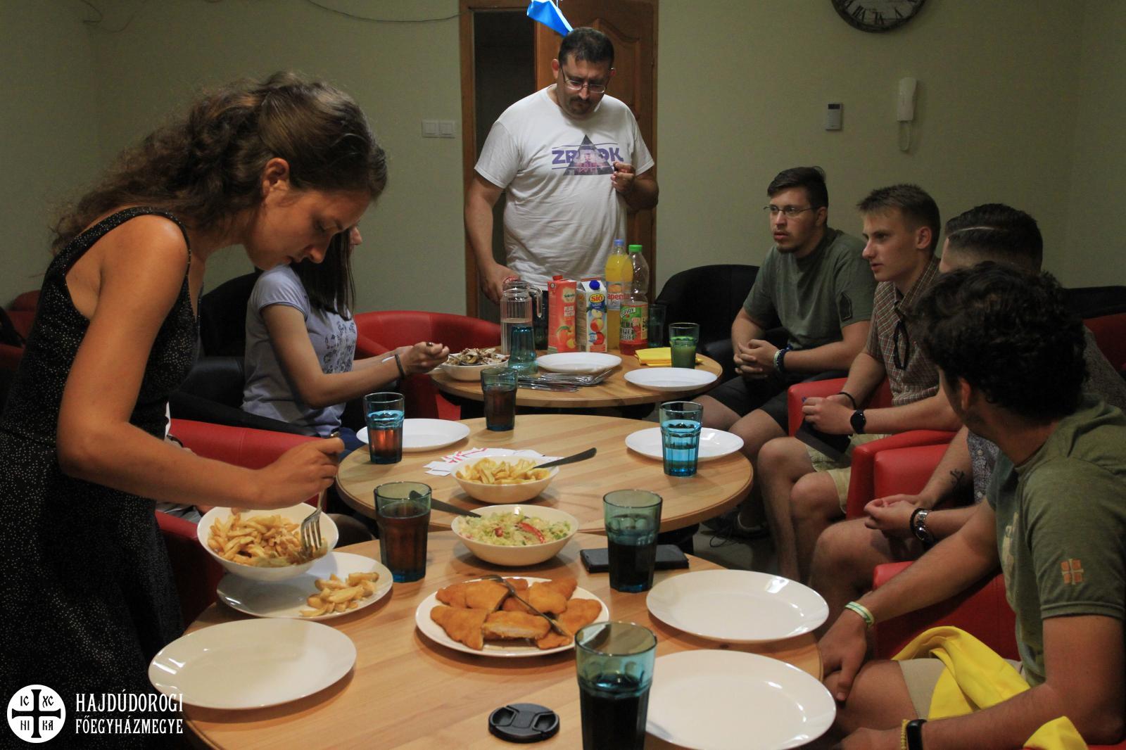 A vecsernyét, ahogy az a gyalogos zarándoklaton is lenni szokott, egy kiadós vacsora követte. Takács Gusztáv atya a Szinaxis kollégium közösségi termében elő is varázsolja a giroszt és a rántott húst, hiszen tegnap kiderült, ez a két étel hozza igazi zarándok hangulatba a fiatalokat.