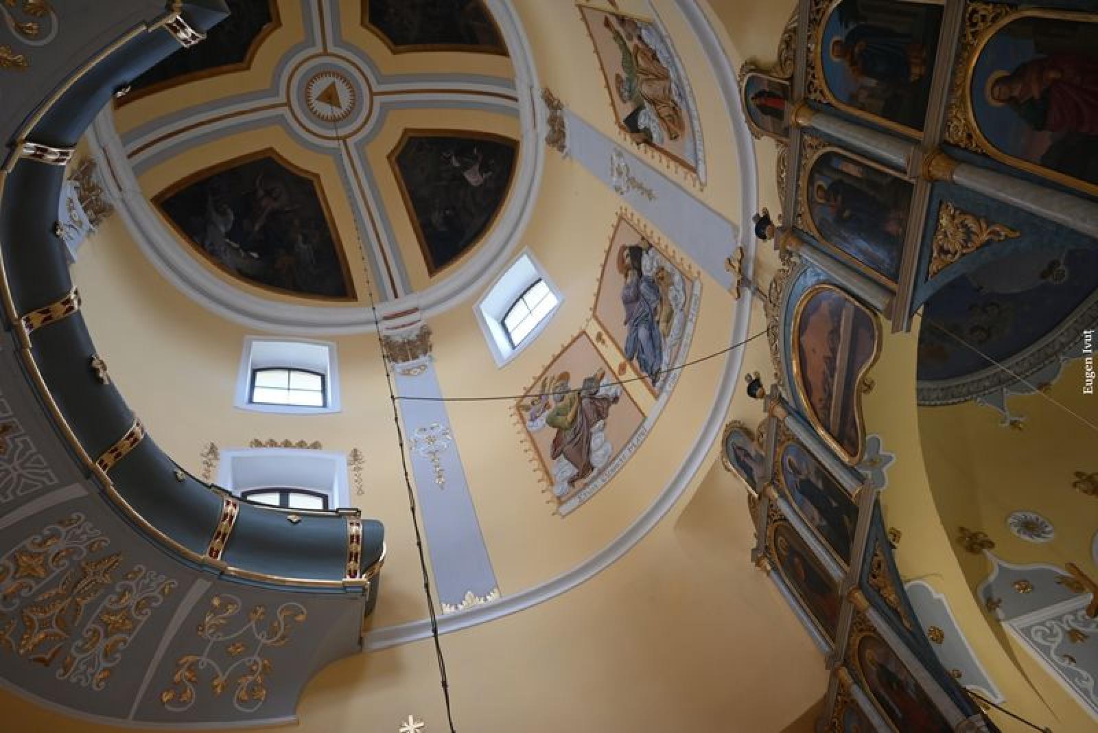 A templom XVIII. századi díszítményei közé tartoznak a nagy torony keleti falán található négy evangélista stukkóképei, melyek eredeti ószláv nyelvű feliratait a 2013-2014-es felújítás során tárták és újították fel. A görögkereszt alakú főoltár és a baldachin 1838-ból való, melynek faragványait a Munkácsi Egyházmegye szobrásza, Molnár Demeter készítette. Az ikonosztázion Bródi László és felesége Kihán Mária adományaként 1857-ben épült, a klasszicista szószéket, a rajta lévő szignó szerint pesti szobrászművészek készítették 1860-ban. Az Urunk mennybemenetelét ábrázoló, vászonra festett oltárkép is a XIX. század közepéről származik, kompozíciója megegyezik a szatmárnémeti római katolikus székesegyház oltárképével. A kupola a négy nagy ünnepet ábrázoló festményét Fenczik Kornél festette 1888-ban. Az előszentély alatt, a templom teljes szélességében egy boltíves tégla kripta is található, ahol feltehetően az ikonosztáziont adományozó házaspár teste nyugszik.