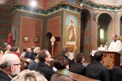 Az ünnepi liturgia szónoka Udvardy György érsek volt, aki személyes visszaemlékezéssel kezdte beszédét, hiszen Ferenc atyával ismertségük már 35 évre tekint vissza, mikor először a Központi Szemináriumban, majd Rómában, vagy az Európai Püspökök Konferenciájánál végzett szolgálata során voltak kapcsolatban, s most itt Veszprémben szolgálnak együtt. A Veszprémi Főegyházmegye főpásztora örömmel emlékezett Ferenc atya nyitottságára, együttműködési készségére, melyre mindig szívesen és hálásan emlékezik vissza.