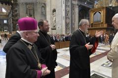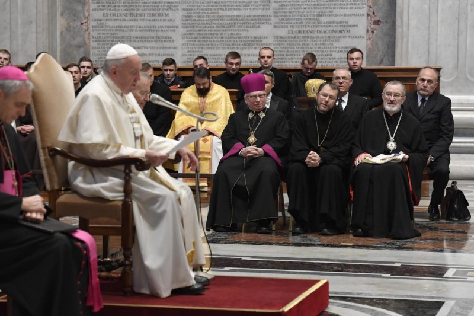 Ferenc pápa hálát adott Istennek, amiért a szovjet rezsim hosszú elnyomása után az Úr végtelen jóságában felszabadította a helyi egyházat, mely sok vértanút adott a világnak, akik életük árán vallották meg hűségüket Krisztus, a Katolikus Egyház és Róma püspöke iránt – fogalmazott a Szentatya. Közülük is kiemelkedik Boldog Romzsa Tódor vértanú püspök, aki az egyházmegye történetének egyik legsötétebb pillanatában képes volt evangéliumi bölcsességgel és bátorsággal vezetni Isten népét. Fáradhatatlanul követte Krisztus, a Jó Pásztor példáját, aki életét adta juhaiért – mondta a zarándokoknak a pápa.