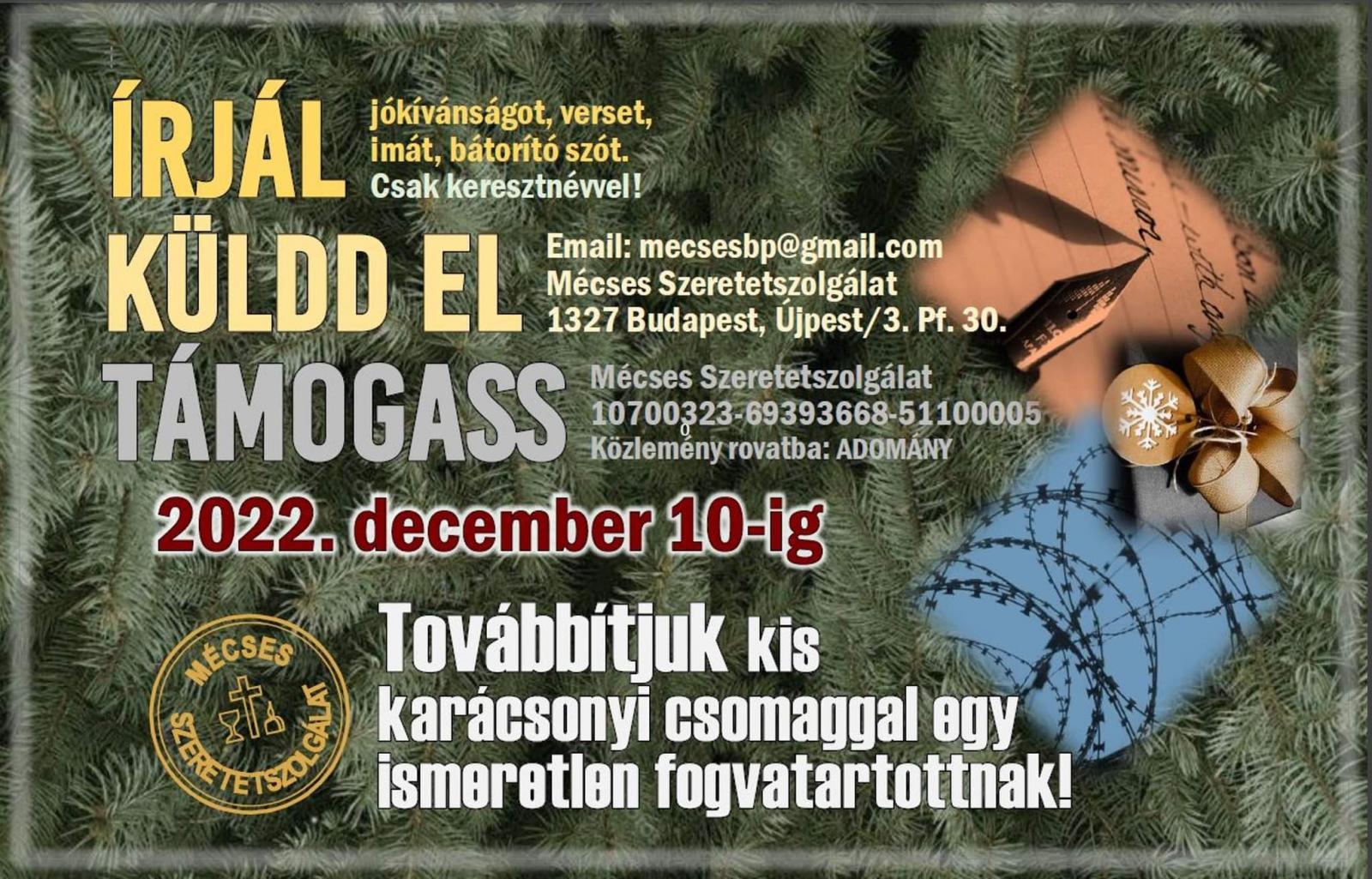 Testvérem! Ha Te is szeretnél reménysugárrá válni, küldj december 10-ig néhány baráti sort egy fogvatartottnak (csak a keresztneveddel aláírva) akár postai úton a Mécses Szeretetszolgálat levelezőszolgálatához (1327 Budapest, Pf. 30), akár e-mail-ben, a mecsesbp@gmail.com címre.