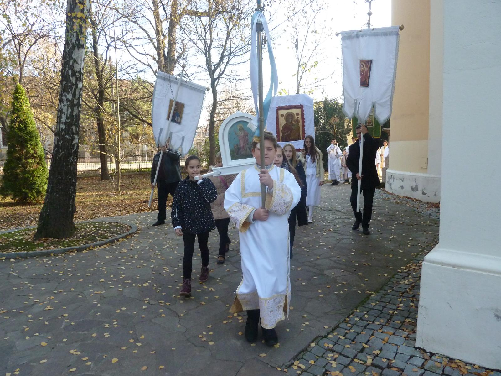 Továbbá emelte az ünnep fényét az oltárszolgálatot végzők száma is: Tóth Lóránt diakónus felkérésére az Apák Köréből néhányan gyermekeik mellett ministráltak, jelentőségteljesebbé téve az asszisztenciát kispapjainkkal együtt. A képvivő lányok egy karban helyet foglalva – később a körmeneten hordozva a Mária-képeket – fegyelmezetten, áhítattal hallgatták az elhangzó szavakat.