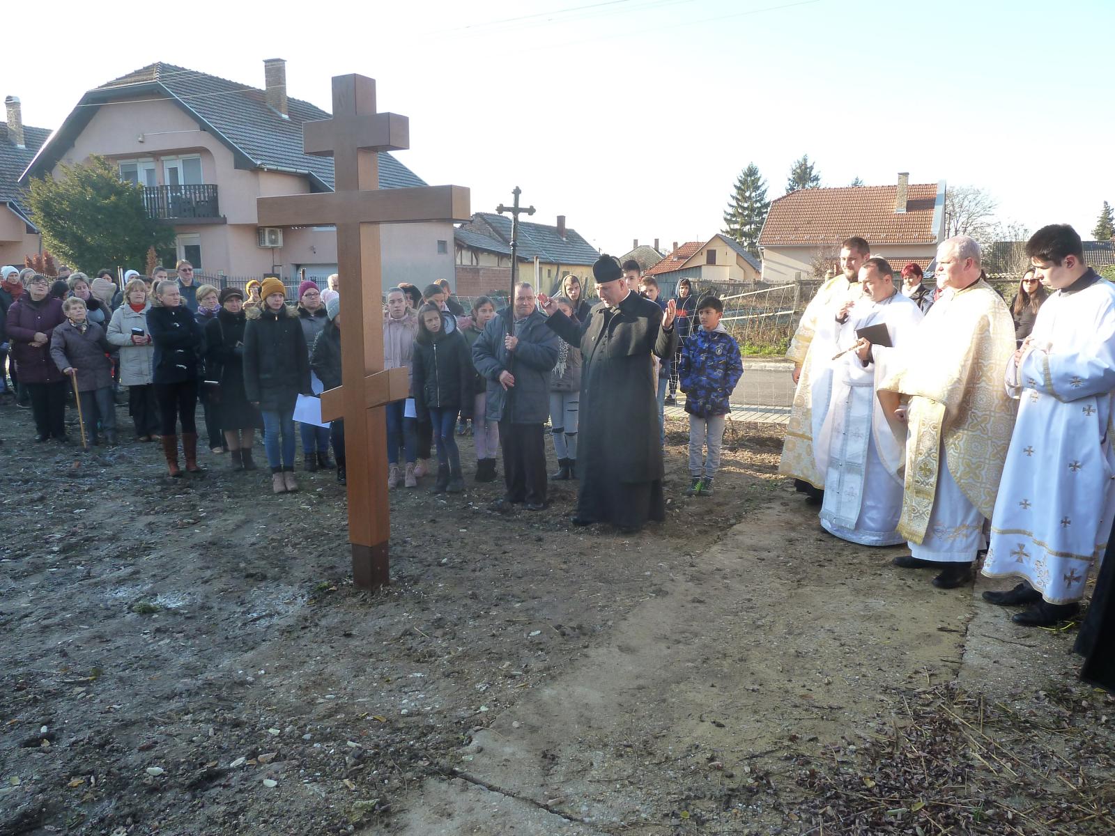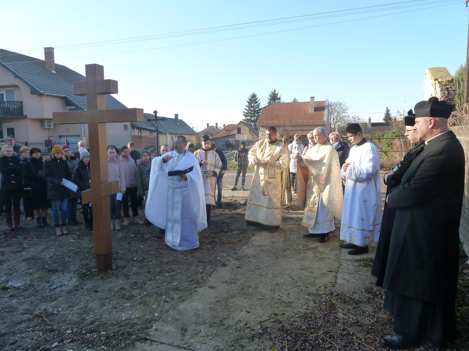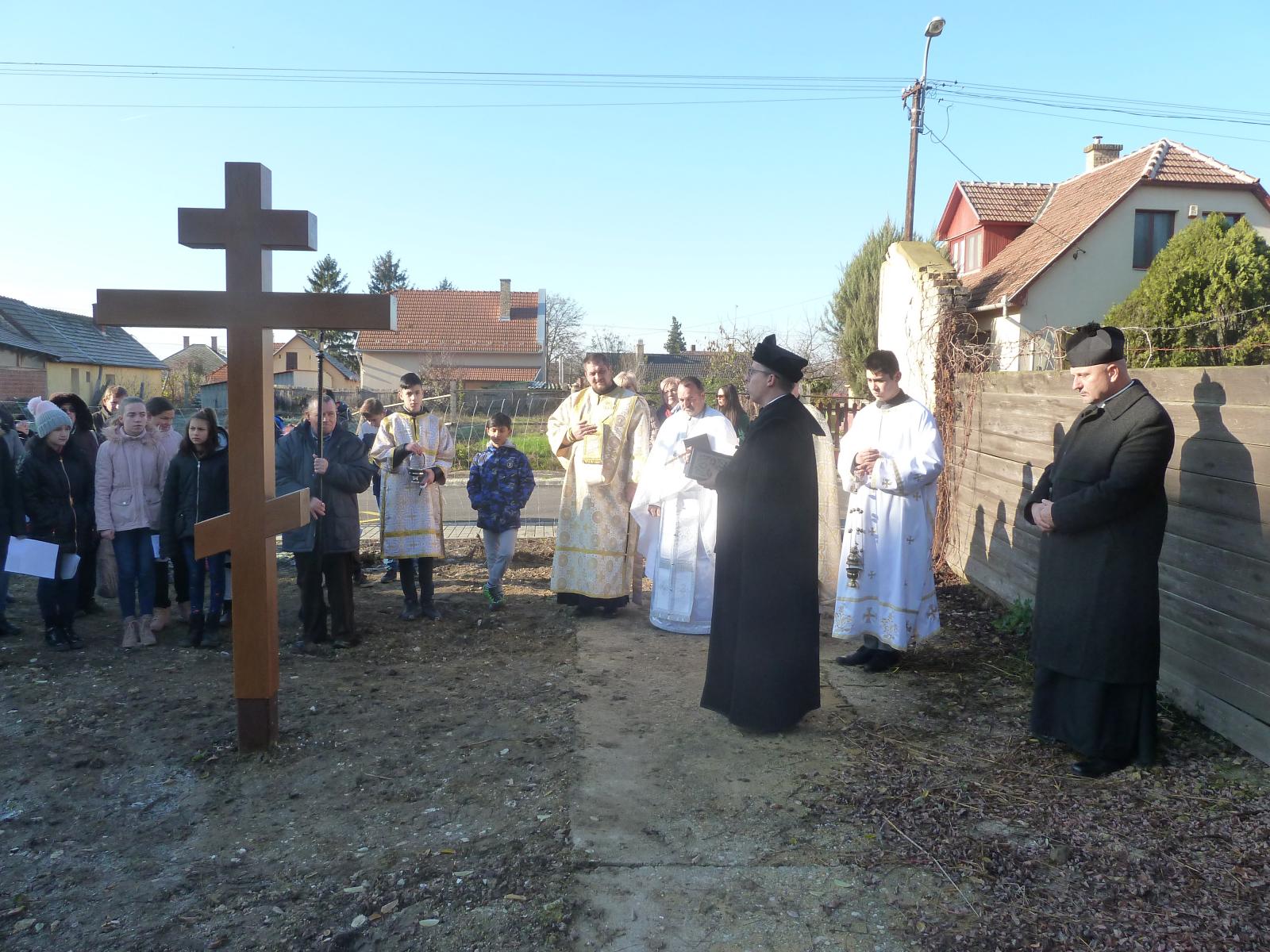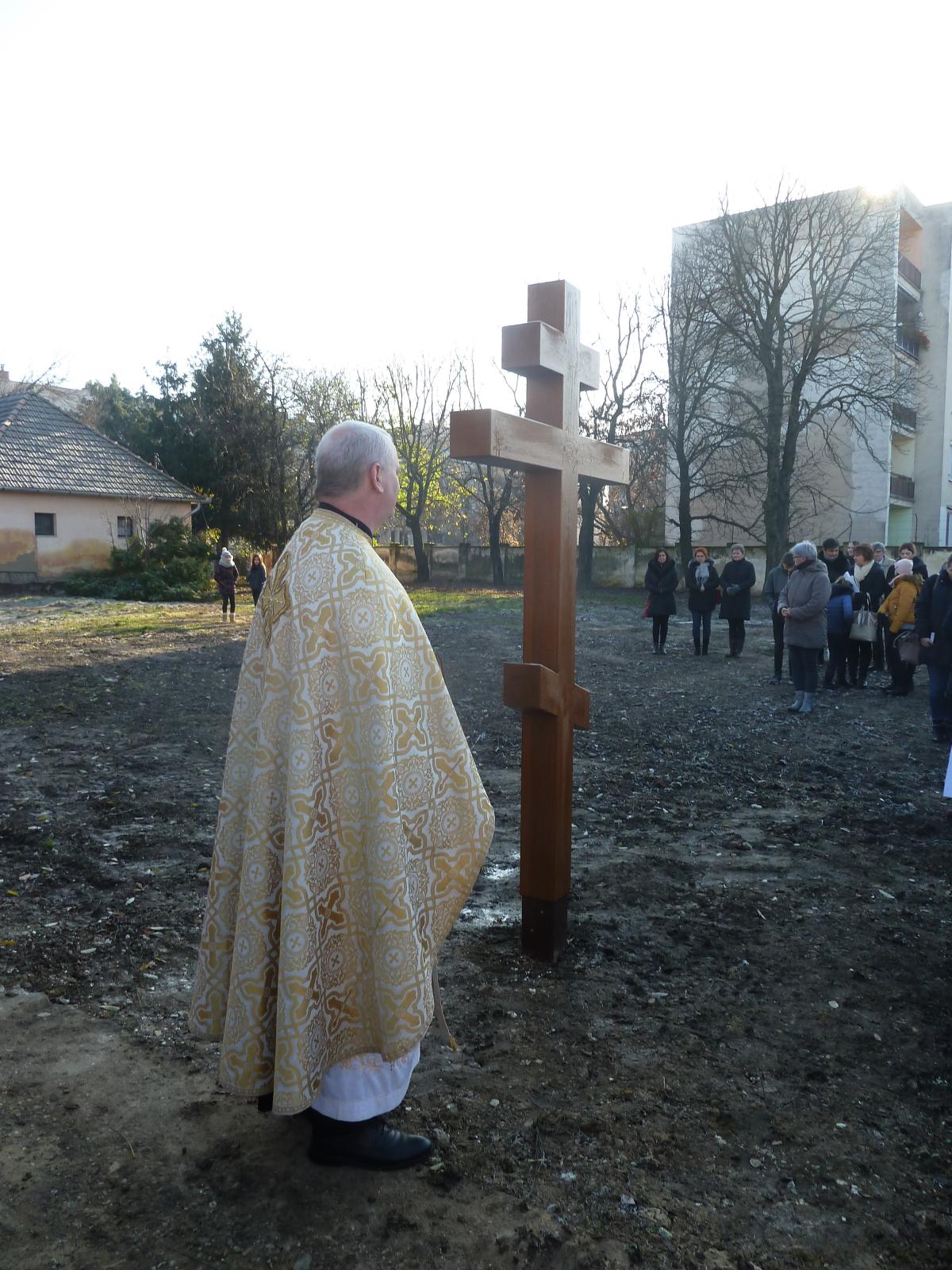 A Szent Liturgia végén átvonultunk a telekre, melyen már állt a kereszt. Szaplonczay Gergely atya megrendülten állt mellette és az enyhülő idő hatására a vízcseppek könnyekként hullottak le a keresztről a földre. Ez parókus atya számára szimbólumértékű volt.
