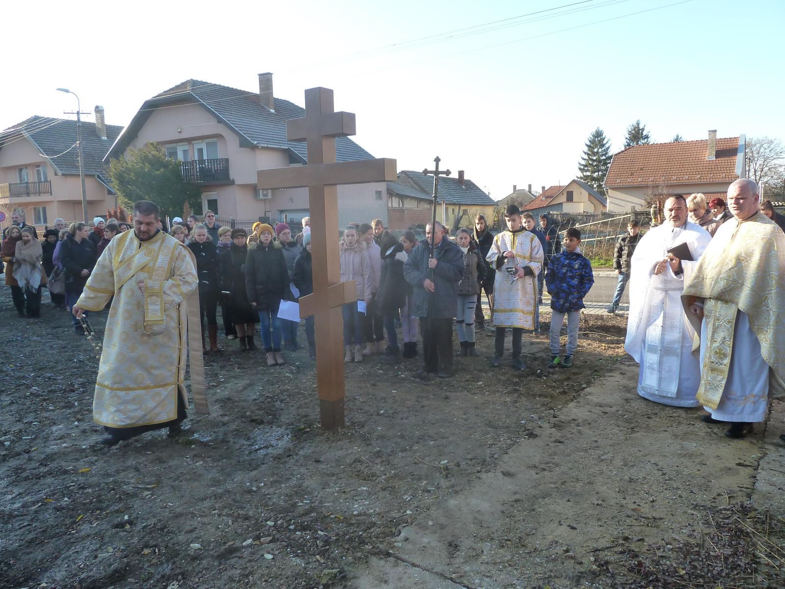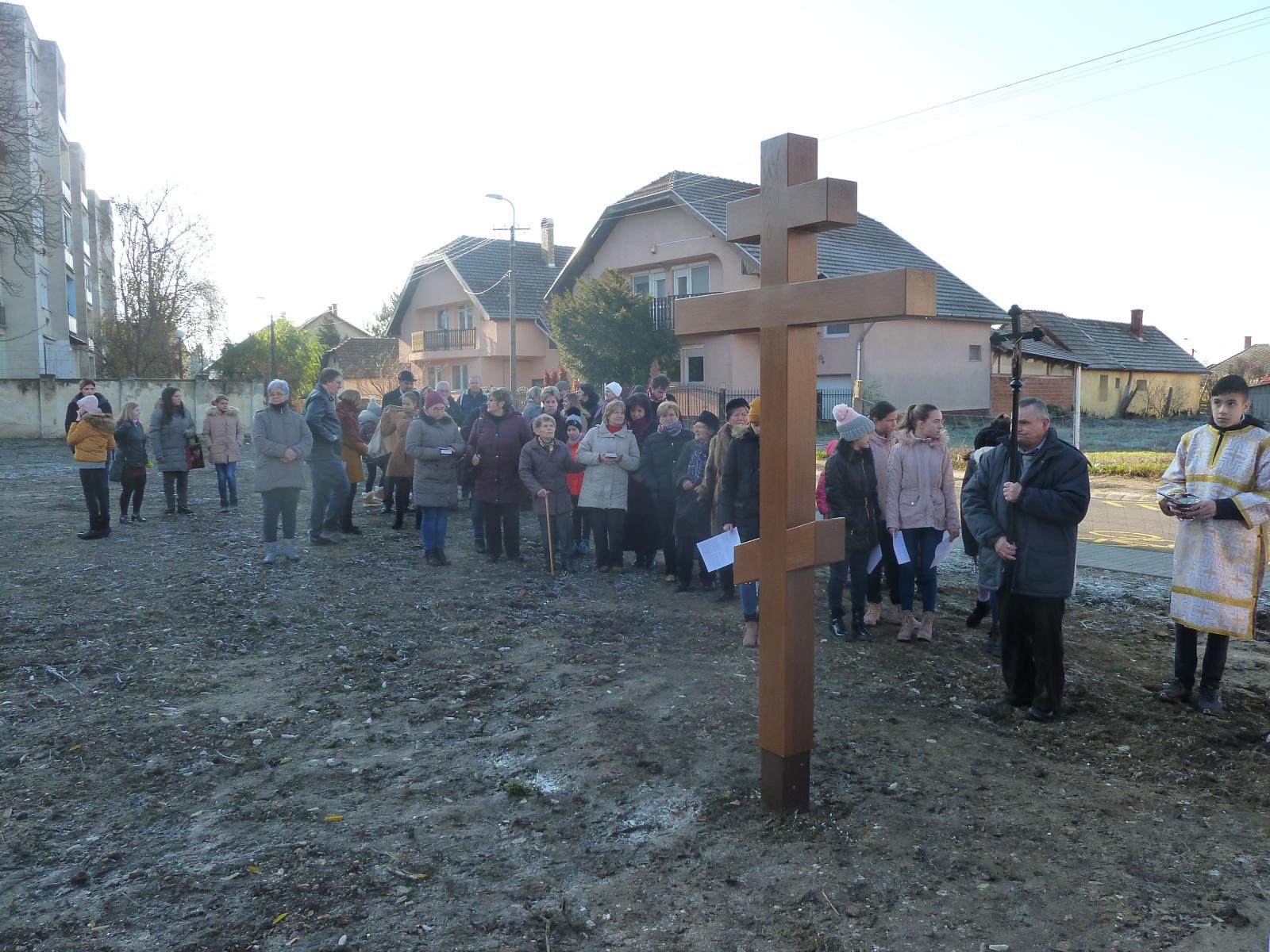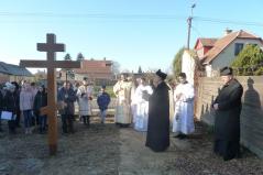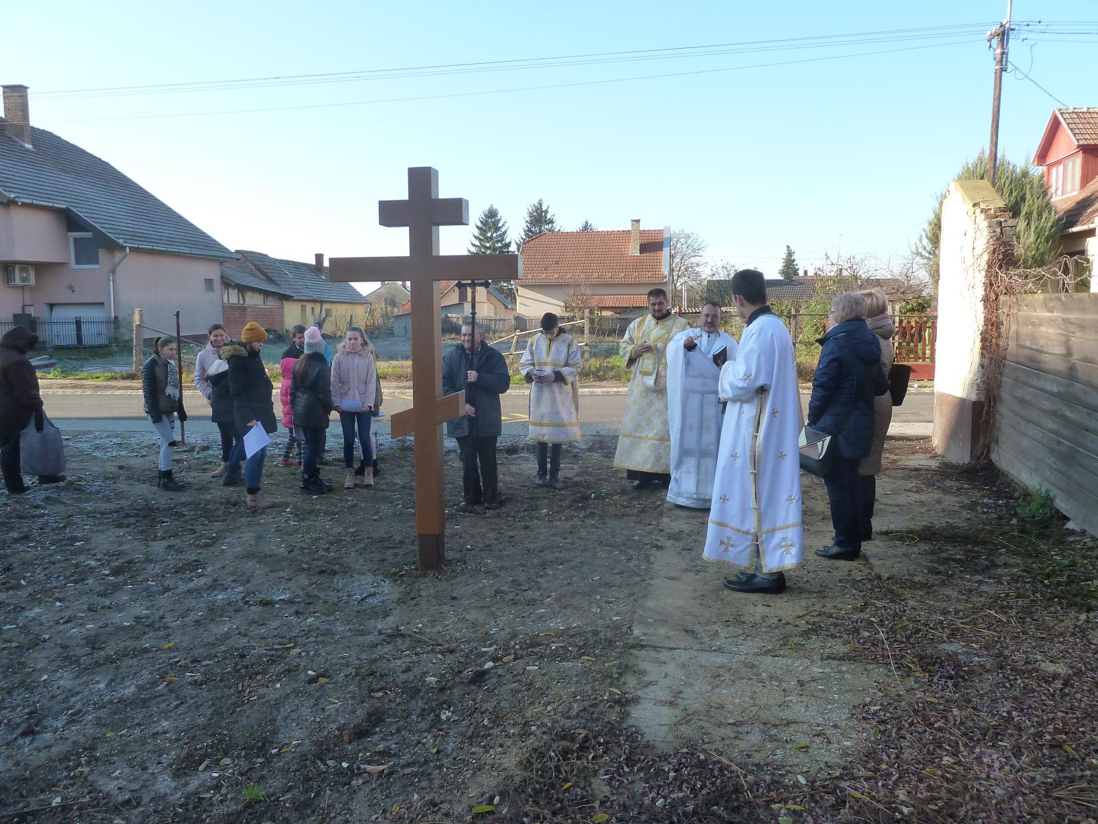 A Szent Liturgia végén átvonultunk a telekre, melyen már állt a kereszt. Szaplonczay Gergely atya megrendülten állt mellette és az enyhülő idő hatására a vízcseppek könnyekként hullottak le a keresztről a földre. Ez parókus atya számára szimbólumértékű volt.