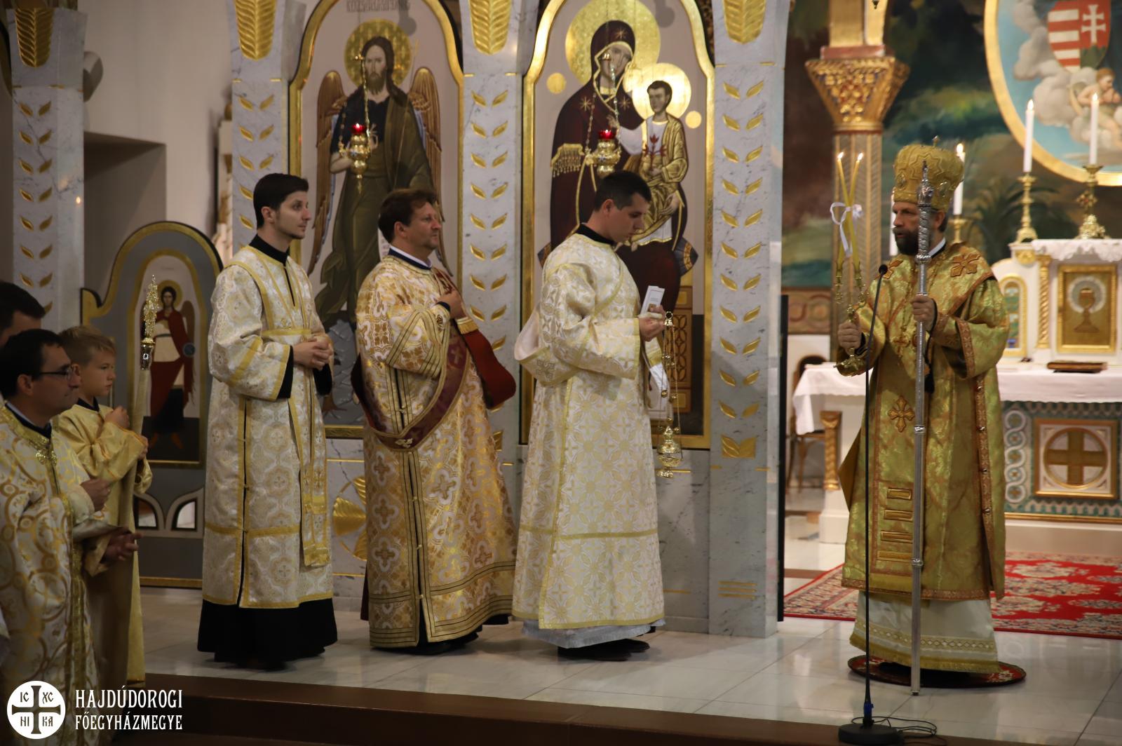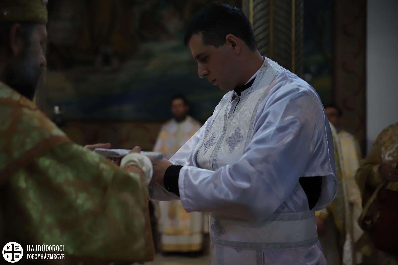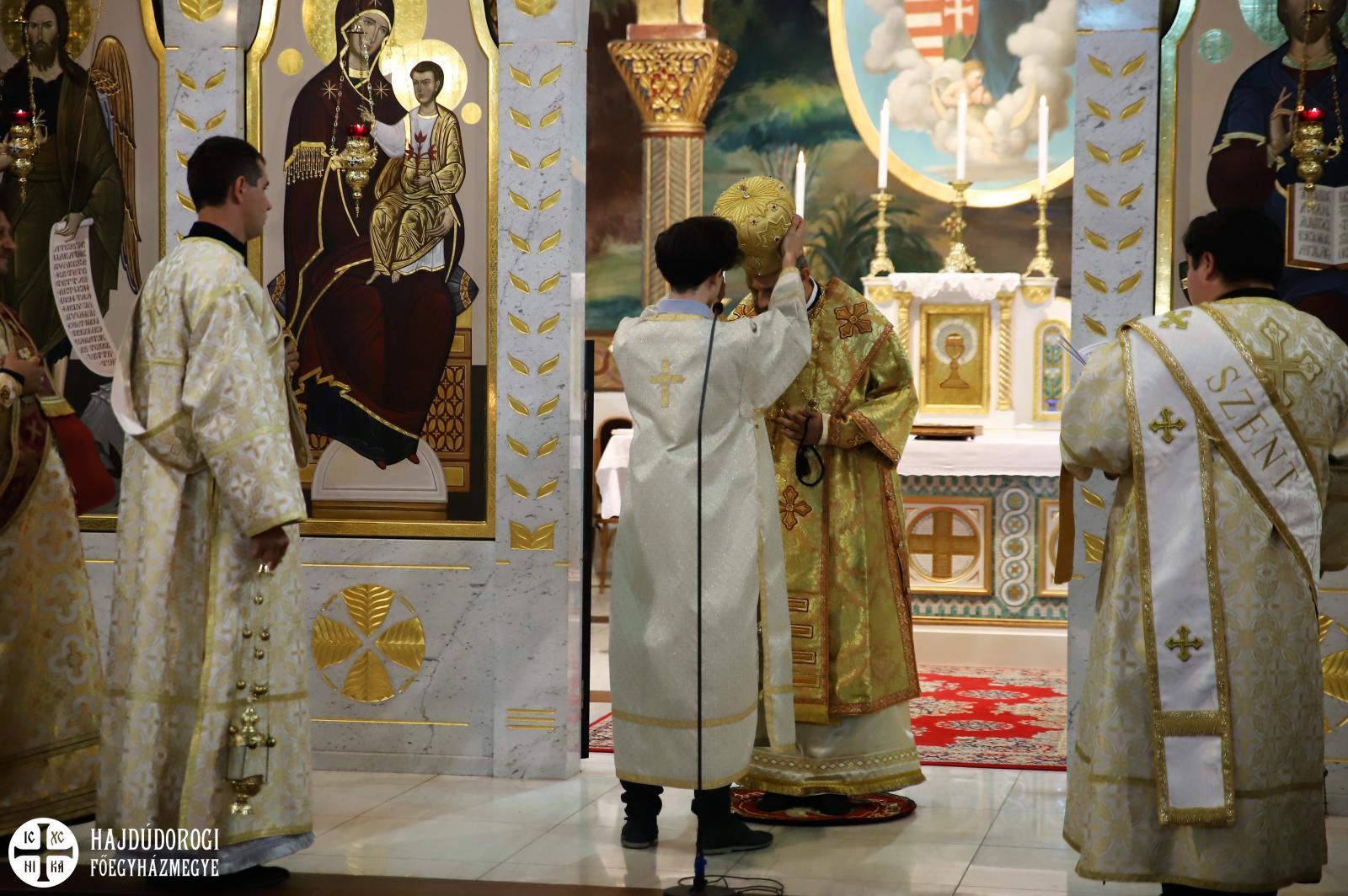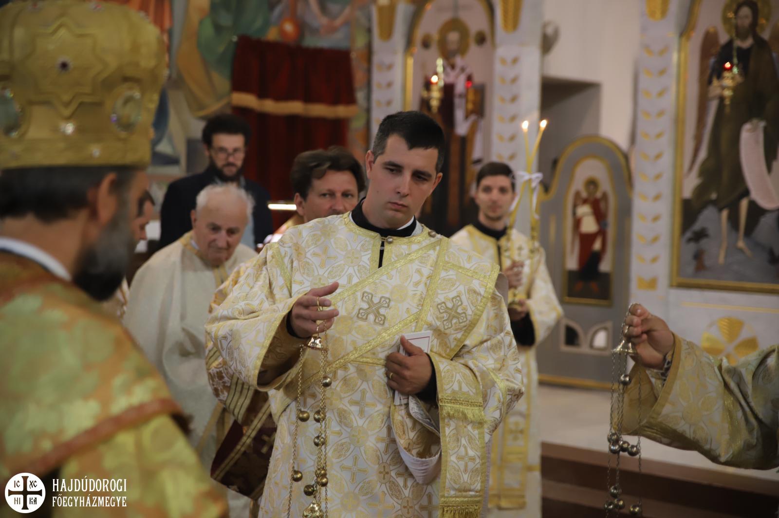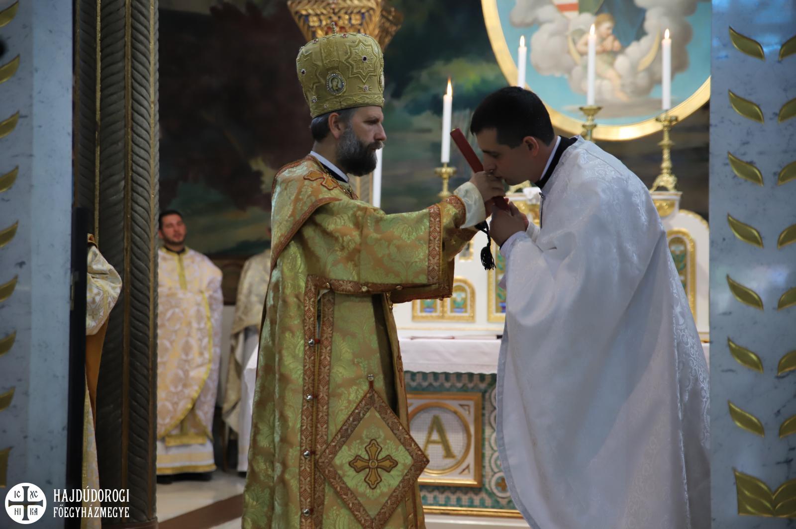 A Szent Liturgia elején érsek atya nem a sekrestyében, hanem az ikonosztázion előtt öltötte magára a püspöki jelvényeket, ezzel is jelezve, hogy ünnepi szertartásra gyűltek össze a hívők. Ennek részeként szentelték a Hajdúdorogi Főegyházmegye áldozópapjává Tatai Zoltánt. Az ő tolmácsolásában lehetett hallani Máté evangéliumából azt a fejezetet, amiben Jézus meggyógyítja a bénát.