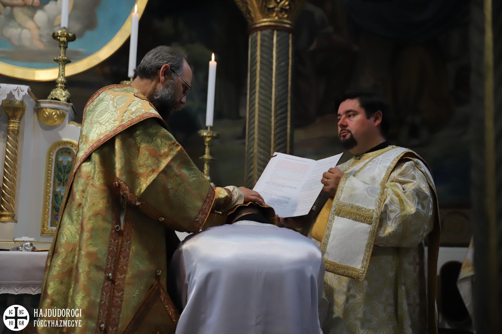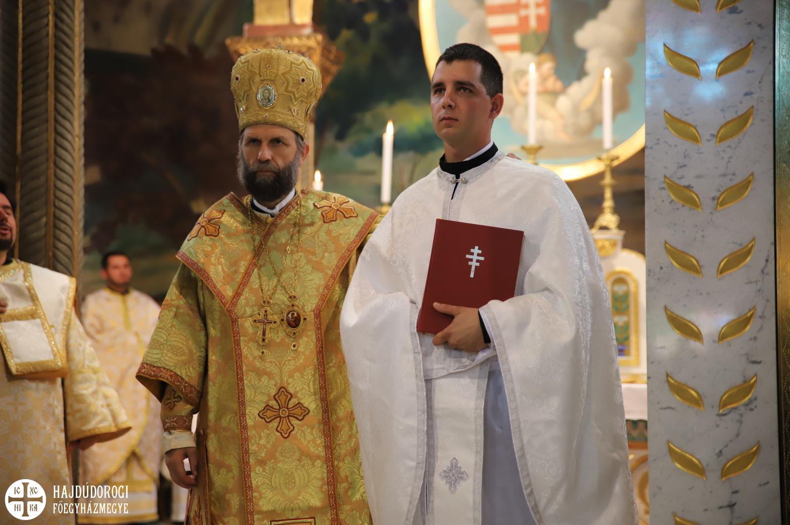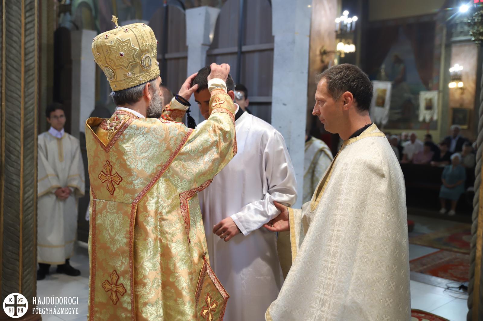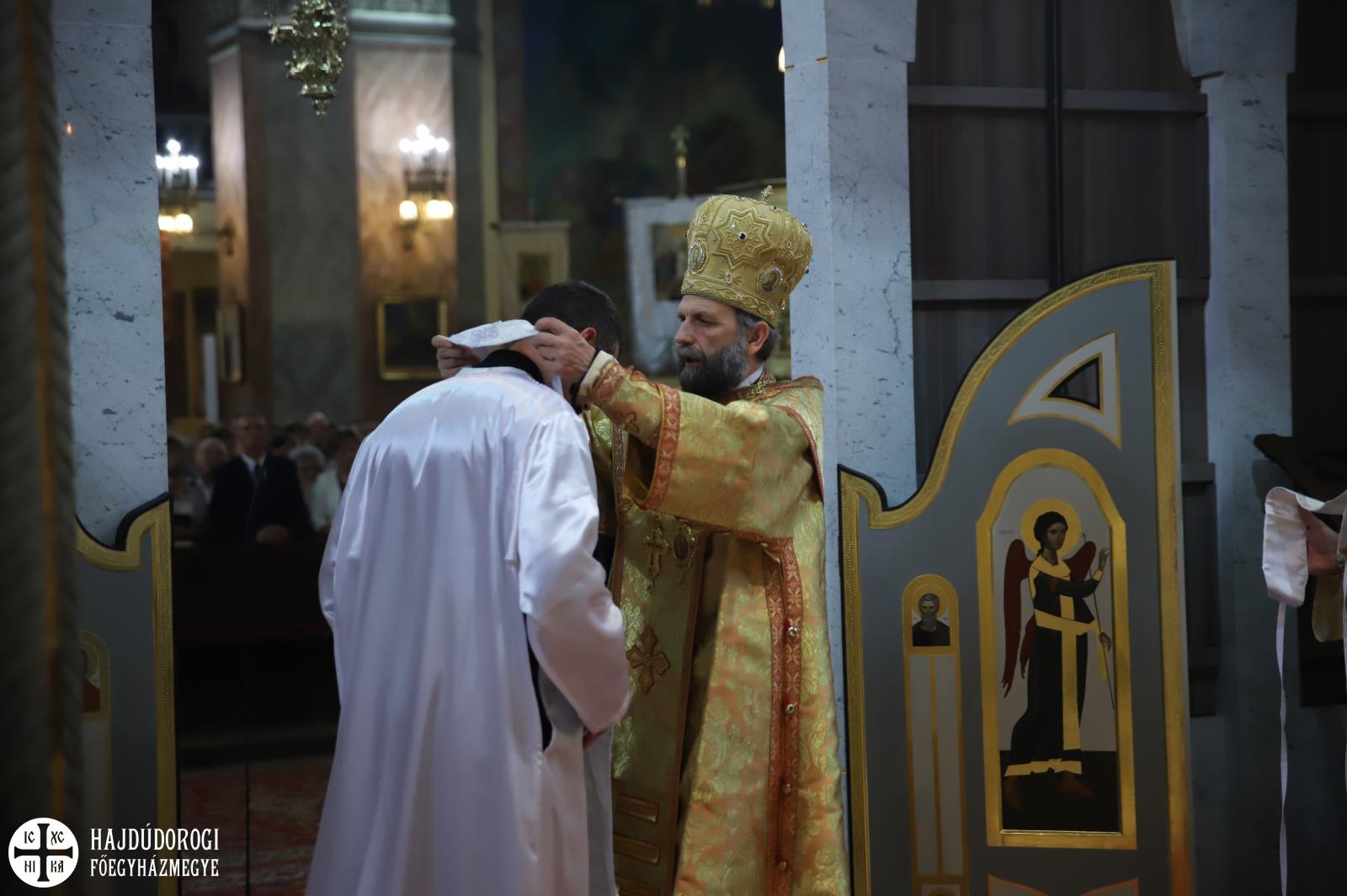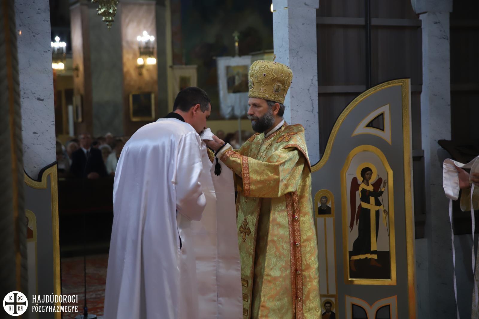A Szent Liturgia elején érsek atya nem a sekrestyében, hanem az ikonosztázion előtt öltötte magára a püspöki jelvényeket, ezzel is jelezve, hogy ünnepi szertartásra gyűltek össze a hívők. Ennek részeként szentelték a Hajdúdorogi Főegyházmegye áldozópapjává Tatai Zoltánt. Az ő tolmácsolásában lehetett hallani Máté evangéliumából azt a fejezetet, amiben Jézus meggyógyítja a bénát.