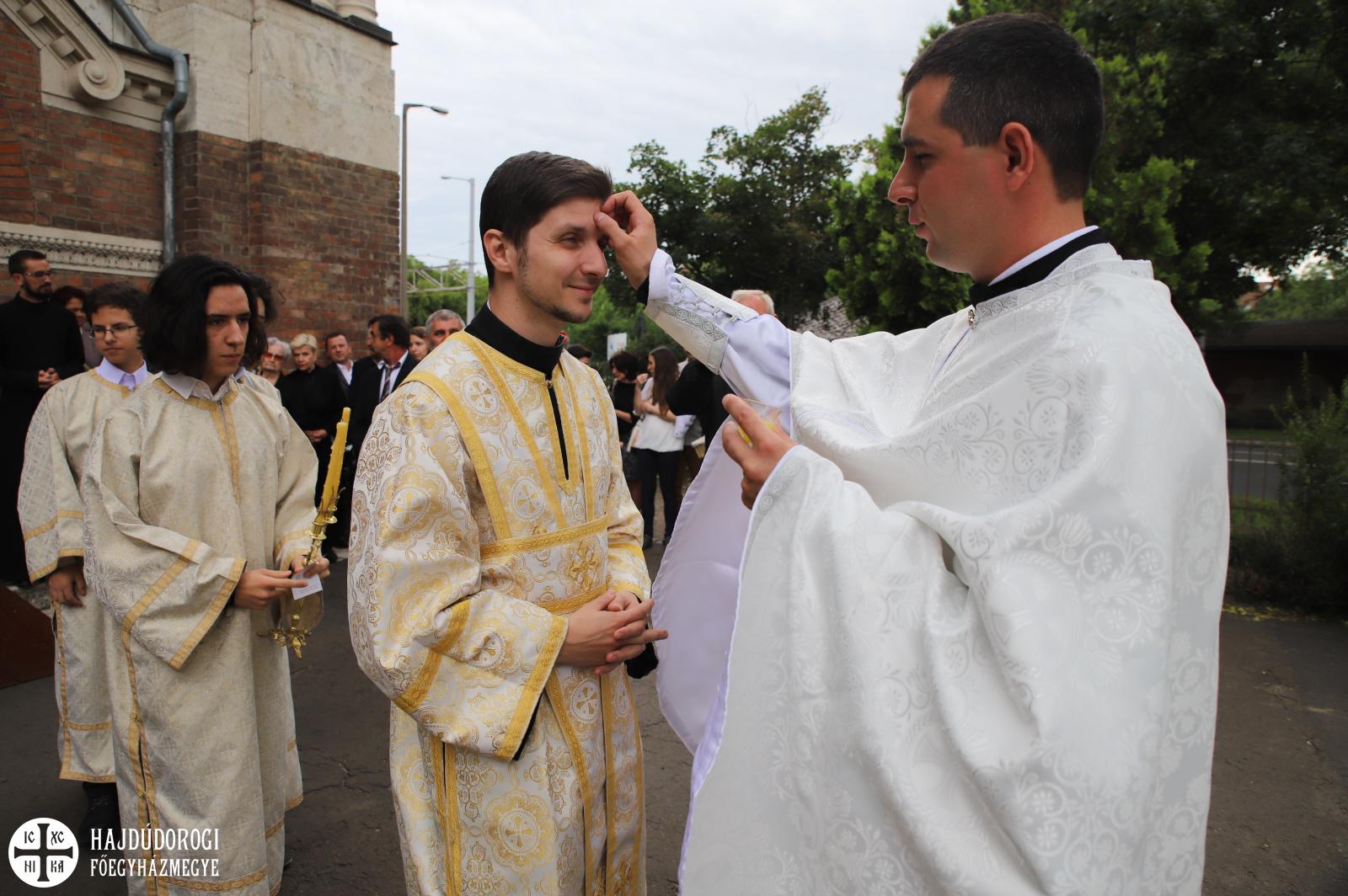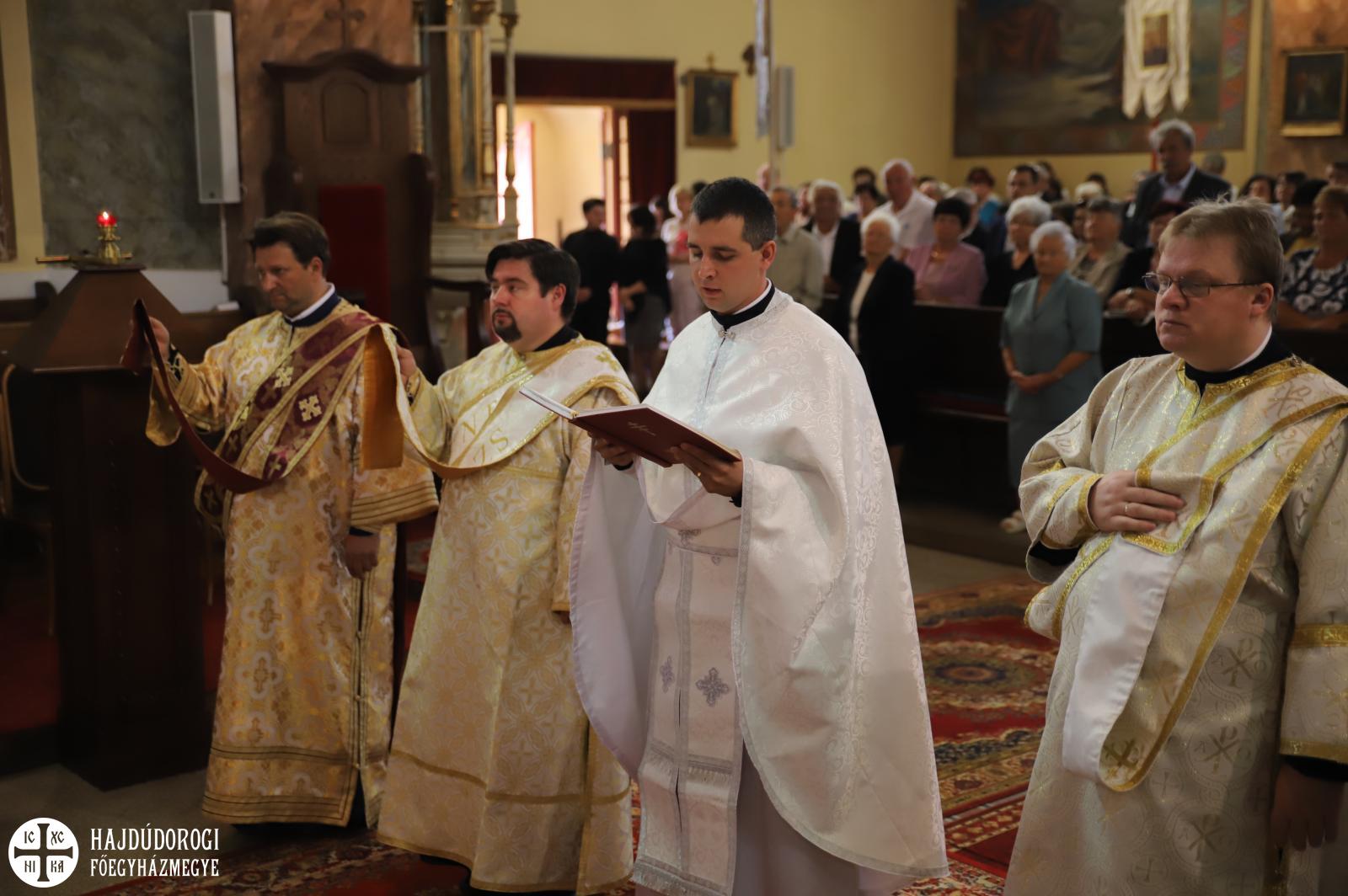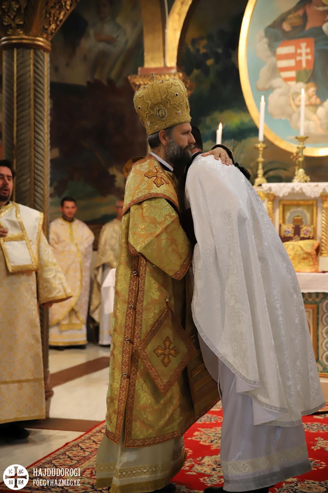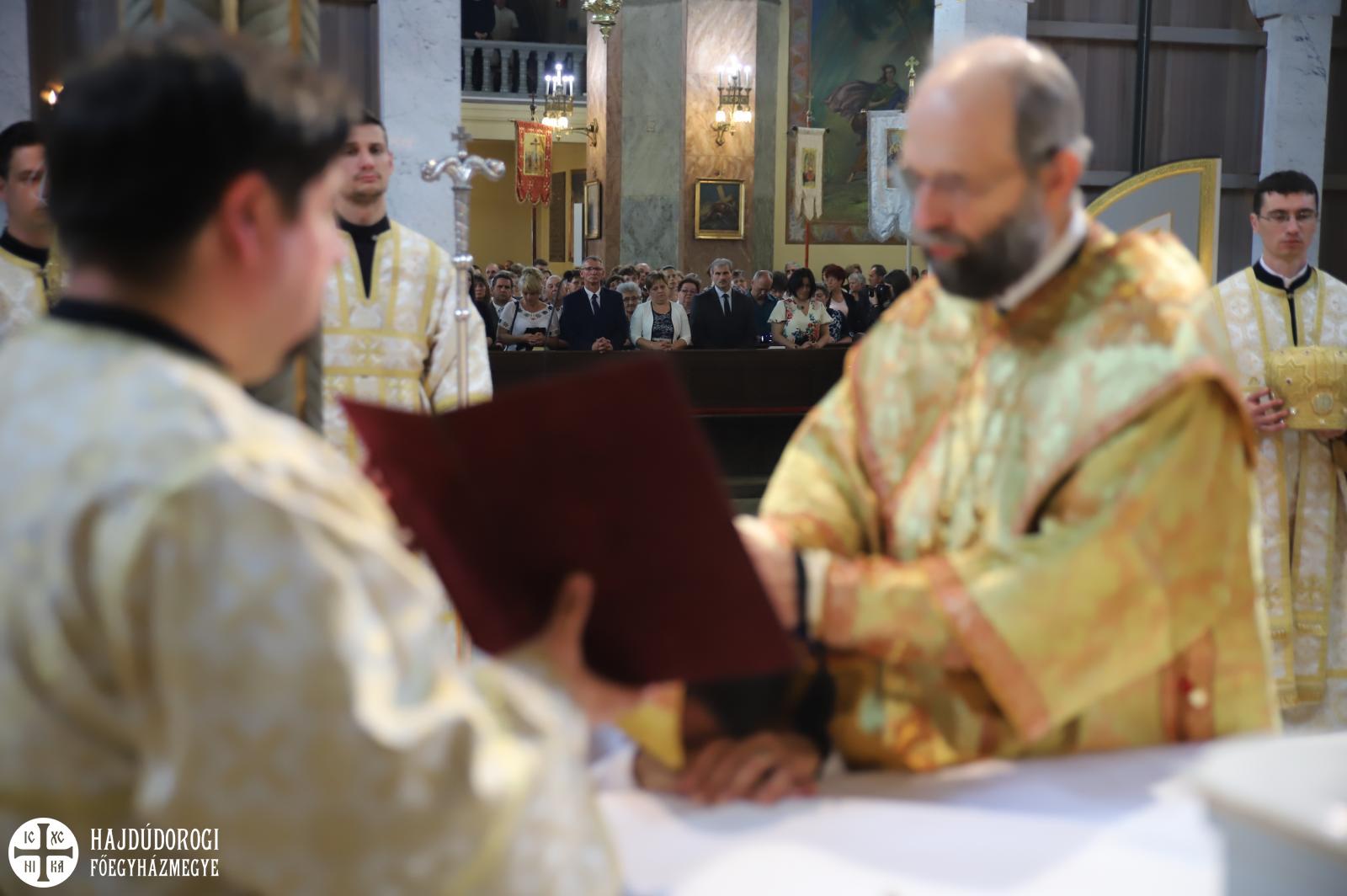 A Szent Liturgia elején érsek atya nem a sekrestyében, hanem az ikonosztázion előtt öltötte magára a püspöki jelvényeket, ezzel is jelezve, hogy ünnepi szertartásra gyűltek össze a hívők. Ennek részeként szentelték a Hajdúdorogi Főegyházmegye áldozópapjává Tatai Zoltánt. Az ő tolmácsolásában lehetett hallani Máté evangéliumából azt a fejezetet, amiben Jézus meggyógyítja a bénát.