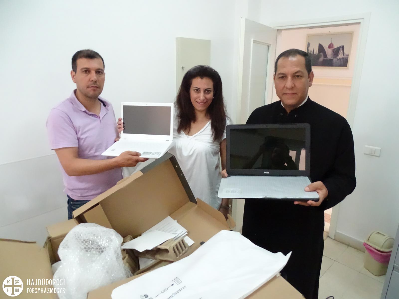Pénteken reggel, a hajnali érkezést követő reggeli után ünnepélyesen átadta a Görögkatolikus Egyház által gyűjtött adományokat és a napelemes rendszert Fülöp metropolita Bejrútban. Mivel akkor még nem volt biztos, hogy Szíriába is eljutunk, Al Dmeine al-Sarqije falu papja – aki a bejrúti melkita szeminárium rektora, – Naiim el-Gharbi atya és két falubeli fiatal tehetség vette át a tízmillió forintnyi dollárt, a számítógépeket és a napelemes rendszert. Az átadásról és átvételről hivatalos dokumentumokat írtak alá. Naiim atya elmondta: nagy megtiszteltetés és megható érzés, hogy egy távoli ország görögkatolikusai ennyi pénzt összegyűjtöttek, és ilyen hasznos ajándékokkal kedveskednek a hányattatott sorsú szíriai keresztényeknek.