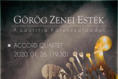 A Görög Zenei Esték harmadik évada a kamarazene virtuózaiként is emlegetett Accord Quartet koncertjével folytatódik. A négy fiatal /Mező Péter (hegedű), Veér Csongor (hegedű), Kondor Péter (mélyhegedű), Ölveti Mátyás (cselló)/ céljai közé tartozik a „modern” világ és a komolyzene összekapcsolása igényes komolyzenével, új gondolatokkal, helyszínekkel. Rendszeresen koncerteznek Magyarországon és külföldön egyaránt.