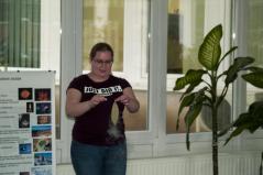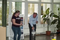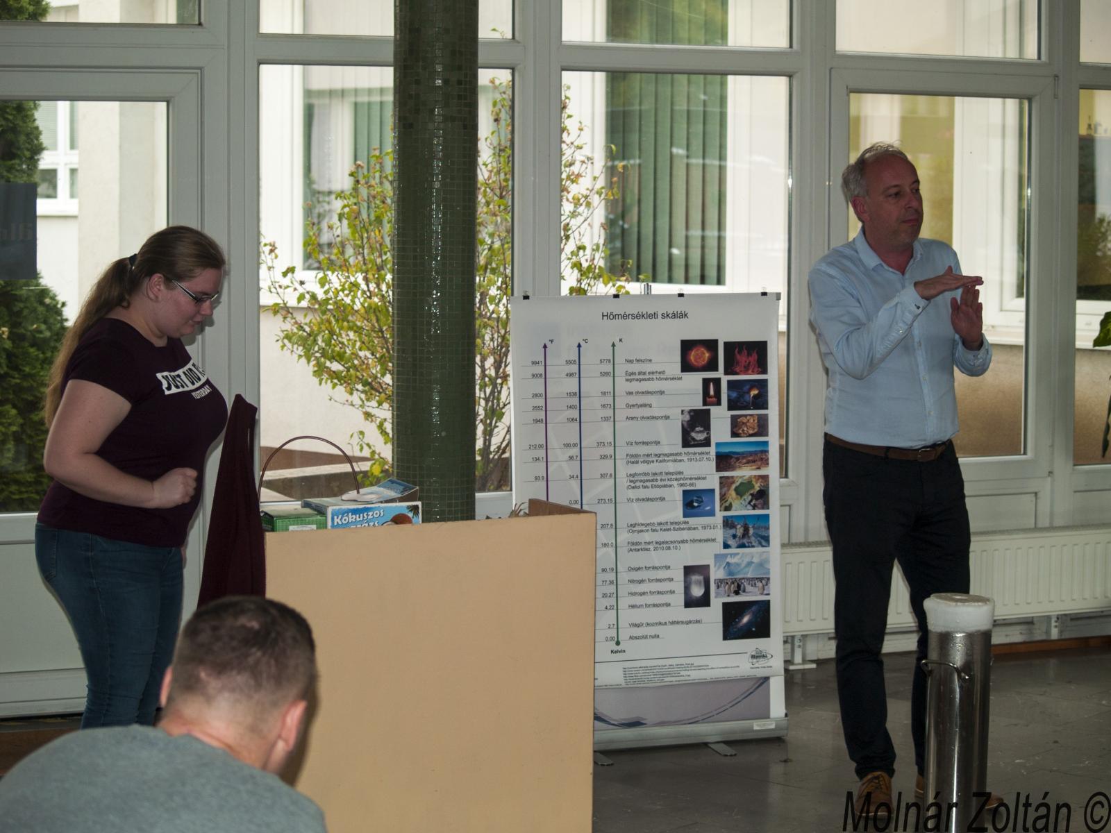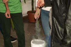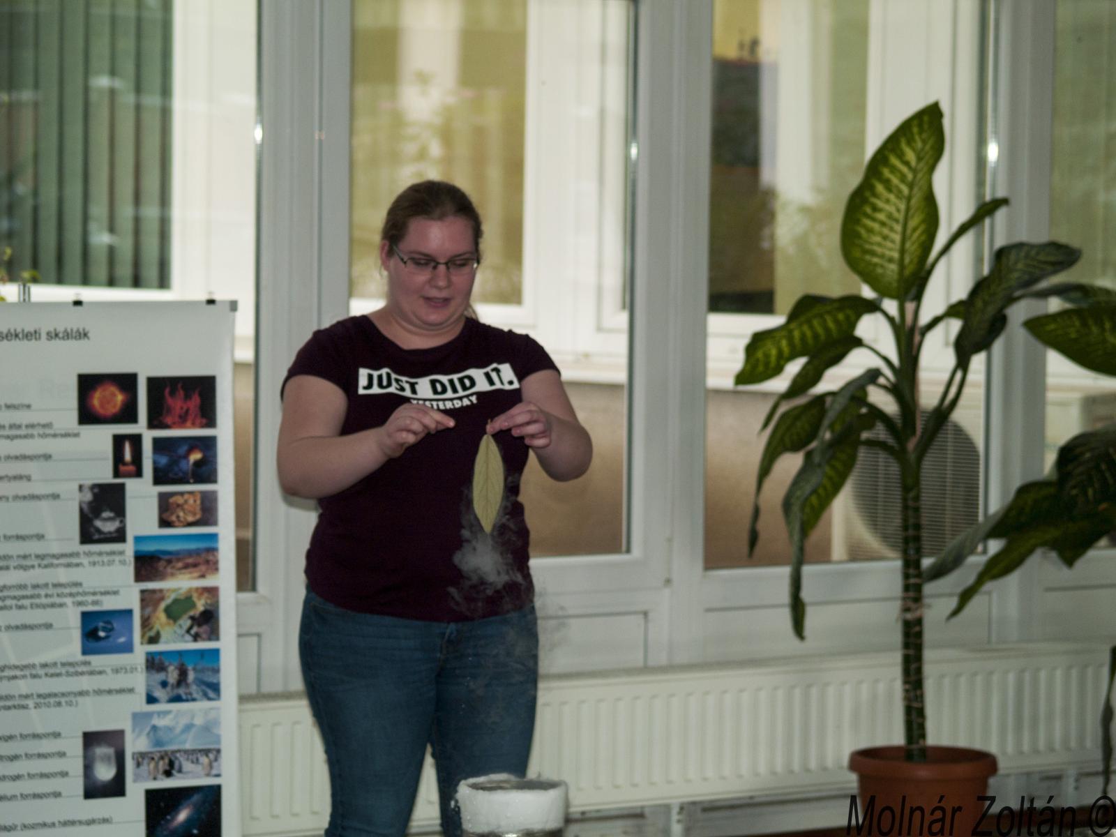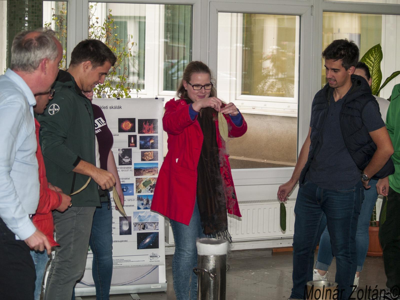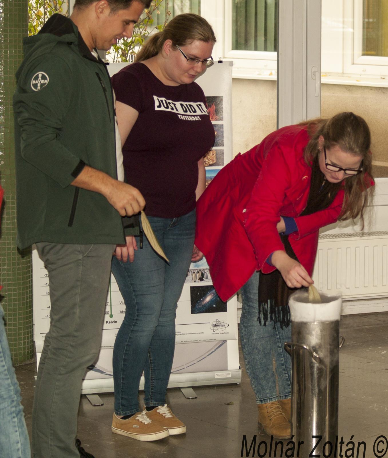 A harmadik és egyben utolsó állomása az ATOMKI túrának a hideg fizikai kísérletek helyszíne volt. Itt Muri Eszter és Nándori István mutattak be számos érdekes és izgalmas kísérletet folyékony nitrogén segítségével. Az interaktív program nagyon elnyerte a hallgatók tetszését. Maguk is részt vehettek az egyes kísérletekben, és ízlelhették az ezek során gyártott finomságokat. Ilyen volt a folyékony nitrogénnel fagyasztott fagylalt is, amelyért nagy köszönet jár Eszternek.