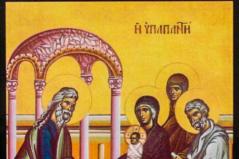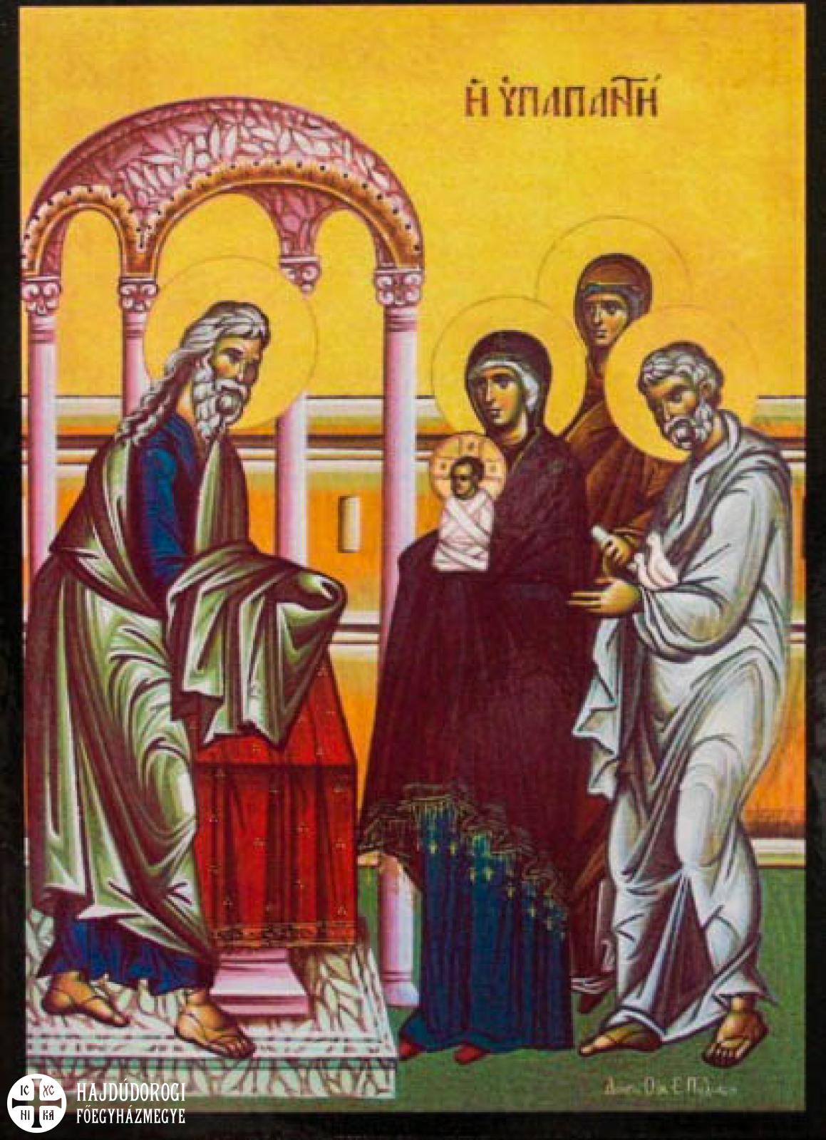 A gyermek Jézust születése után a 40. napon szülei elvitték Jeruzsálembe, hogy Mózes törvénye szerint bemutassák őt a templomban, a törvény által megszabott áldozatbemutatással együtt. Élt akkor Jeruzsálemben egy Simeon nevű aggastyán, aki ígéretet kapott a Szentlélektől, hogy nem hal meg addig, míg meg nem látja az Üdvözítőt. A Lélektől indíttatva épp akkor ment föl a templomba, amikor a kisdedet is bemutatásra vitték. Simeon ekkor karjaiba vette a Gyermeket, s elimádkozta a Szent Lukács evangéliumában is szereplő énekét: „Most bocsásd el, Uram, szolgádat...” (Lk 2,29-32).