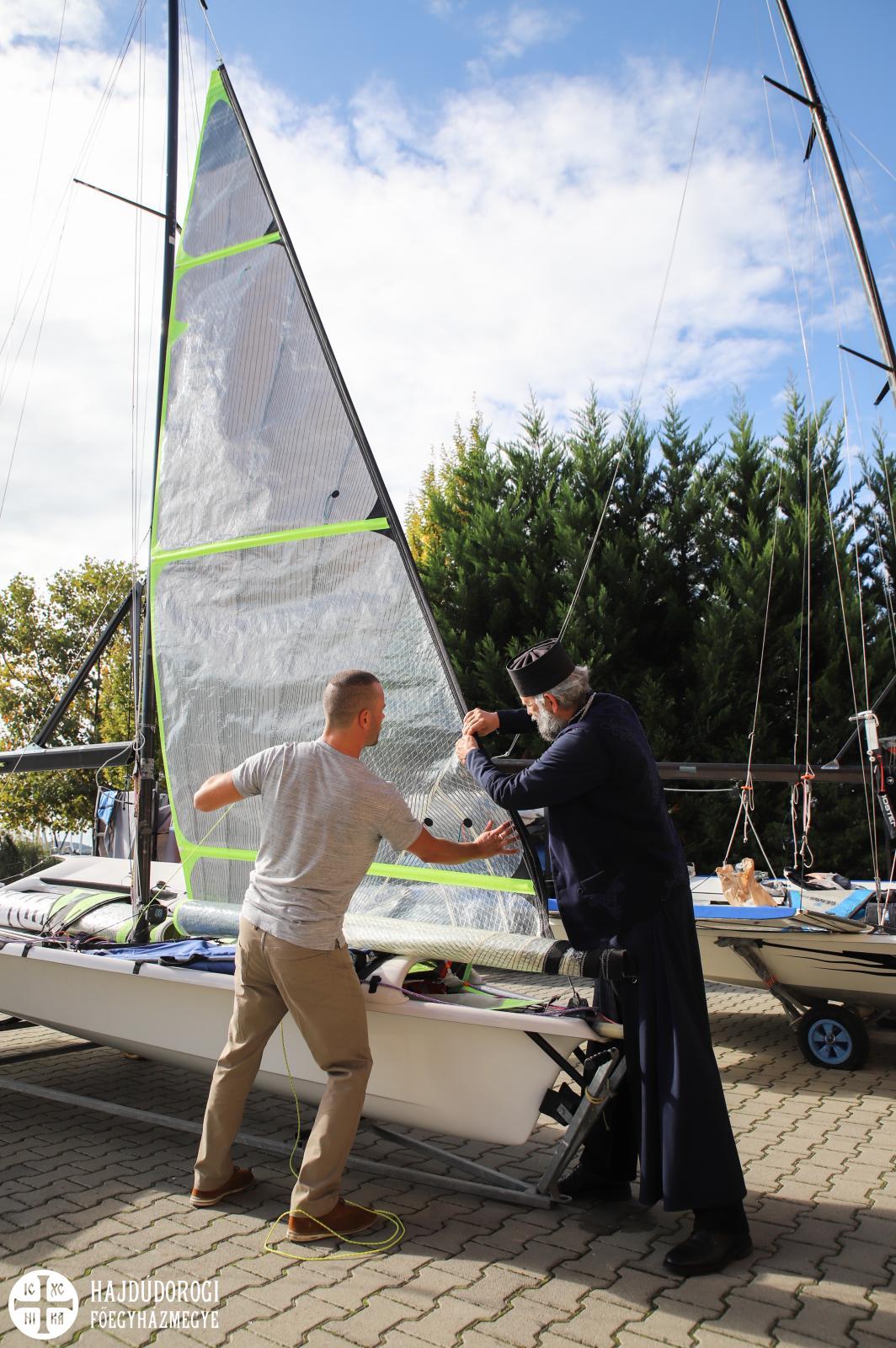 Fülöp atyát a BYC ügyvezető igazgatója, Böröcz István is köszöntötte. Miután a Cserép-fivérek „gyorstalpalót” adtak a vitorlázásról, megmutatták hajójukat, melyet Fülöp atya is segített az edzésre fölszereni. A vitorlára mutatva kijelentették:” nekünk van a legjobb szponzorunk. Lelki értelemben biztosan!”