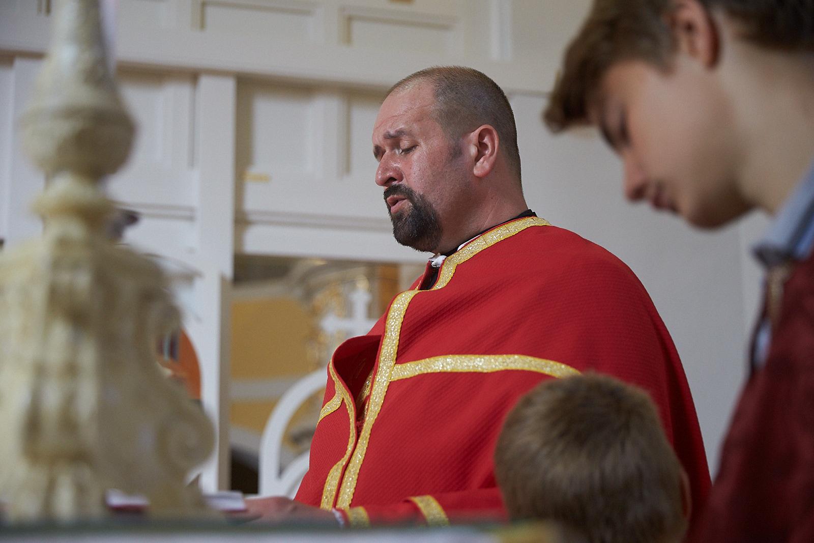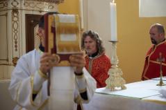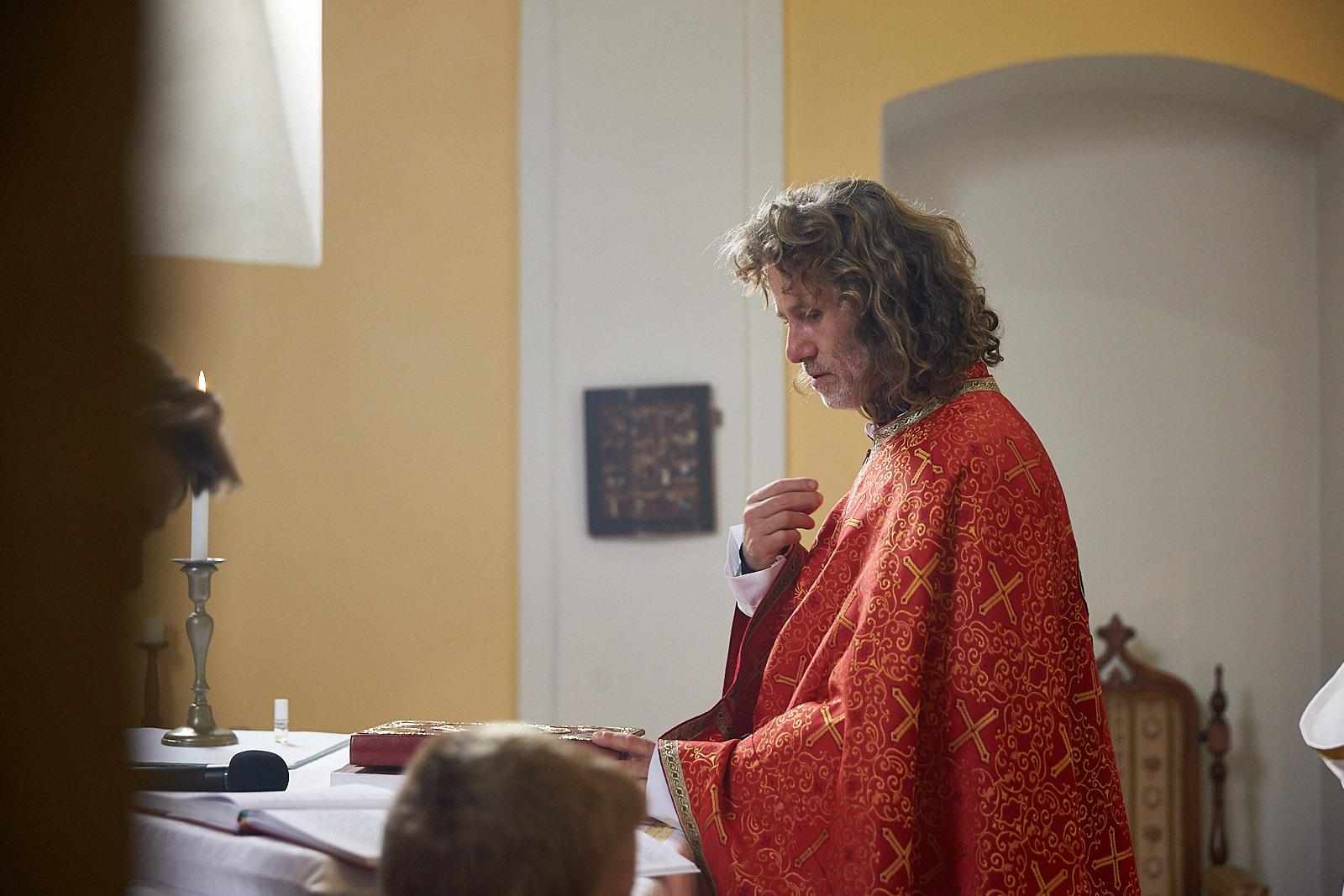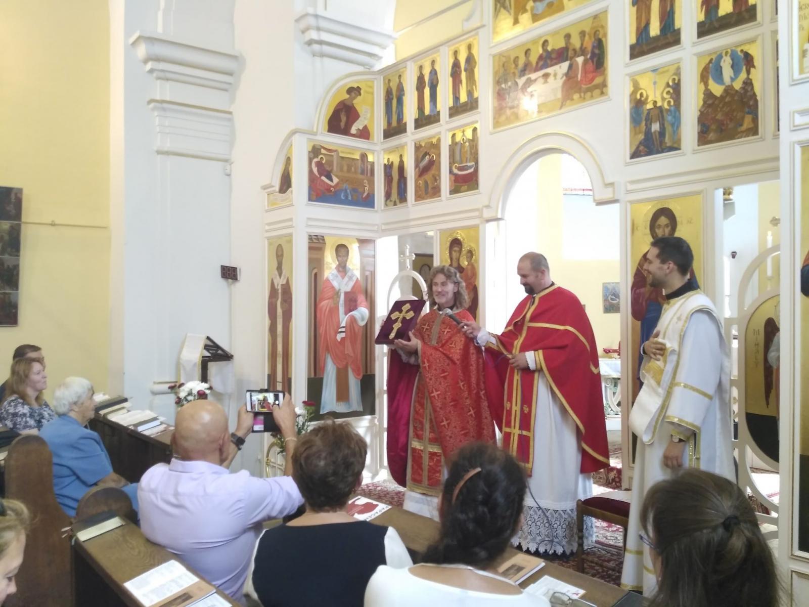 A Szent Liturgia végén egyházközségünk világi elnöke, Kovaliczky János köszöntötte a jubiláns papot, aki a parókiánk nevében egy – külön erre az alkalomra készített – áldó keresztet ajándékozott, melybe László atya ezüstmisés jelmondata lett gravírozva: „Dicsőség Neked Isten, dicsőség!”