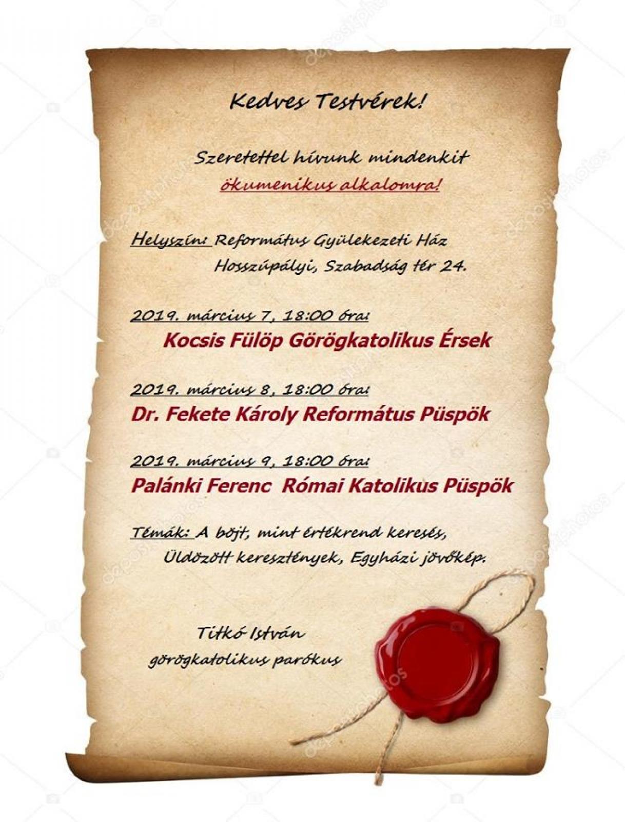 Kocsis Fülöp érsek-metropolita atya, Palánki Ferenc római katolikus püspök atya és Fekete Károly református püspök úr tartanak előadást Hosszúpályiban. Részletek a plakáton.