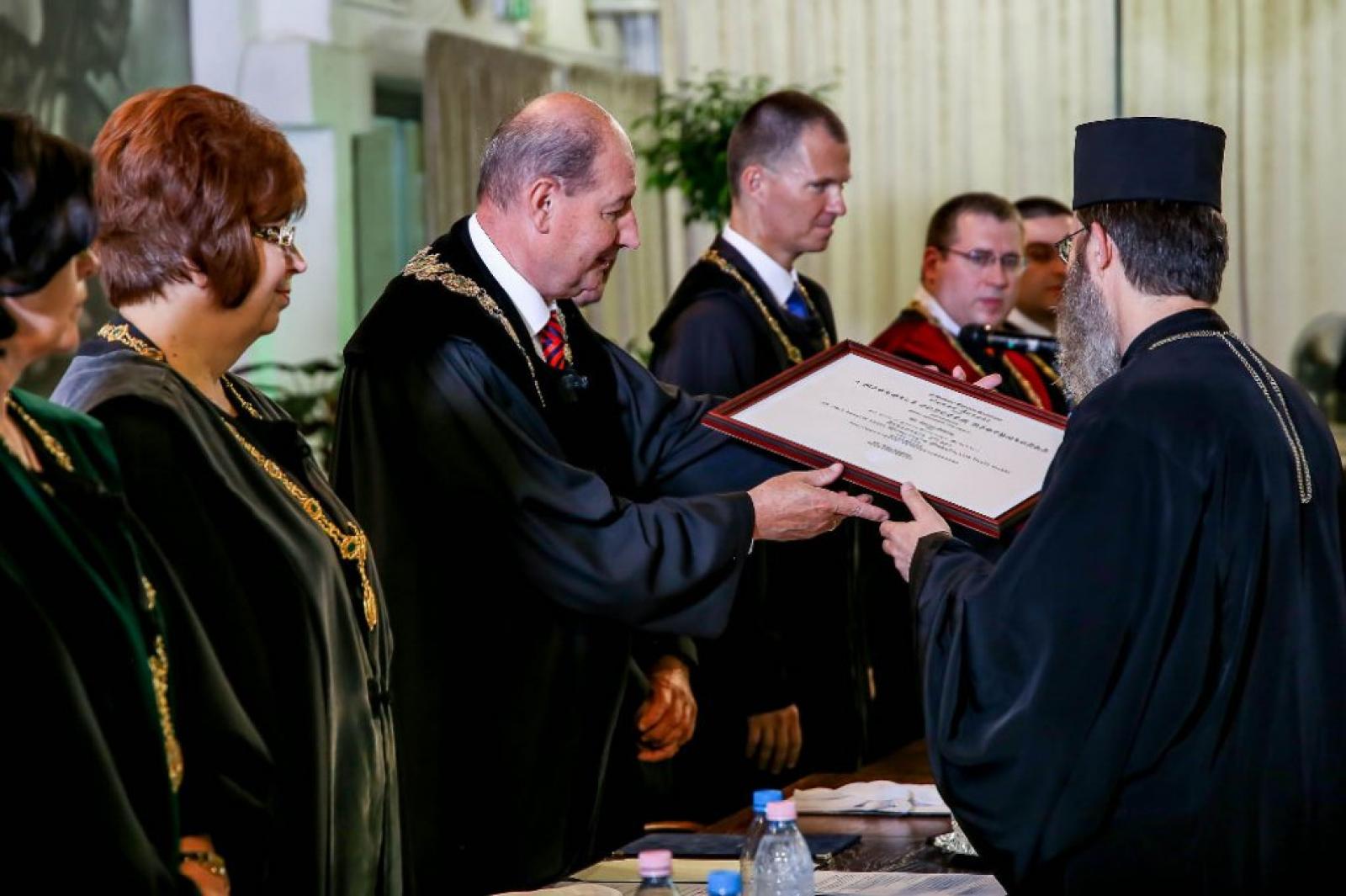 A Miskolci Egyetem szenátusa 2018. június 28-án tartott diplomaosztó ünnepségén kitüntetést adományozott Dr. Orosz Atanáznak, a Miskolci Egyházmegye püspökének. Az adományozó kiemelte az egyházmegye és a Miskolci Egyetem közötti jó együttműködést, valamint az ökumenizmus terén tett törekvését ismerték el Atanáz atyának. A díszpolgári cím magas rangú egyetemi kitüntetést jelent. Nagy öröm ez mindannyiunknak. A kitüntetést Prof. Dr. Torma András, az egyetem rektora adta át, valamint a karok dékánjai kézfogással gratuláltak püspök úrnak.