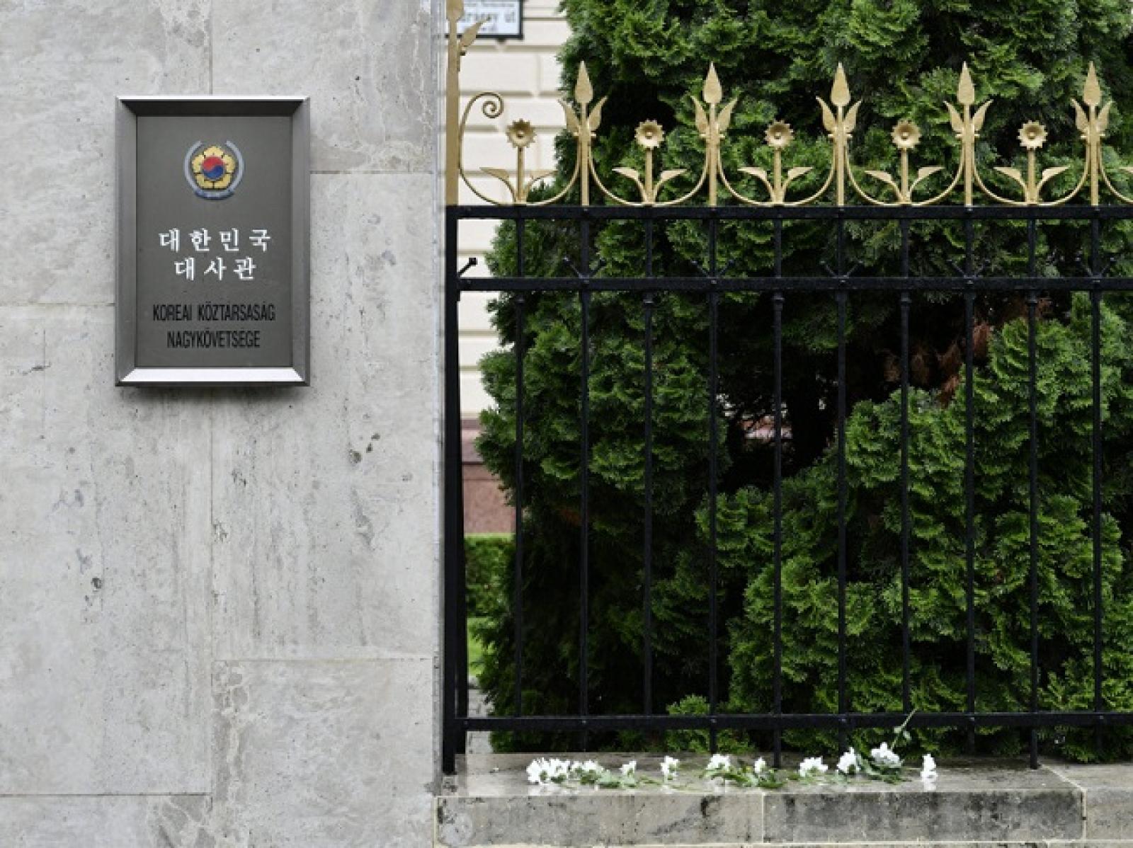 Virágok a dél-koreai nagykövetség kerítésénél az Andrássy úton