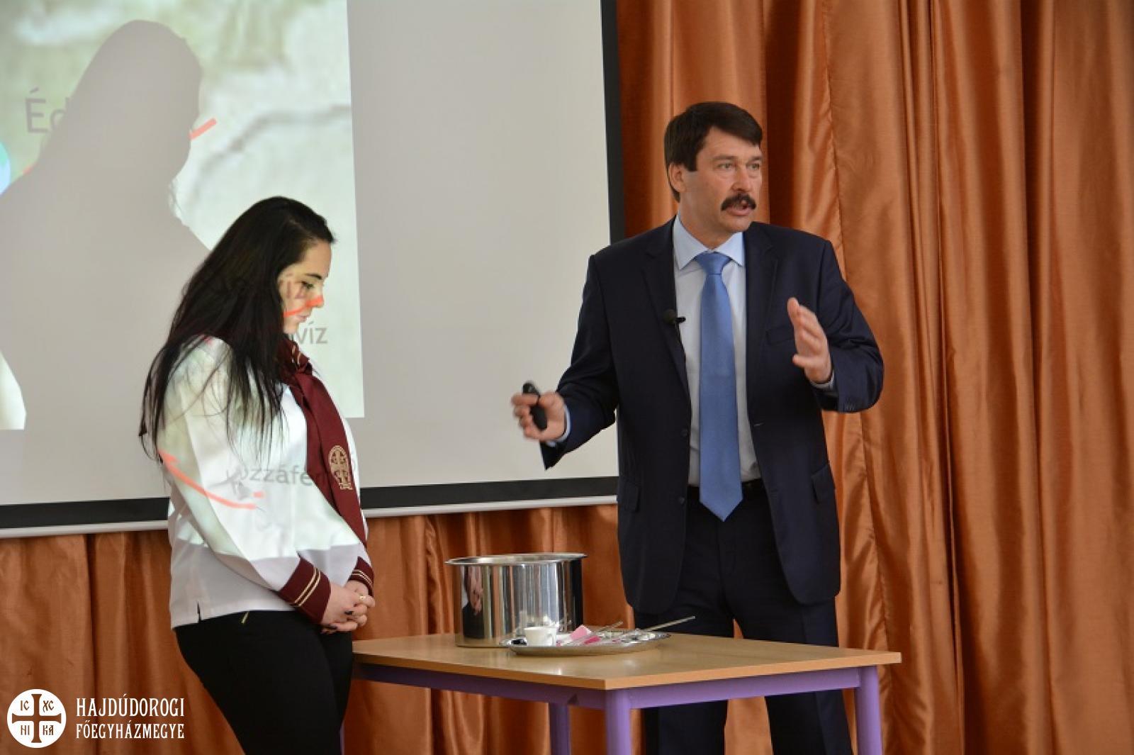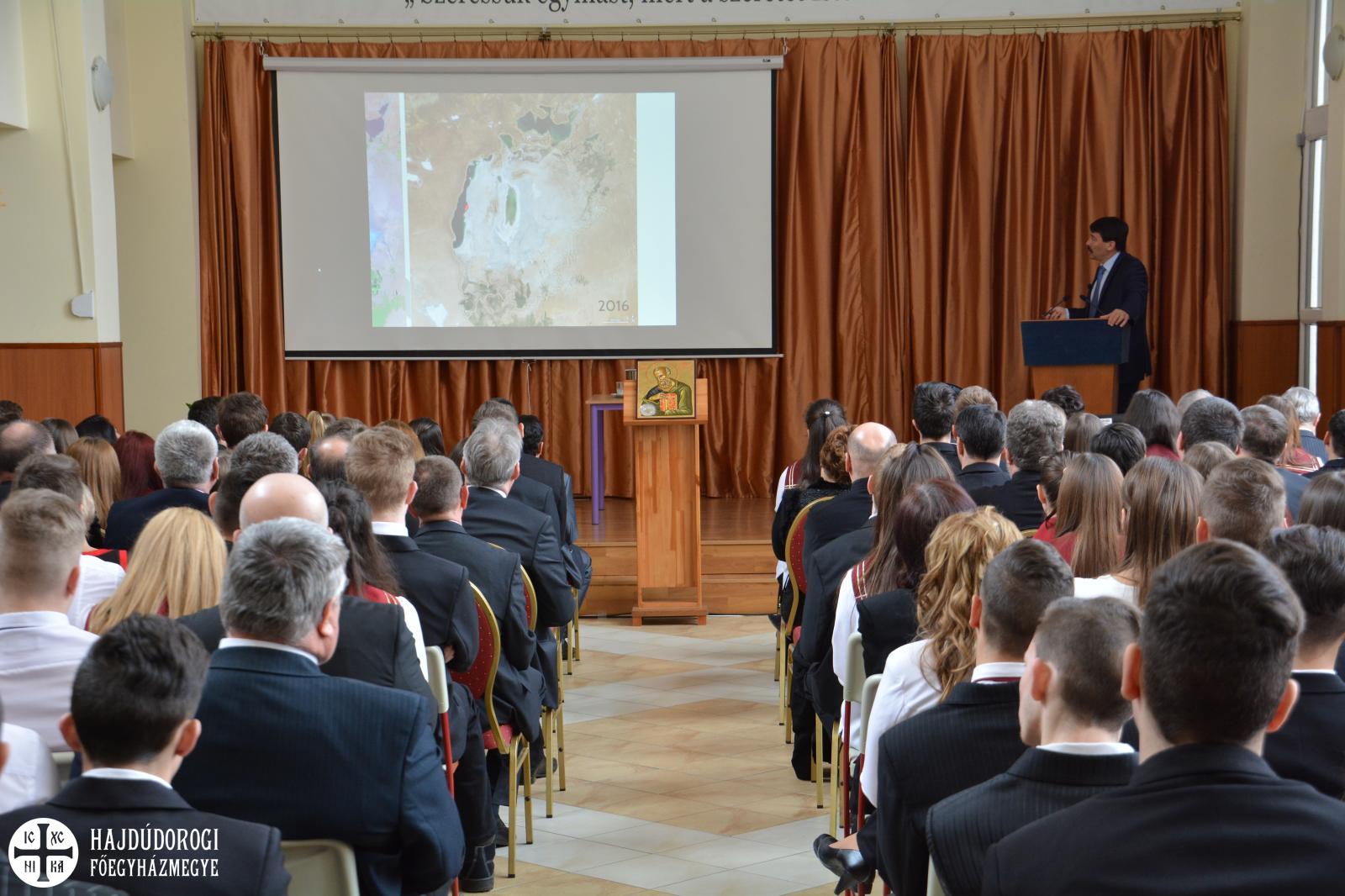 Orosz Atanáz, a Miskolci Egyházmegye püspöke köszöntötte a köztársasági elnököt, kinek „személye számunkra egyetemes értéket képvisel”, hiszen a környezetvédelem nemzetközi főszereplőjeként is ismerjük, személyében hazánkat és természetszeretetét is üdvözölhetjük, mondta a megyéspüspök. Azt is hozzátette: az edelényi gimnázium szándéka, hogy a mintegy háromszáz diákját a környezet- és természetvédelemre is nevelje.Az edelényi Szakgimnázium évek óta nagy hangsúlyt fektet a környezet- és természetvédelemre. Az általános és pedagógiai képzés mellett az itt tanuló diákok a környezetvédelem és vízgazdálkodás szakképzésben is részt vehetnek, valamint érettségi után a környezetvédelmi technikus és természetvédelmi szaktechnikus képzést is választhatják. Közülük többen részt vettek a budapesti Víz Világtalálkozón is. A tanulók számára az elnöki előadás egy tanórával is felért, az „óra” végén pedig szakmai kérdéseket tettek fel Áder Jánosnak.