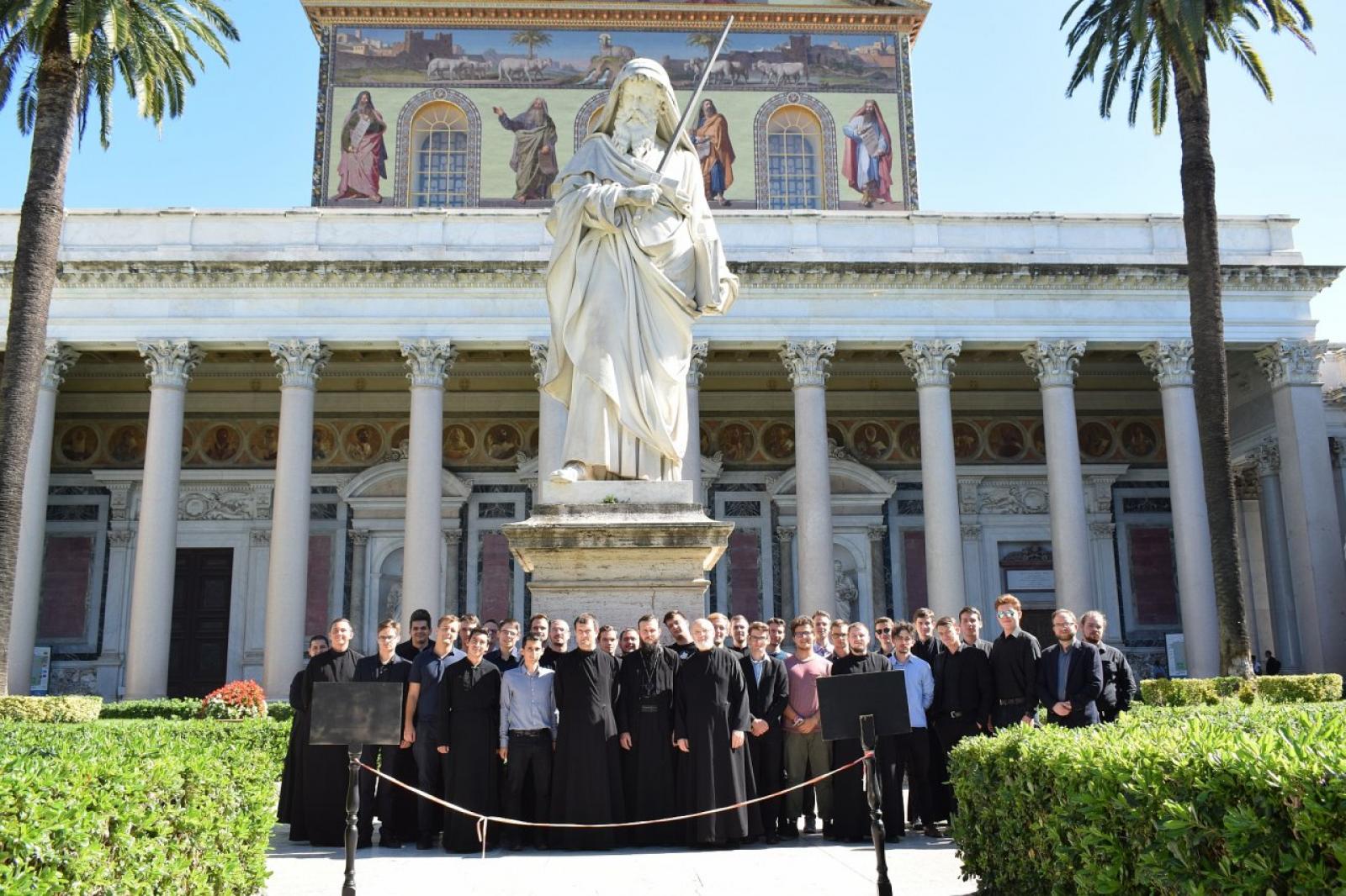 Mindeközben mi, a Rómában tanuló növendékek próbáltuk előkészíteni az előttünk álló hetet, és izgatottan vártuk a többiek érkezését, akik számára a hétfő délelőtt a vatikáni Szent Péter-bazilika megtekintésével kezdődött. A délután nagy részét ezután a Vatikáni Múzeumokban töltöttük, ahol nemcsak a Sixtus-kápolnában időzhettünk, hanem a képzőművészet fejlődését is nyomon követhettük az antikvitástól egészen napjainkig, de láthattuk a pápák közlekedési eszközeit is, a hordszékektől a legelső generációs Mercedesekig, egészen a pár éve még használt autókig. Az esti program ezután a Pontificium Collegium Russicum (szláv ajkú bizánci és római rítusú diákok kollégiuma) templomában énekelt ünnepi vecsernyével folytatódott, ahol egy jó hangulatú vacsorával is vendégül látták a magyar zarándokokat.