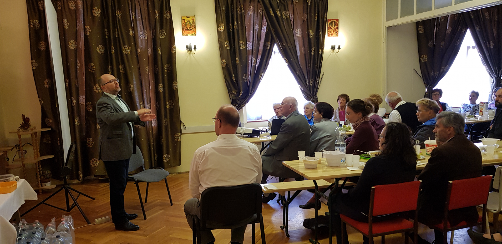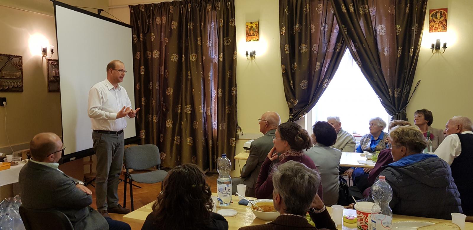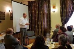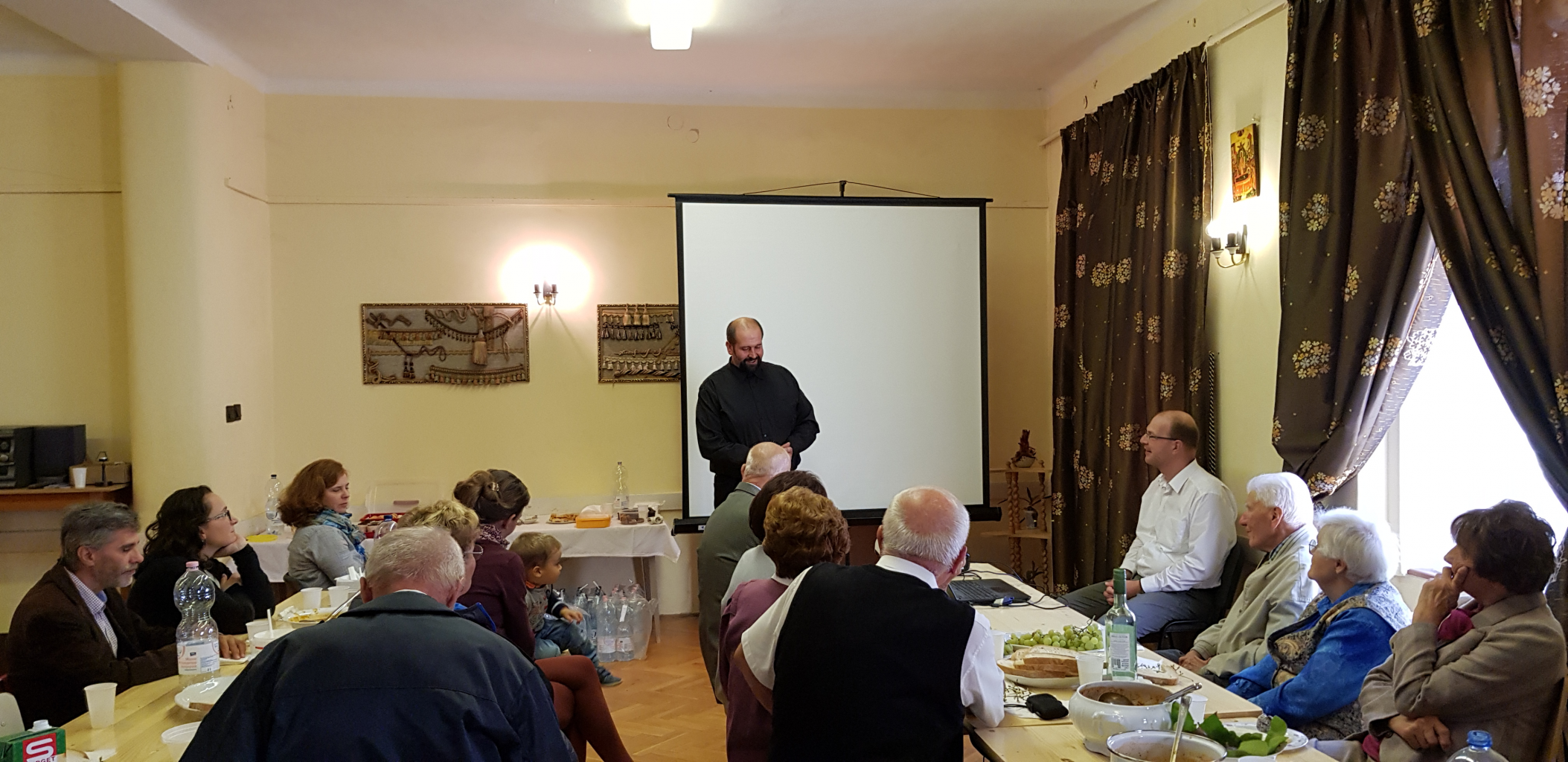 Majd előadások sorozata következett, melyet Girán János – egyházközségünk oszlopos tagja - nyitott, ismertetve a hallgatósággal a május 25-én Hajdúdorogon megrendezett Metropóliai családi napon hallottakat. Ezután Orova Csaba és Bodnár Boglárka osztotta meg személyes tapasztalatait a kisdedek áldoztatása kapcsán, amit a három esztendős Csabika révén élnek meg. Az Ő előadásuk témáját zárta Gábor atya pár mondatos gyakorlati tapasztalata.