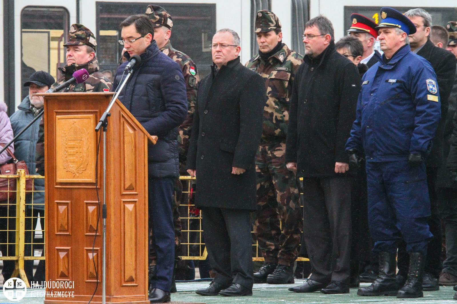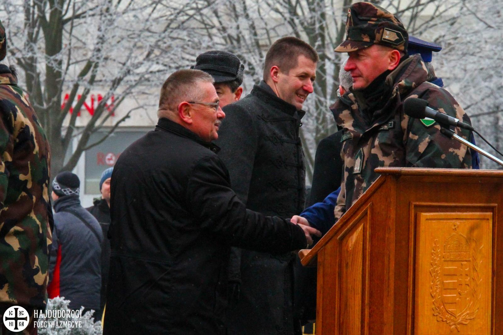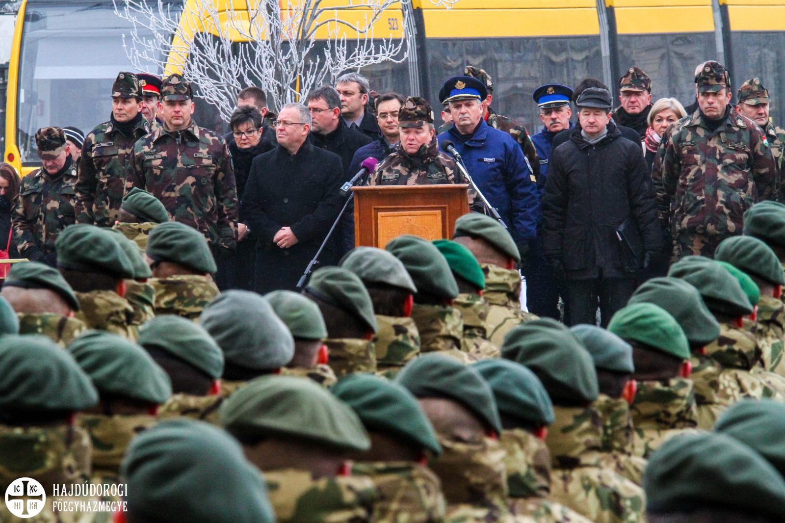 Papp László, Debrecen polgármestere arról beszélt, hogy a magyar katonaságnak az Osztrák-Magyar Monarchiáig visszanyúló, évszázados hagyománya van a békefenntartásban. Magyarország az elmúlt húsz évben bizonyította elkötelezettségét Európai biztonsága, a konfliktusok békés rendezése iránt Koszovóban, Afganisztánban, vagy a migrációs hullám megállításában az ország déli határainál - mondta. Papp László hozzátette: Debrecen büszke arra, hogy a Magyar Honvédség legnagyobb katonai egységének, a Bocskai dandárnak adhat otthont. Kossuth szavait felidézve azt mondta, Debrecen ma is a szabadság őrvárosa, a debreceni katonák őrködnek azon, hogy béke legyen. A cívisváros polgármestere fontos, humanitárius szolgálatnak nevezte a debreceni dandár katonáinak békefenntartó misszióját. A kibocsátó ünnepség végén a békefenntartók díszmenettel tisztelegtek elöljáróik, családtagjaik és a búcsúztatásukra egybegyűlt debreceniek előtt a város főterén.