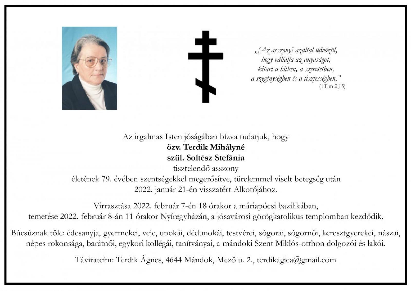 Özv. Terdik Mihályné szül. Soltész Stefánia tisztelendő asszony életének 79. évében szentségekkel megerősítve, türelemmel viselt betegség után 2022. január 21-én visszatért Alkotójához.