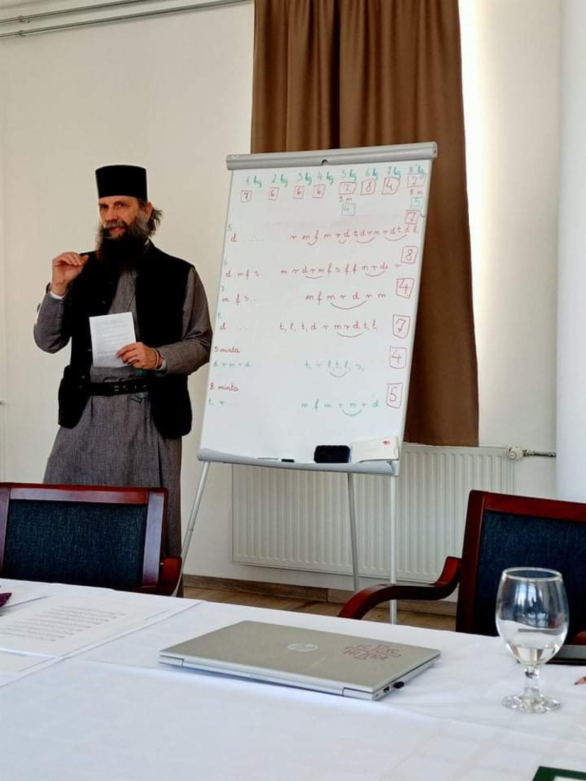 A szombati előadásokat Fülöp metropolita atya és Királyné Kocsis Magdolna tartották. A sztihirák előverseit vettük át, de előtte érthető áttekintést kaptunk a liturgikus zenei világunk különböző műfajairól, hogy jól láthassuk, ebben a zenei rendszerben hol helyezkednek el az előversekként énekelt zsoltársorok. A tanítás egyik kiemelt eleme volt, hogy nem helyes a szertartáson kottából énekelni az előverseket. Ez megköti az éneklő figyelmét, nem tud magabiztosan ráhagyatkozni a megszerzett saját ismeretekre.