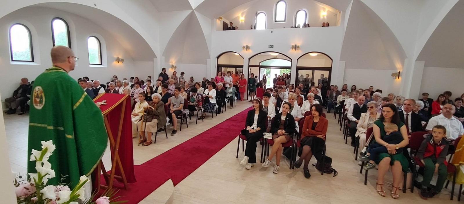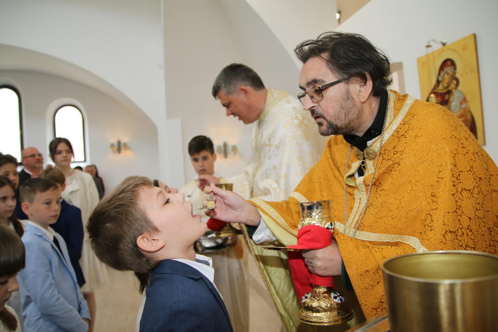 Május 14-én vasárnap első alkalommal volt elsőáldozás az új templomunkban, amely során tizenkét gyermek életében először vehette magához Krisztus testét és vérét. A gyerekek lelkiismeretesen felkészültek életük jeles eseményére, példásan számot adtak tudásukról, s megkönnyebbülten tették le bűneiket is a szentgyónásuk alkalmával.