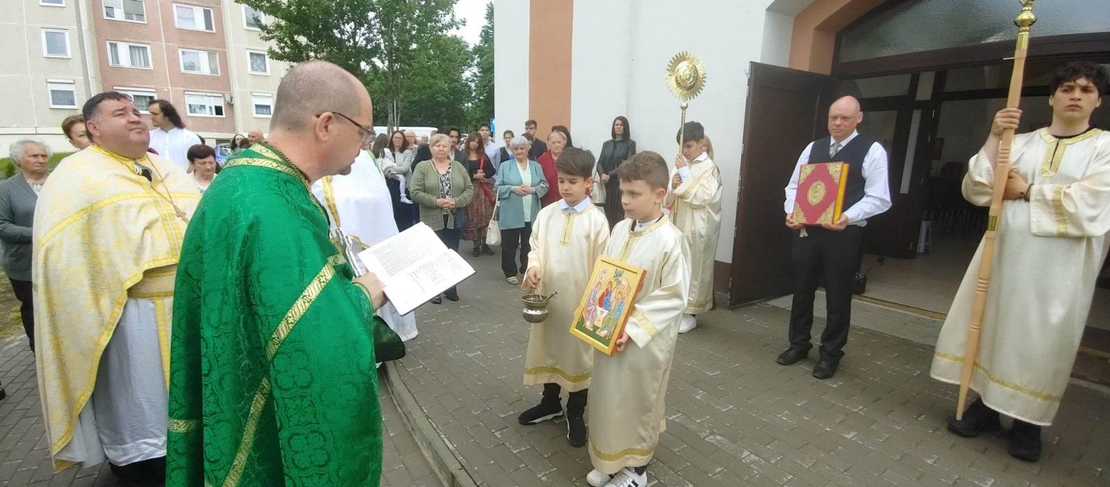 Istennek hála ez a nap idén el is jött, hiszen május 29-én, Pünkösdhétfőn, a Szentháromság ünnepén a 10 órai Szent Liturgiában adtunk hálát templomunkért s közösségünkért. Megtisztelt bennünket jelenlétével többek között dr. Seszták István, a Hajdúdorogi Főegyházmegye főhelynöke is, aki az aznapi szertartást vezette s a szívhez szóló tanítást is adta számunkra. „Ennek a templomnak, s ennek a közösségnek ereje a Szentháromság”- hallhattuk főhelynök atyától.