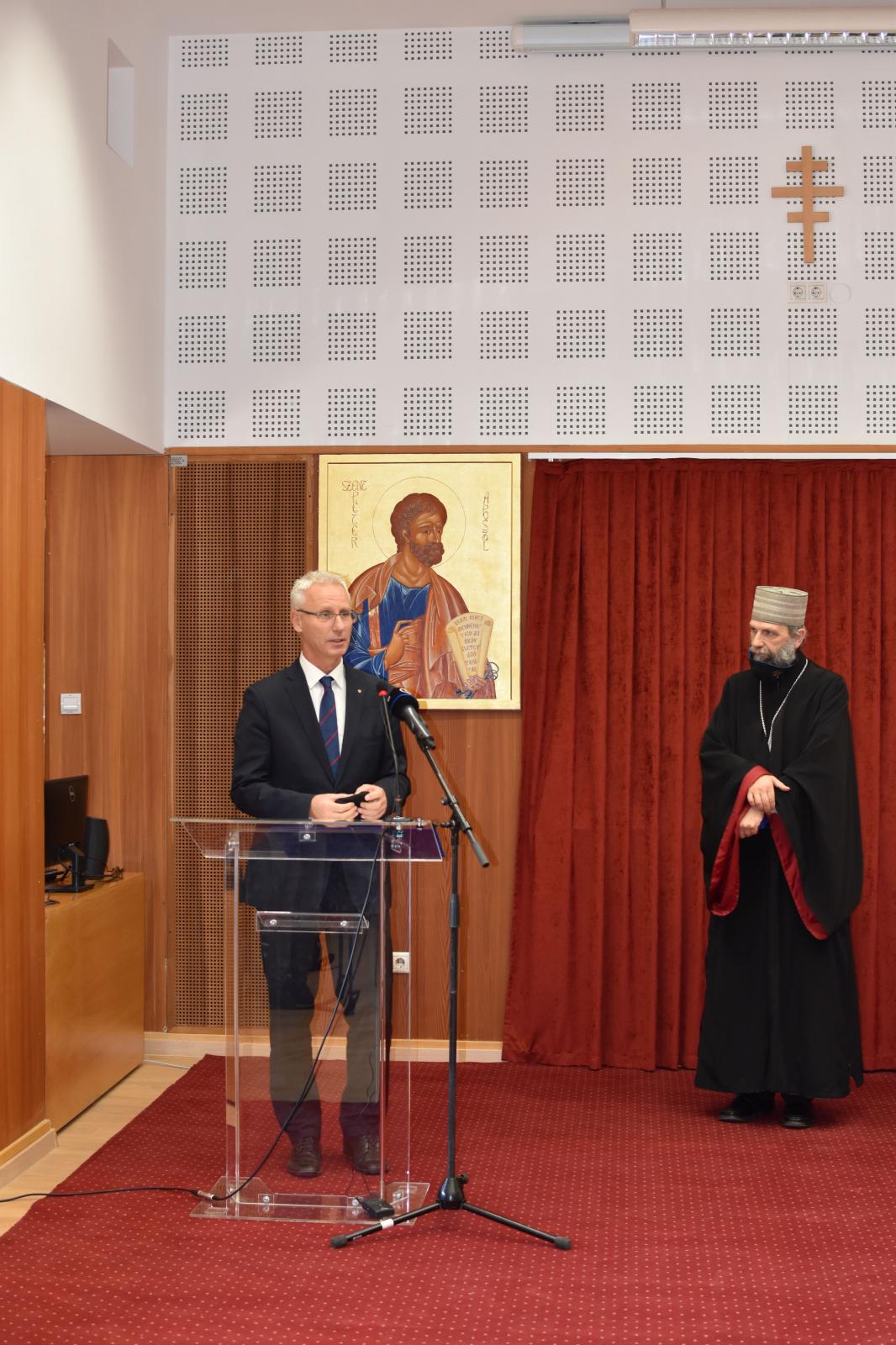Soltész Miklós államtitkár éltetésében rektor atya 20 éves papi munkáját megköszönve kihangsúlyozta azt a hatalmas munkát, aminek segítségével az elmúlt években a magyarországi és a szomszédos országokban élő bizánci rítusú egyházakat különböző programokon keresztül összekapcsolta. Ezek a hiánypótló programok pedig oly módon valósultak meg, hogy az egyes felekezetekhez való tartozás is fontos volt számára.