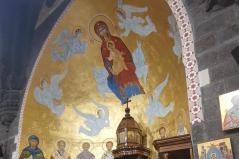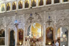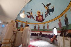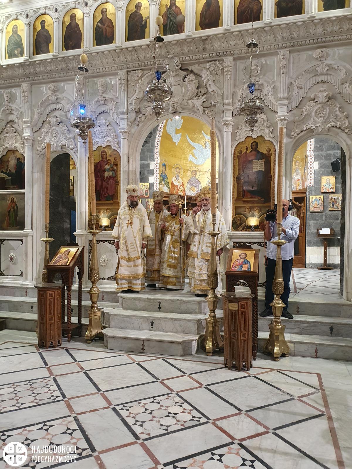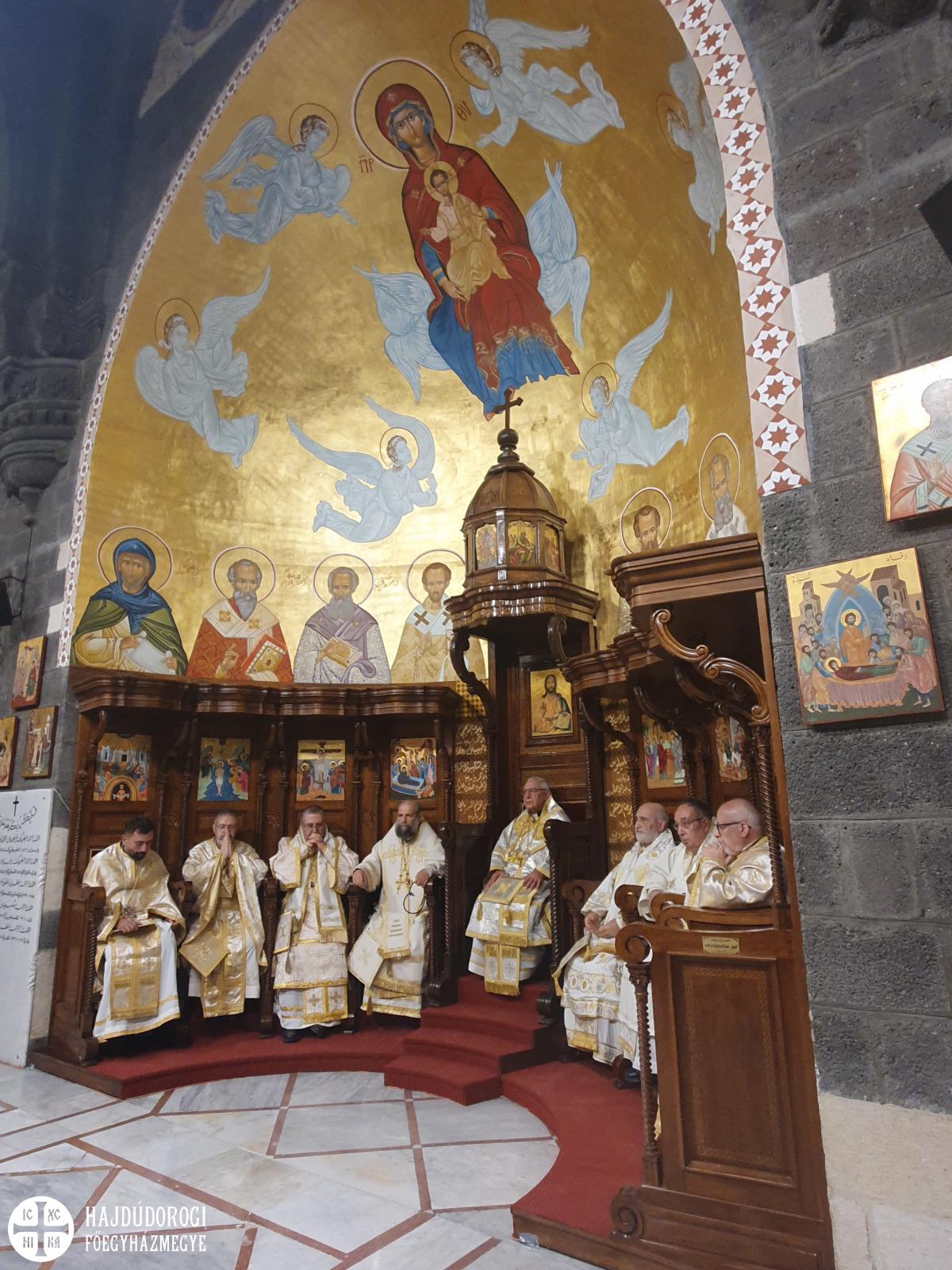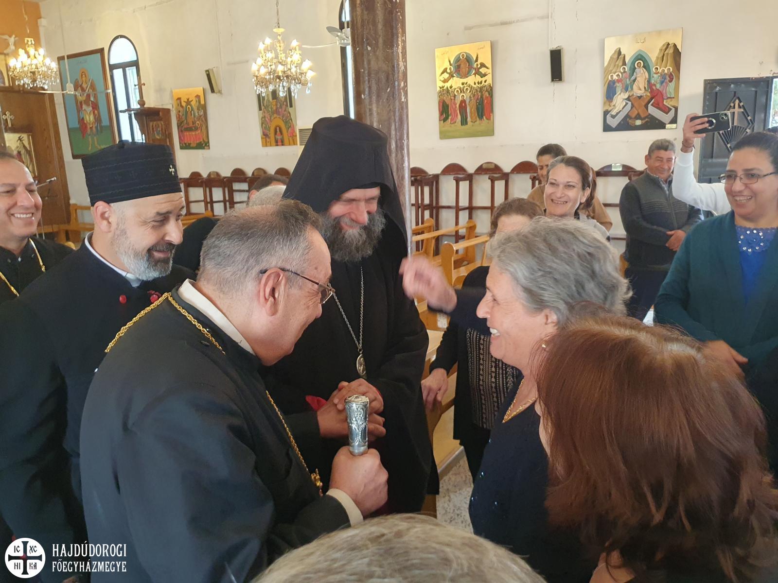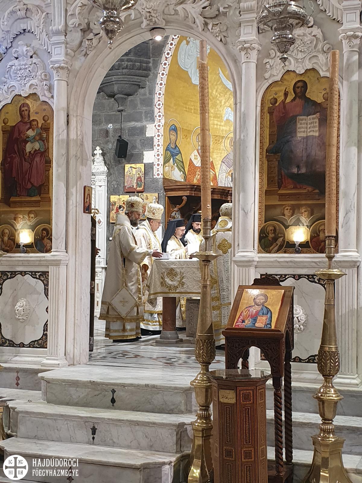 A magyar görögkatolikus főpásztor szíriai látogatásának negyedik, egyben utolsó napján reggel Al-Dmeine falujában vett részt Szent Liturgián. Látogatását megtisztelte Jean-Abdo Arbach homszi püspök is, a kis településen így két püspök és három pap végezte a Szent Liturgiát. Figyelemre méltó, hogy a templom nem csak ilyen ünnepi alkalommal, hanem minden vasárnap tele van, a kórus gyönyörűen énekel. Nekünk különösen is szívet melengető, hogy az ikonosztáz előtt a máriapócsi Istenszülő ikonja is látható.