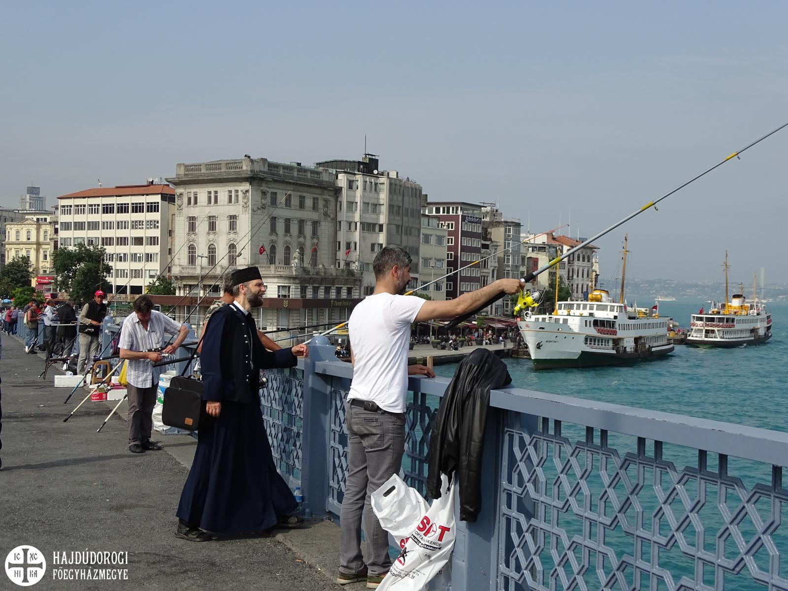 Az Hagia Sophia után újabb diplomáciai telefonhívások következtek a Szíriába való beutazásunk ügyében, majd séta az Aranyszarv-öbölben, és a Galata-hídon. Ennek a hídnak érdekessége, hogy míg a felső szinten folyik a forgalom, a vízhez közel éttermek sorakoznak. Mind rendkívül előkelő. Ebben az időpontban nem is volt nagy forgalom egyiküknél sem. Bizonyára ezért is voltak már-már tolakodóan udvariasak és a ki-ki a saját éttermébe csalogatott minket. Vesztünkre az egyiknek már nem tudtunk ellenállni, s a korgó gyomrunk, a járkálásban egyre súlyosabb lábaink is rásegítettek erre az elgyöngülésre. Mindketten kissé rossz lelkiismerettel ültünk az egyébként gyönyörű helyen lévő éttermi asztalhoz. Körülöttünk, sőt, fölöttünk pecázó emberek, a kék vízen hajók óriási forgalma, a távolban az Hagia Sofia, másik oldalon pedig a Boszporusz híd. Az előkelő helyért meg a lángoló cserépedényben kihozott lecsóért borsos árat fizettünk. Még mindenfélével akartak kedveskedni nekünk, de mi már inkább menekültünk ebből a pénztárcánkra leső udvariasságból. A számlán is rajta volt a borravaló, s még azon felül is erősködtek, hogy az még nekik járna. No, ekkor már határozottabbra vettük a figurát, és otthagytuk őket. Viharosra sikerült távozásunk után azonban érdekes mozzanatok következtek. A következő étterem egyik dolgozója már nem pénzforrást látott bennünk, hanem Fülöp atyától áldást kért. Mikor ezt könnyedén megkapta, egyszerre több fiatalember is odaszaladt, hogy ők is kaphassanak áldást. Megható volt, hiszen több mint valószínű, hogy muzulmánok voltak, ám egyházi személy láttán tisztelték benne az Isten emberét.