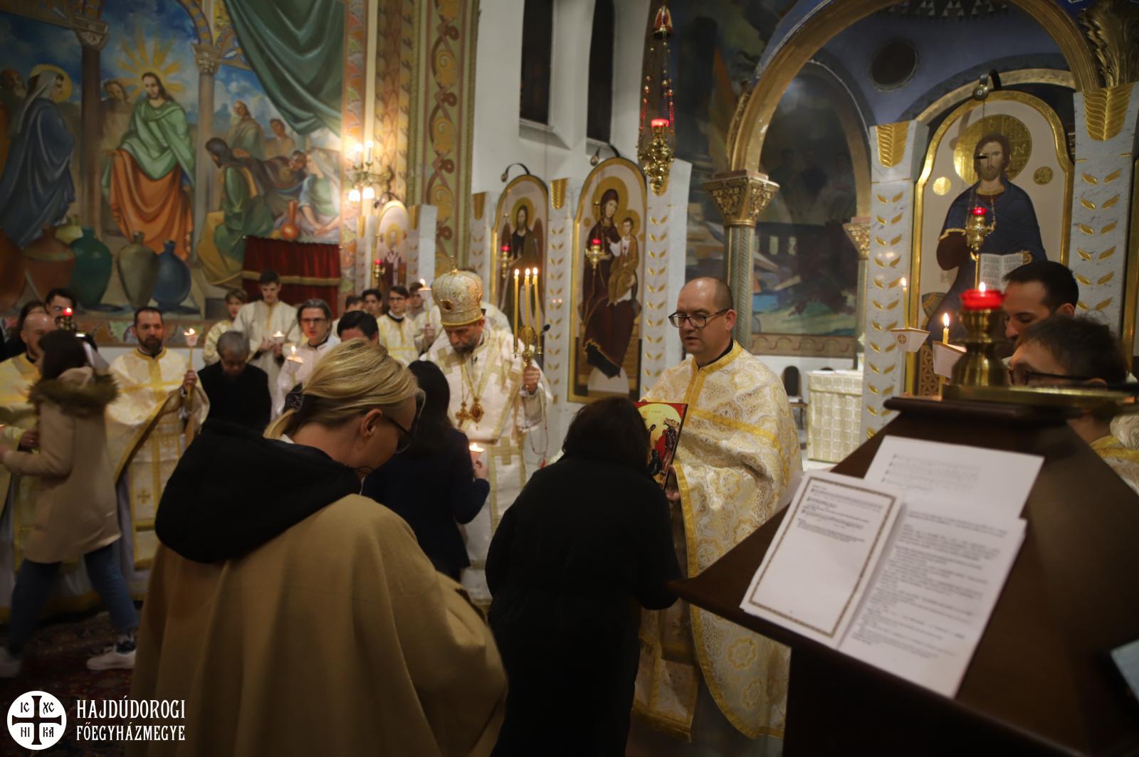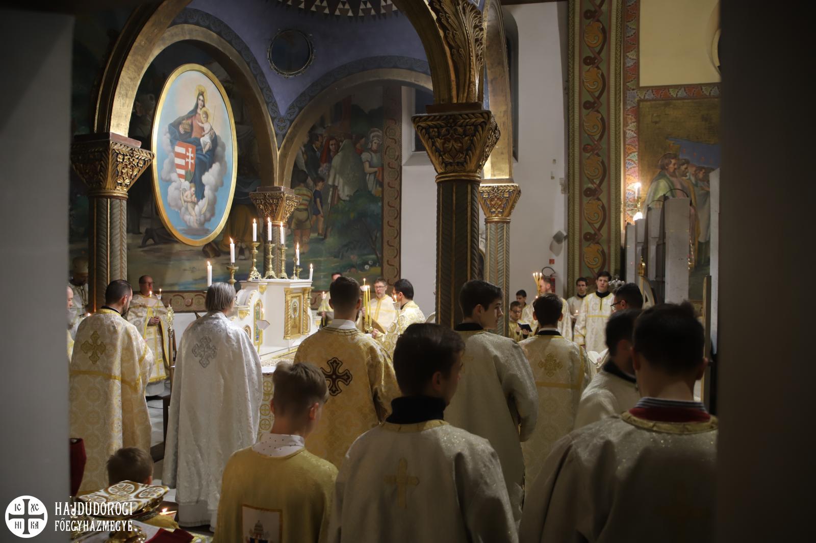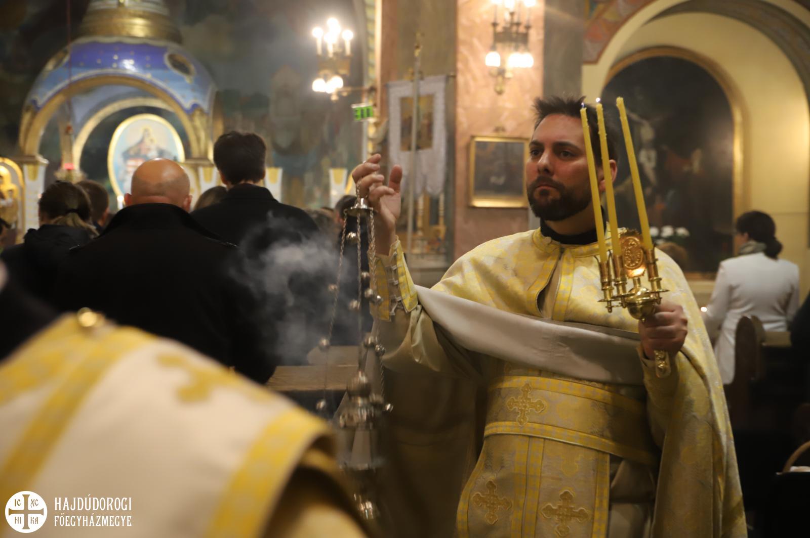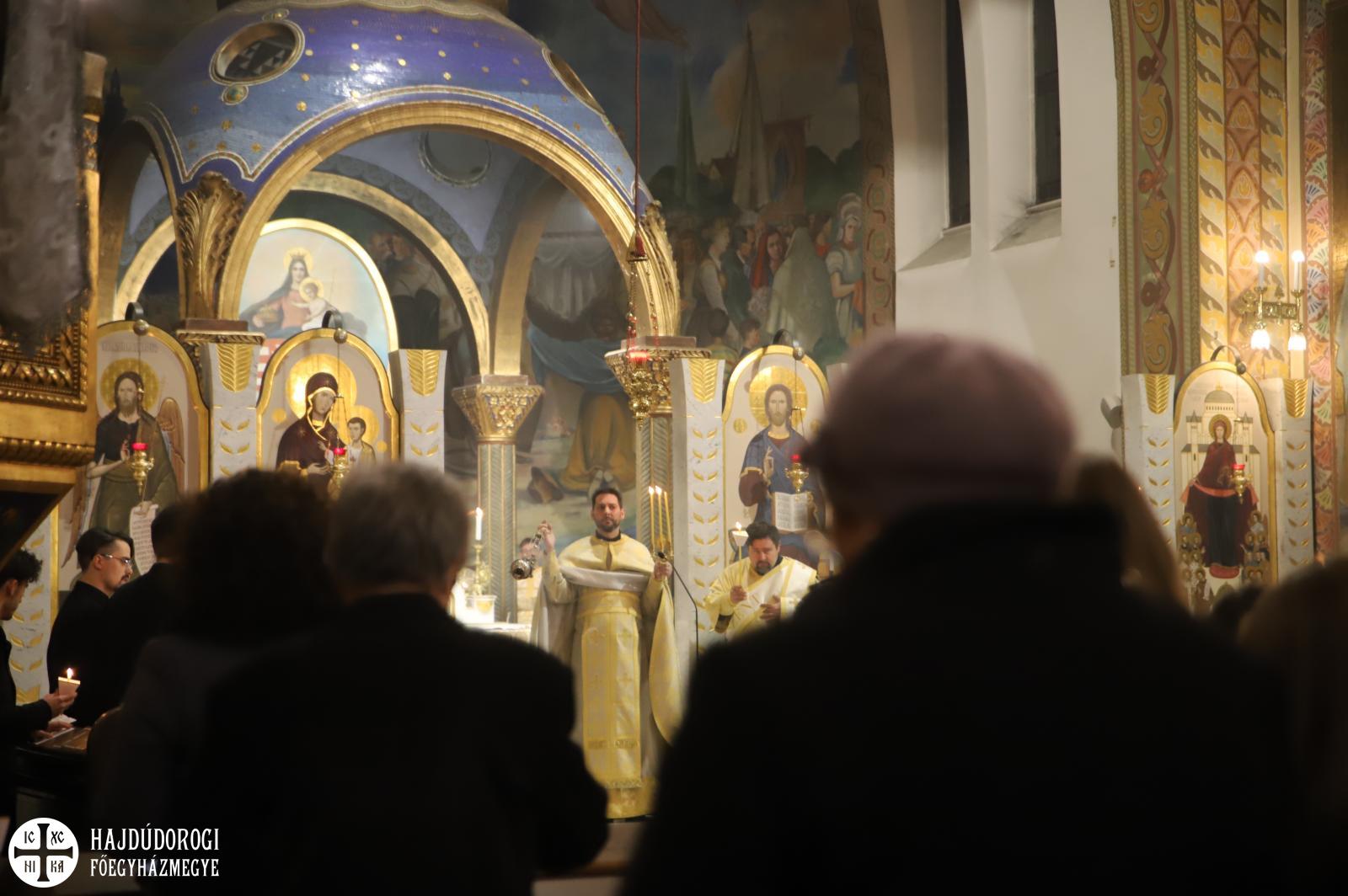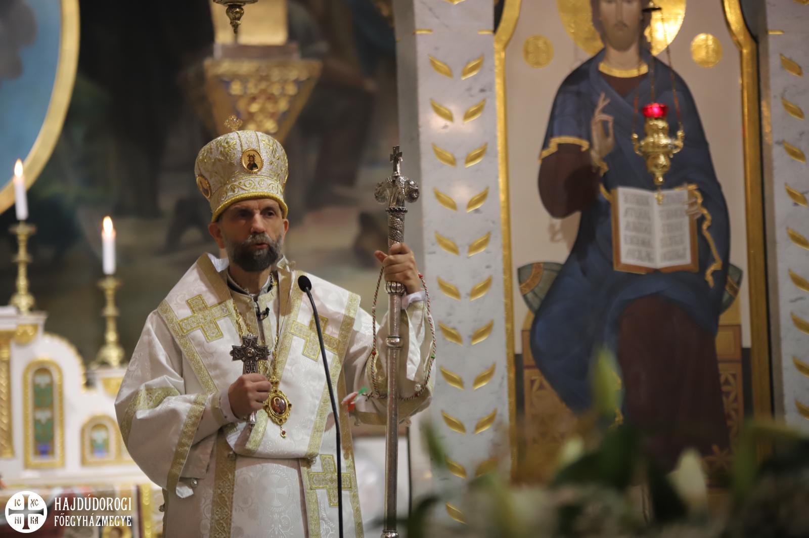 Így rendezte az Isten a megváltásunkat, így rendezte mindjárt az ember sorsát, amikor megállapította, hogy nem jó az embernek egyedül lenni. Segítő társat alkotott neki, és közösen családot alkottak, közösségben él az ember. Közösségben tud ünnepelni, imádkozni, mindnyájan megtapasztalhattuk azt, hogy nagyon szép az imádság, egészen mély tud lenni, amikor egyedül imádkozik az ember. De amikor ezekre a közös szertartásokra összejövünk, szinte önkéntelenül is magával ragadja az ember lelkét a közös imádság, amely nemcsak itt a debreceni görögkatolikus templom néhány száz görögkatolikusaira vonatkozik és nem is csak a magyarországi görögkatolikusokra, és nem is csak az imádkozó földi emberekre, hanem a szentekre, az angyalokra.