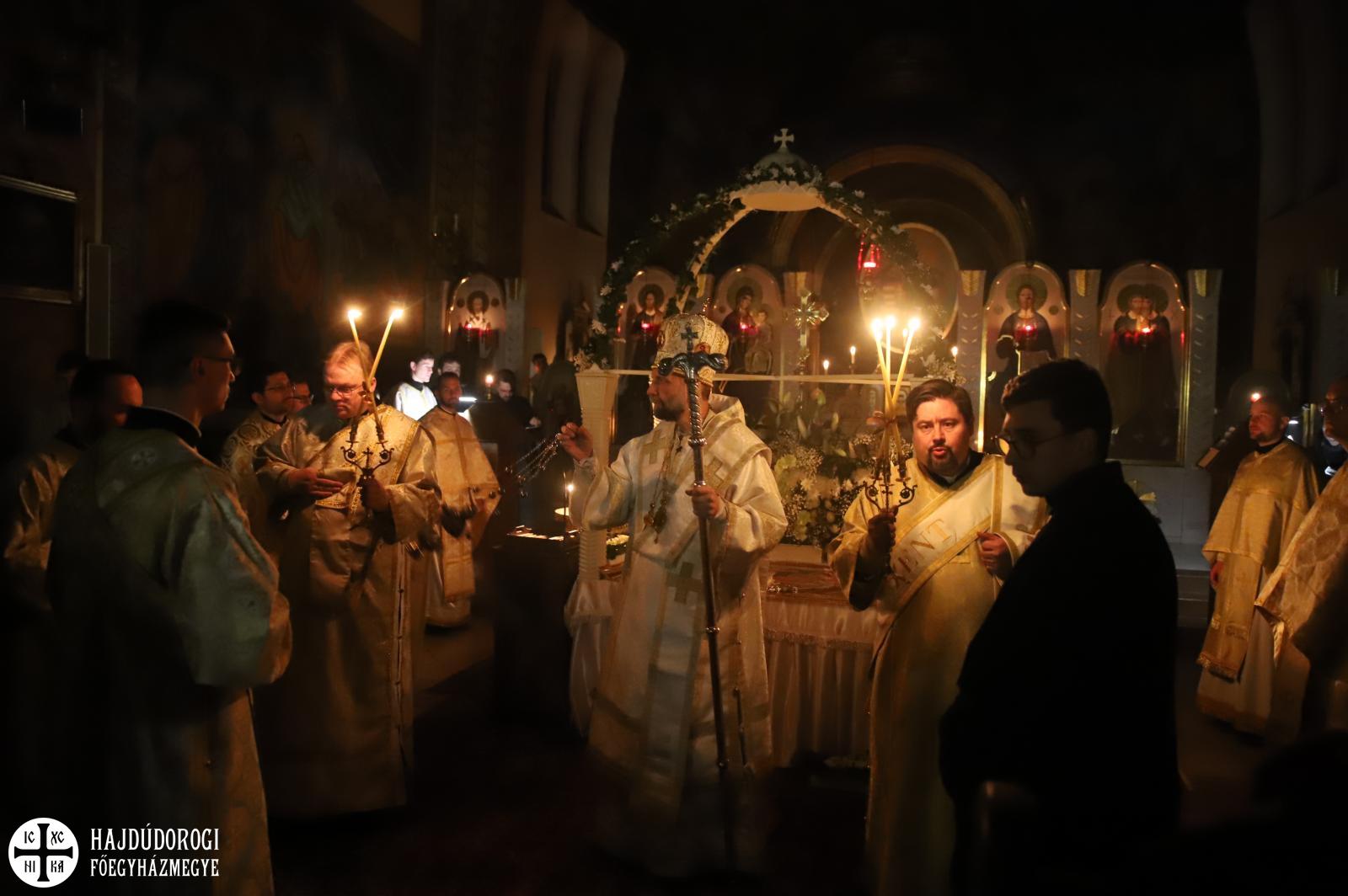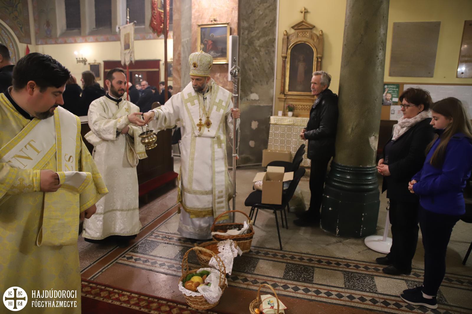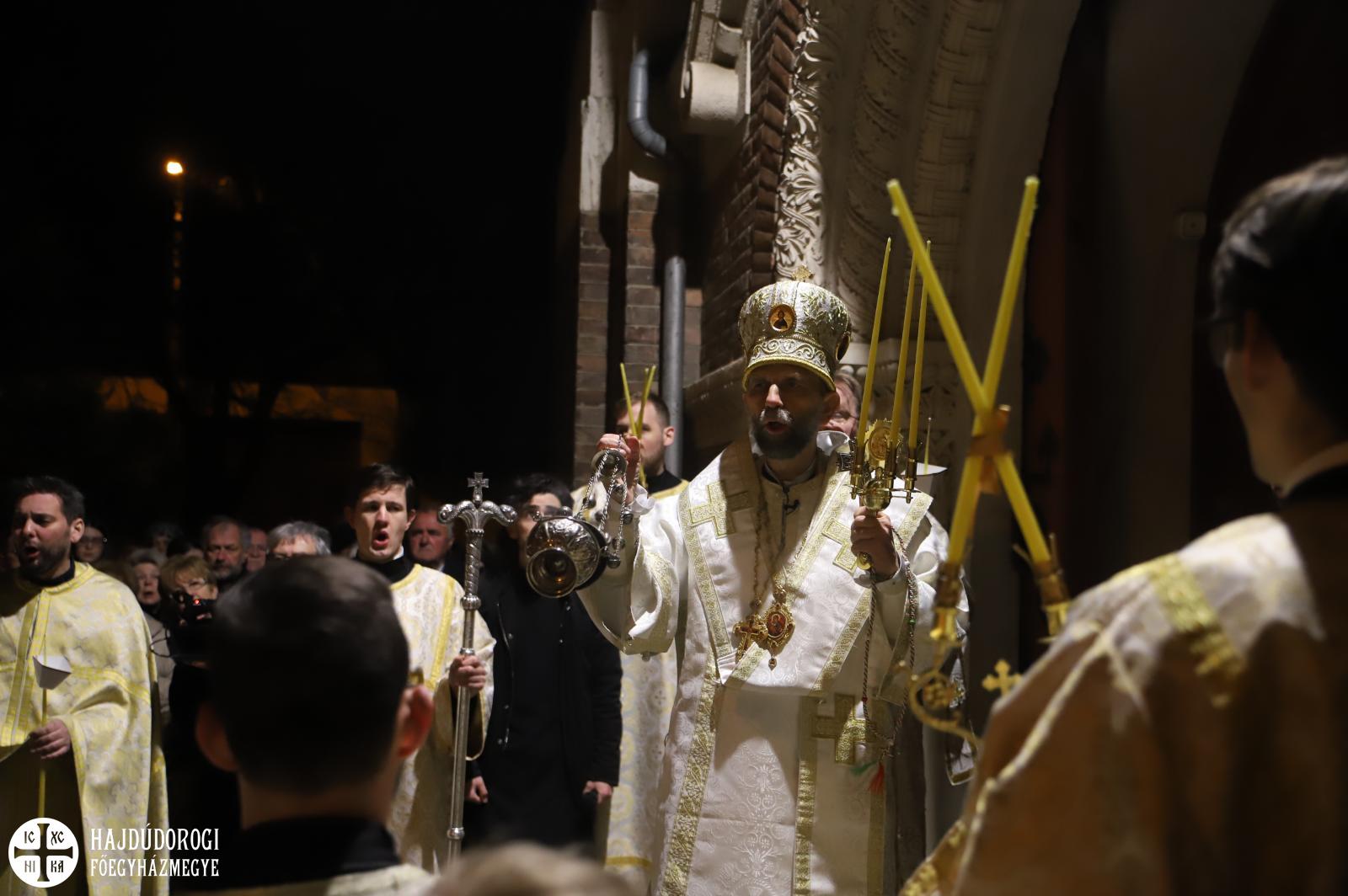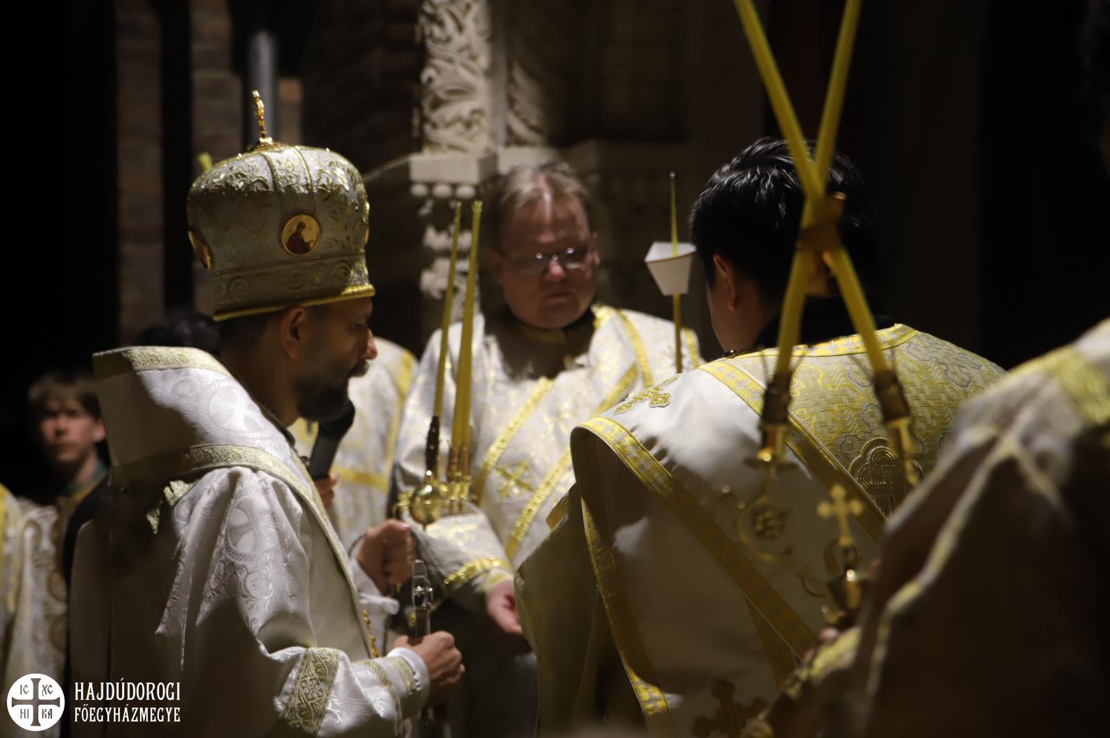 Többször is elhangzott a készületben, hogy ennek a Húsvétnak másnak kell lenni, mint az eddigieknek, ennek a húsvétnak át kell változtatni az életünket, át kell formálnia, nemcsak a mienket, hanem rajtunk keresztül a családunkét, a társadalomét, egész magyar nemzetét, de nem túlzás azt is mondani, hogy az egész világét, hiszen a világ részesei vagyunk mi is. Ha a mi életünk megváltozik, megváltozik tőle a világ is. Idehívott, hogy részesítsen bennünket a föltámadás örömében, idehívott, hogy aztán, amikor útra bocsát bennünket, akkor hirdessük: Föltámadt Krisztus! Így köszöntjük egymást: Föltámadt Krisztus! – ennél nagyobb hír nincsen, ennél többet nem mondhatunk. Mi görögkatolikosok jól tudjuk rá a választ: valóban föltámadt! Az Isten ezzel az örömmel, ünnepléssel mintegy kinyilatkoztatja az ő erejét és hatalmát. Föltámadt Krisztus, valóban föltámadt! Itt van velünk, átalakítja az életünket.