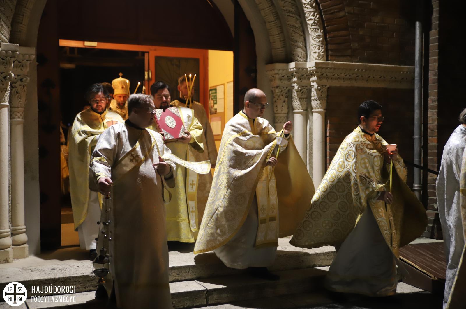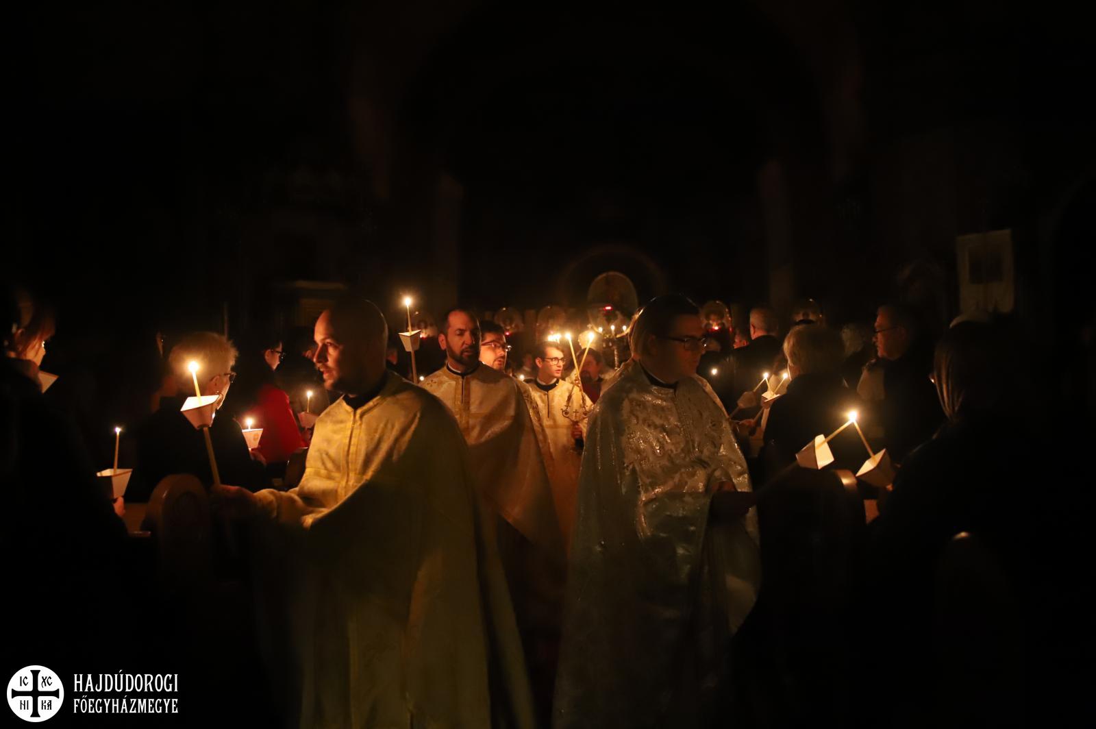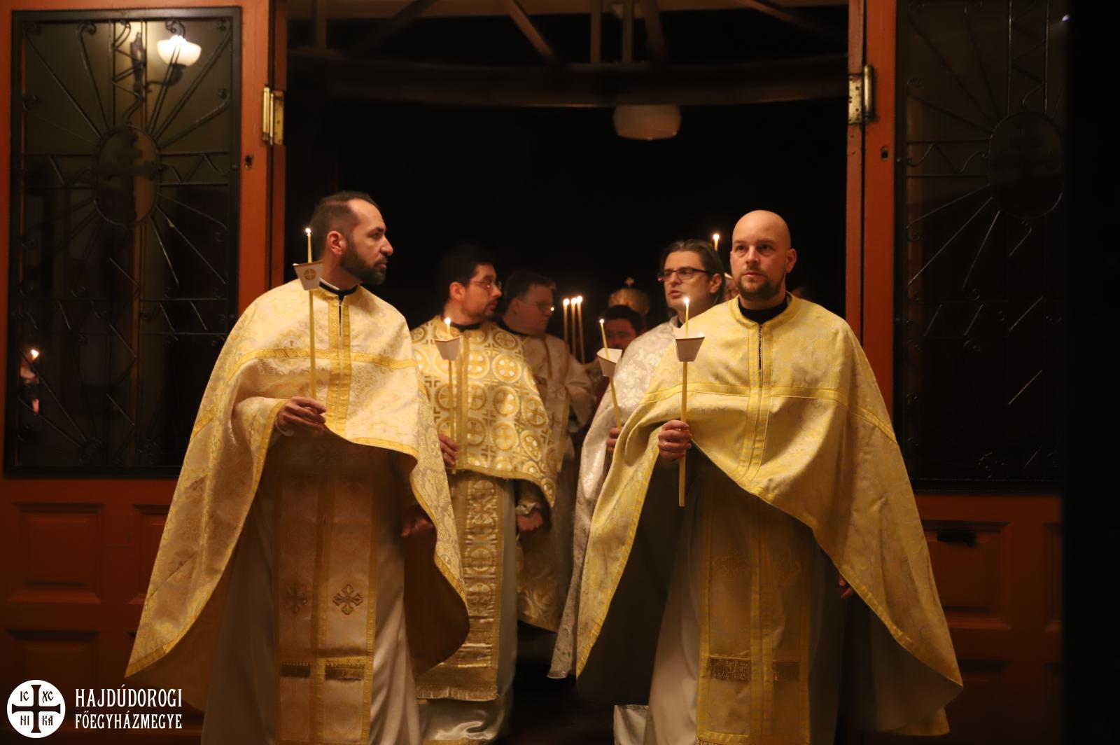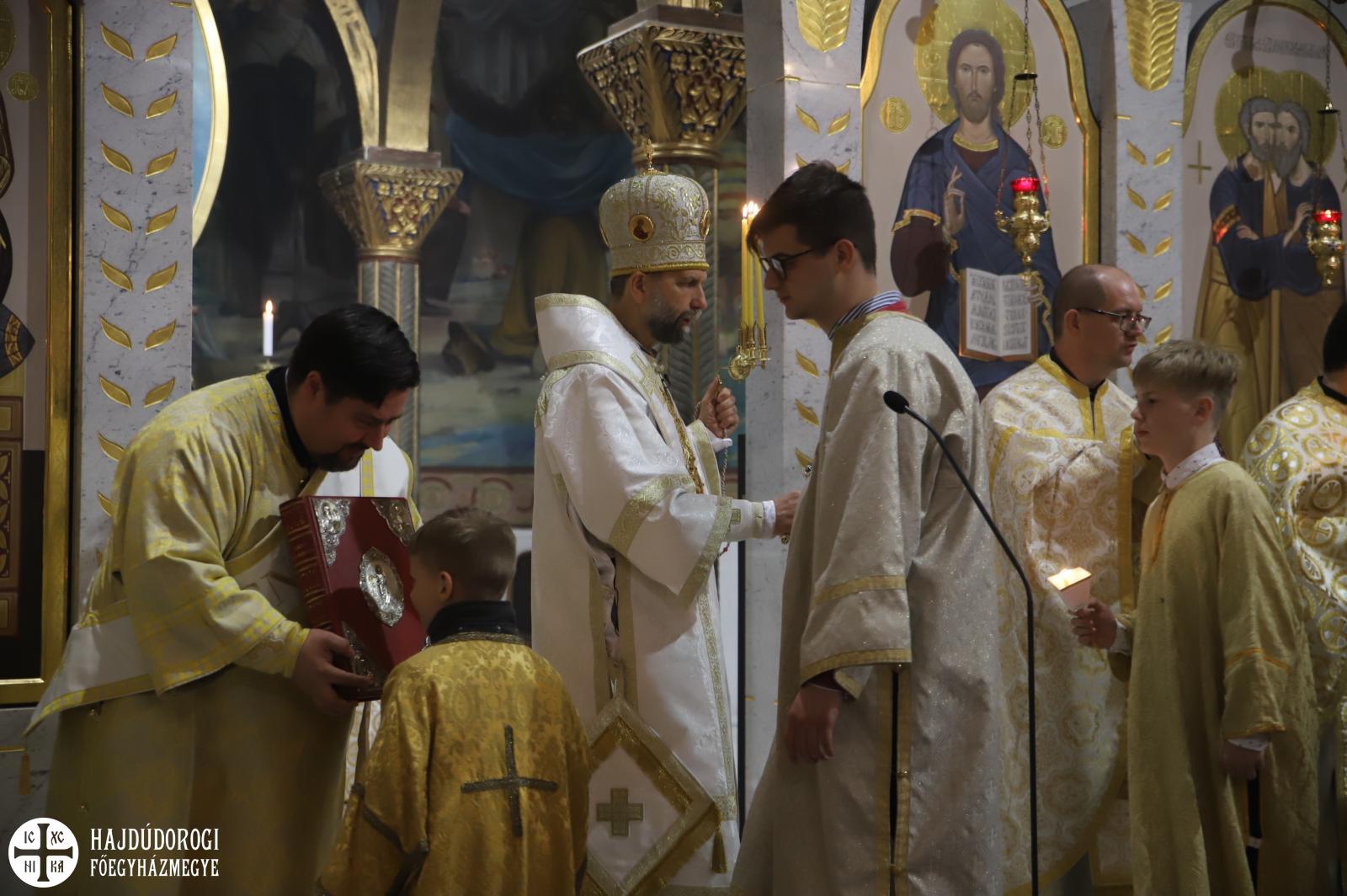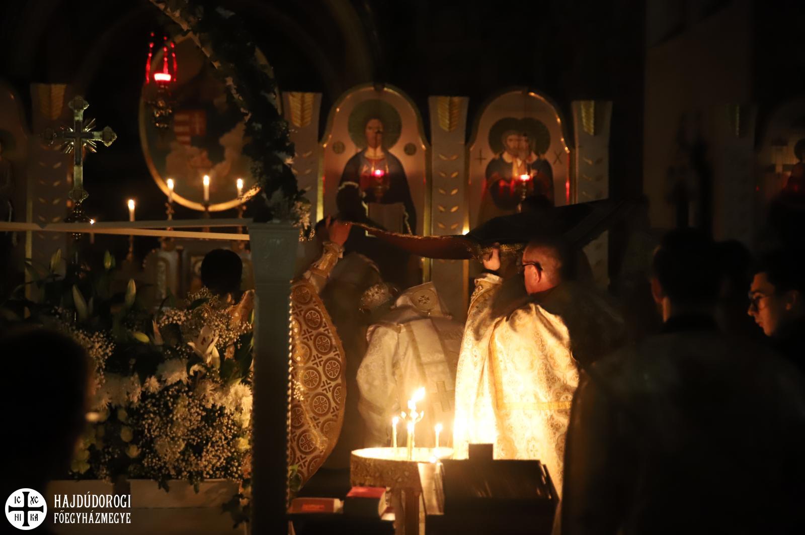 Többször is elhangzott a készületben, hogy ennek a Húsvétnak másnak kell lenni, mint az eddigieknek, ennek a húsvétnak át kell változtatni az életünket, át kell formálnia, nemcsak a mienket, hanem rajtunk keresztül a családunkét, a társadalomét, egész magyar nemzetét, de nem túlzás azt is mondani, hogy az egész világét, hiszen a világ részesei vagyunk mi is. Ha a mi életünk megváltozik, megváltozik tőle a világ is. Idehívott, hogy részesítsen bennünket a föltámadás örömében, idehívott, hogy aztán, amikor útra bocsát bennünket, akkor hirdessük: Föltámadt Krisztus! Így köszöntjük egymást: Föltámadt Krisztus! – ennél nagyobb hír nincsen, ennél többet nem mondhatunk. Mi görögkatolikosok jól tudjuk rá a választ: valóban föltámadt! Az Isten ezzel az örömmel, ünnepléssel mintegy kinyilatkoztatja az ő erejét és hatalmát. Föltámadt Krisztus, valóban föltámadt! Itt van velünk, átalakítja az életünket.