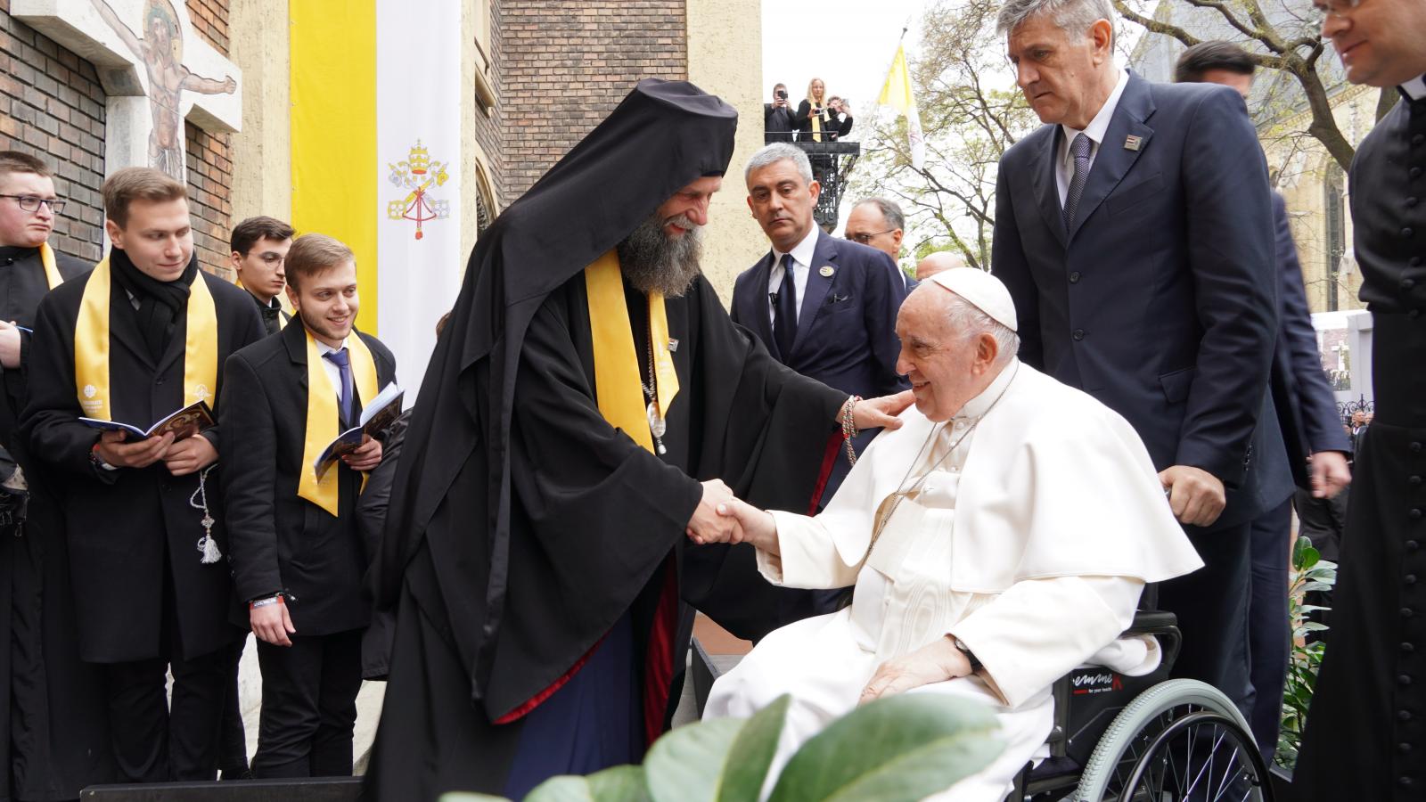 Ezzel a mai látogatással, hogy a legfőbb egyházfő betért szerény, keleti hajlékunkba, óriási megerősítést kaptunk, hogy a katolikus családnak mi is egyenértékű tagjai vagyunk. Ígéretet teszünk arra, hogy miközben Krisztust keressük és hirdetjük, egyházi létünkben az egység hordozói és hirdetői leszünk.