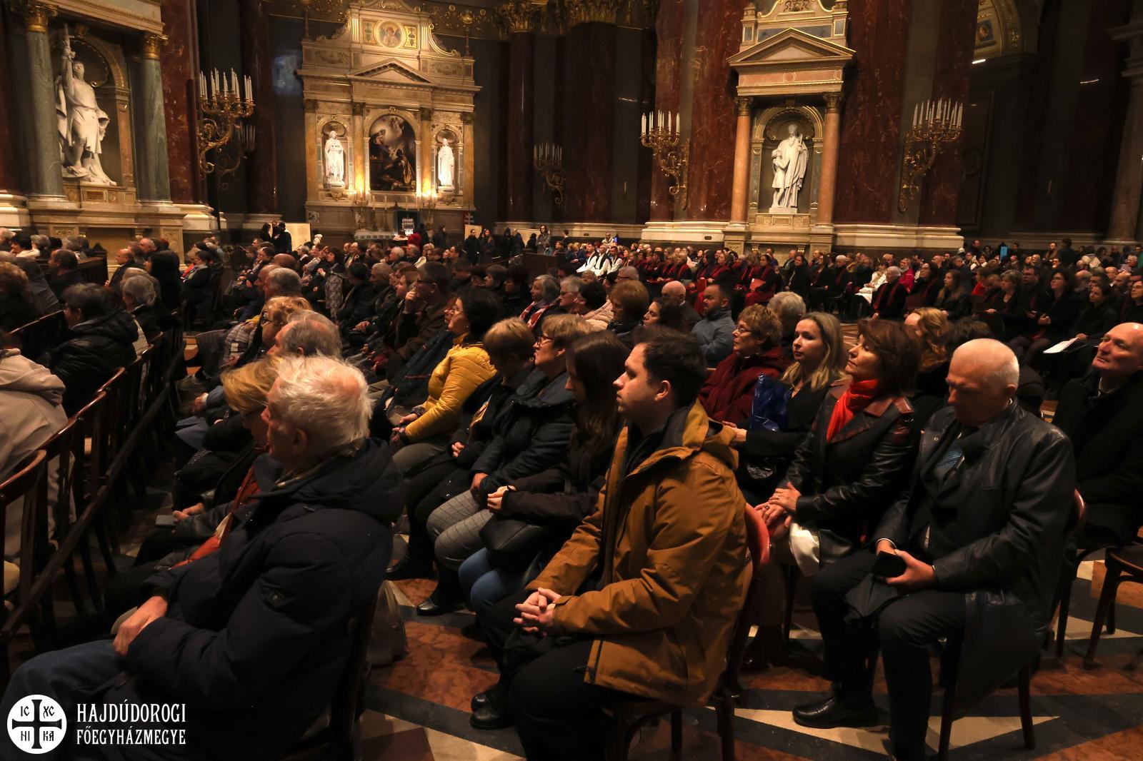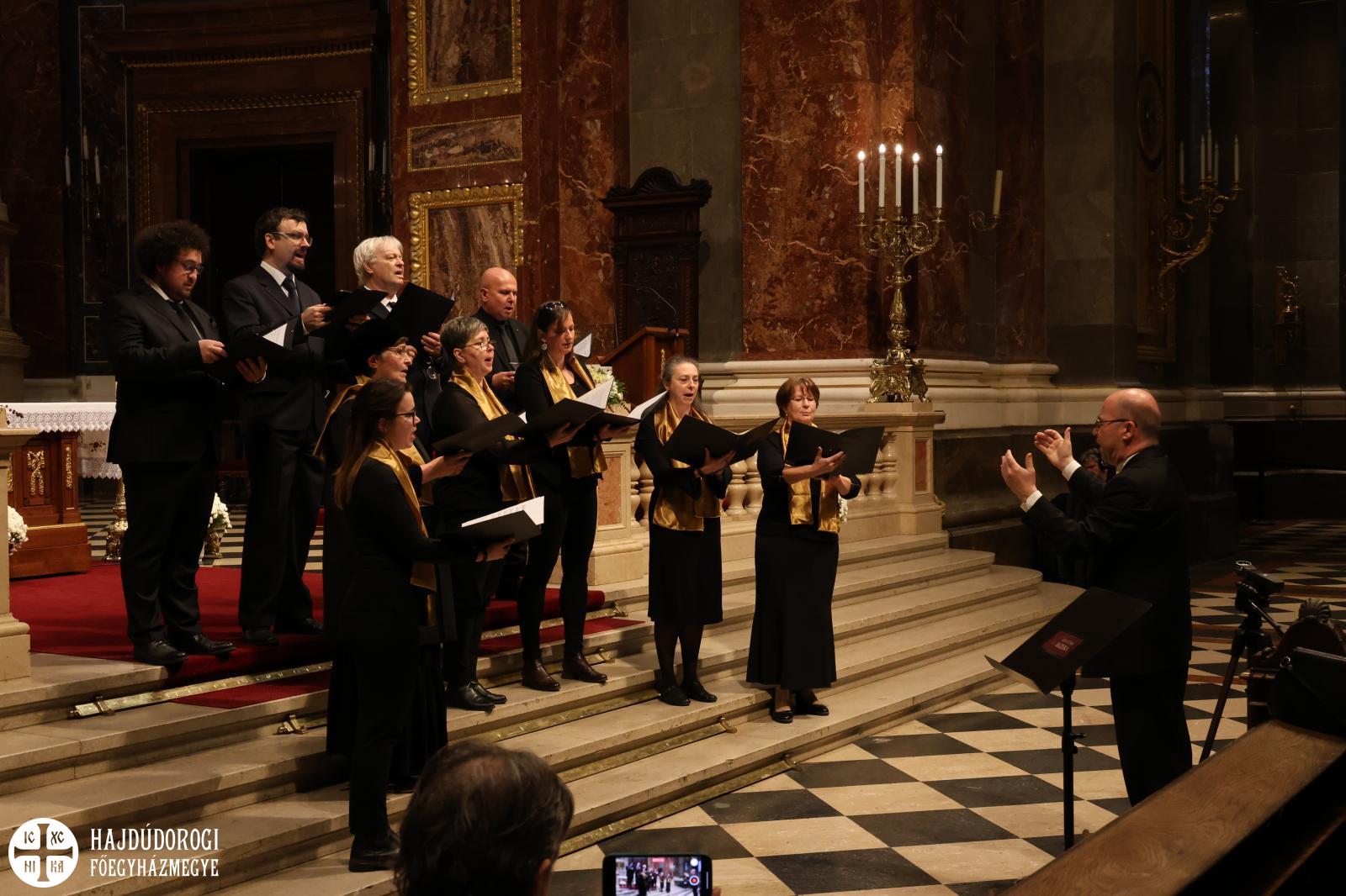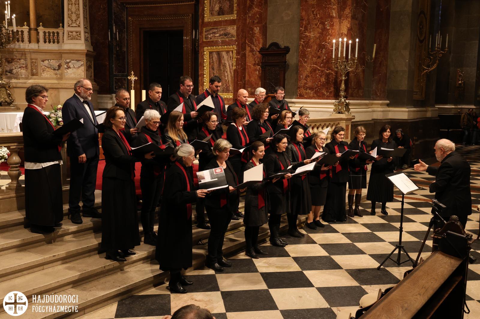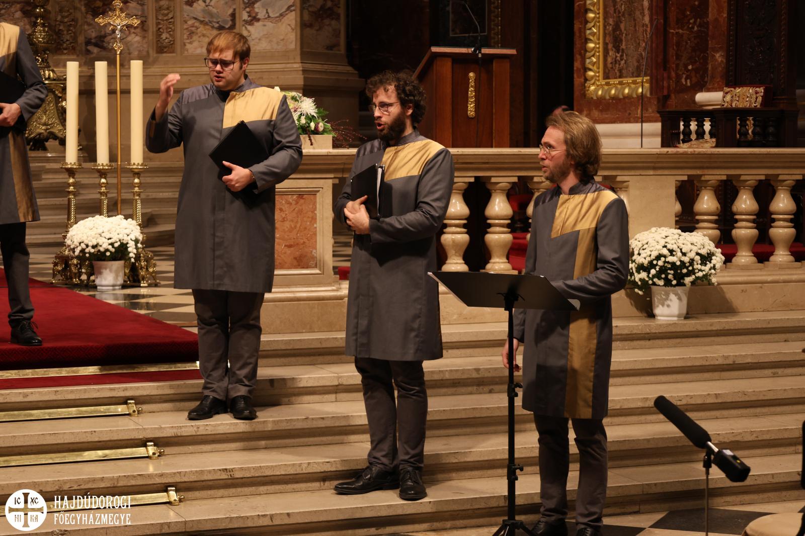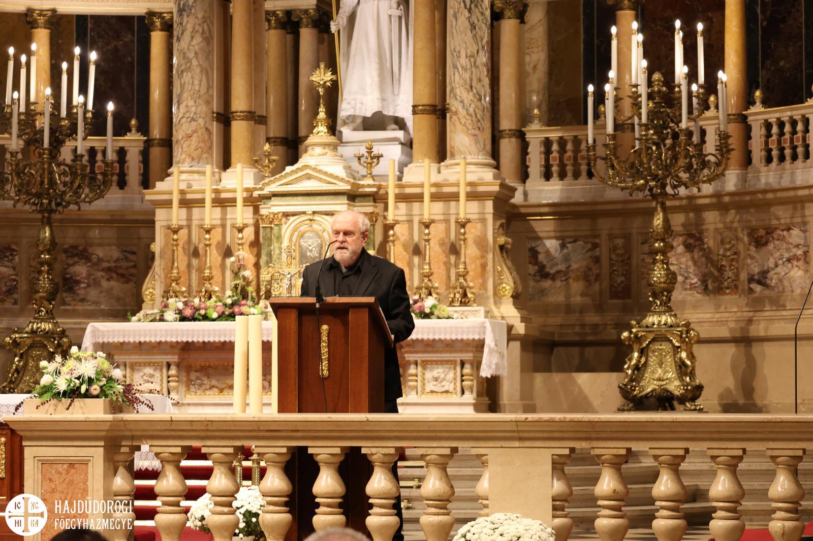 “Kívánom, hogy ez a mai együttlétünk fokozza a hűségünket azon Jézus Krisztus irányába, aki a Jelenések könyve szerint a hű tanú, és annyit kér közösségeitől, hogy légy hű mindhalálig. Az egyik Szent Páltól ránk maradt legutolsó levélben, amit Timóteushoz írt, megkapjuk ezt a nagyon fontos biztatást: ha vele együtt meghalunk, vele együtt élni is fogunk, ha vele együtt szenvedünk, vele együtt uralkodni is fogunk, ha megtagadjuk őt, Ő is megtagad minket, de ha hűtlenek leszünk, Ő hű marad, mert önmagát meg nem tagadhatja. Ezt a Megváltó Krisztust köszöntjük itt ma a Szent István Bazilikában”- adta át ezzel a szót a kóruséneklésnek a miskolci püspökatya.