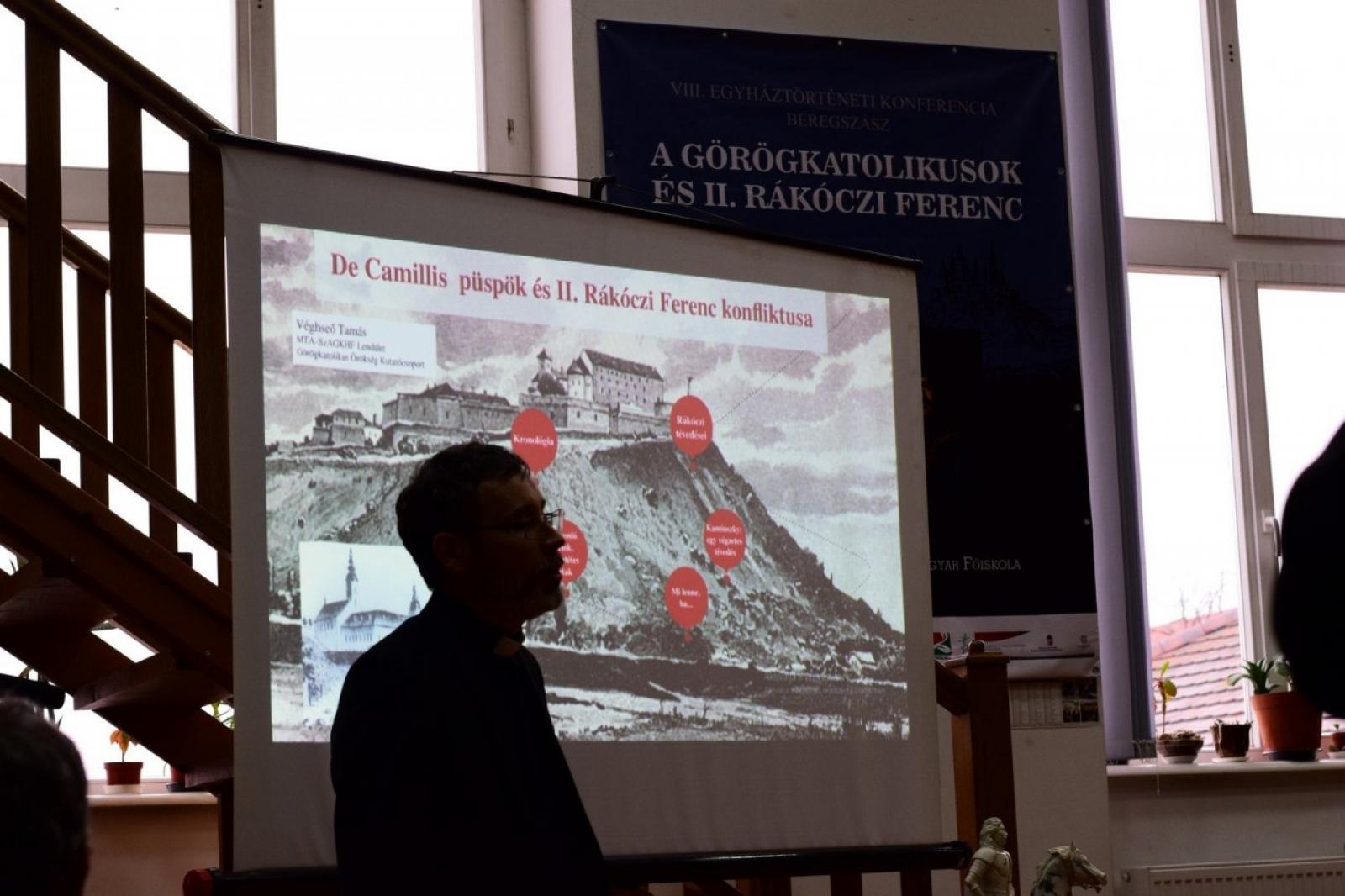 A továbbiakban Véghseő Tamás, a Szent Atanáz Görögkatolikus Hittudományi Főiskola rektora, egyháztörténésze beszélt a De Camillis püspök és II. Rákóczi Ferenc konfliktusáról és annak következményeiről.