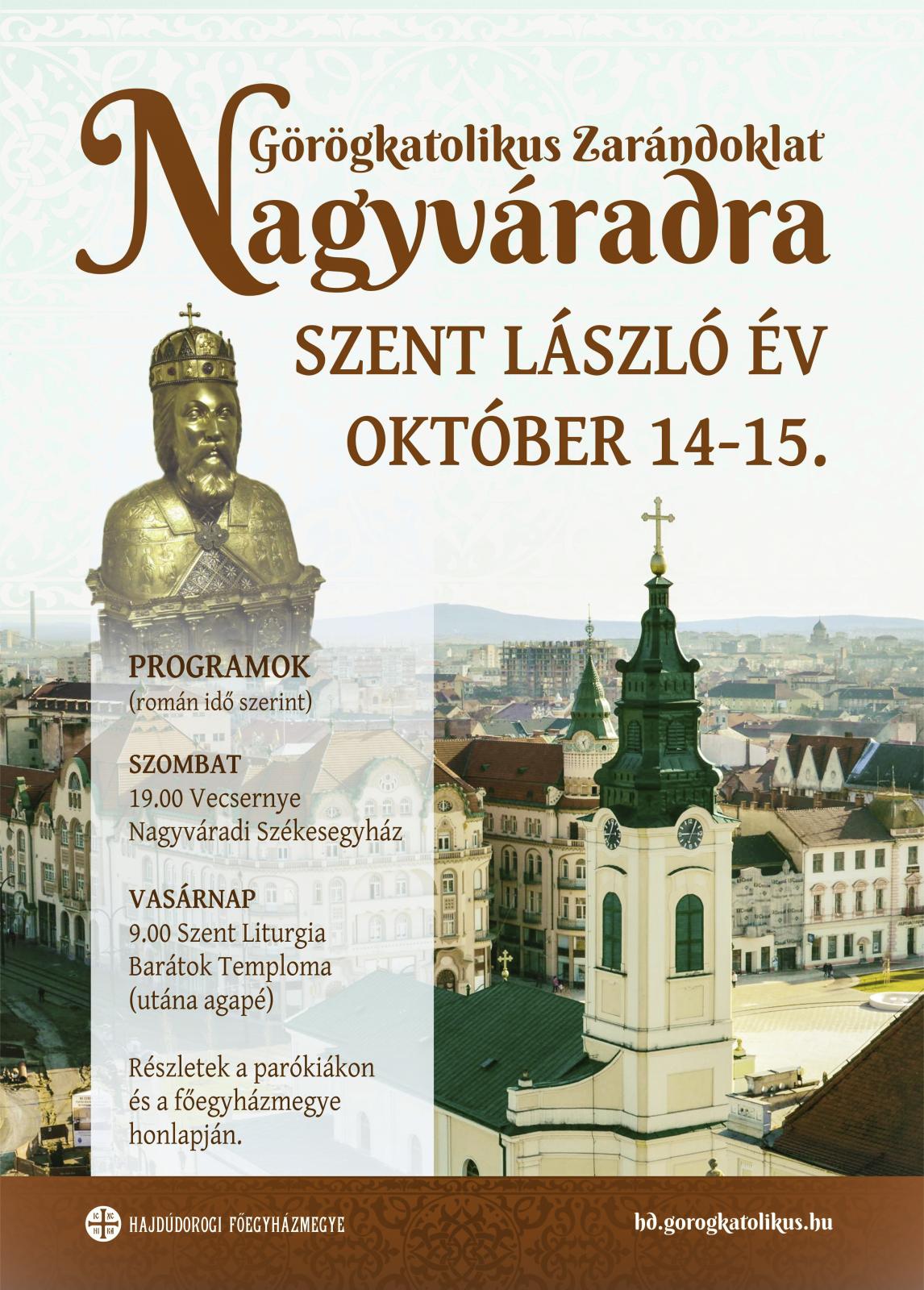 2017. október 14-15-én Görögkatolikus Zarándoklatot szervez a Hajdúdorogi Főegyházmegye a Szent László emlékévhez kapcsolódóan. A cél: Nagyvárad. Jelentkezni Rakaczkiné Vadász Viktóriánál lehet, e-mailben: hepi@hd.gorogkatolikus.hu, telefonon: 06 30/768 78 21.