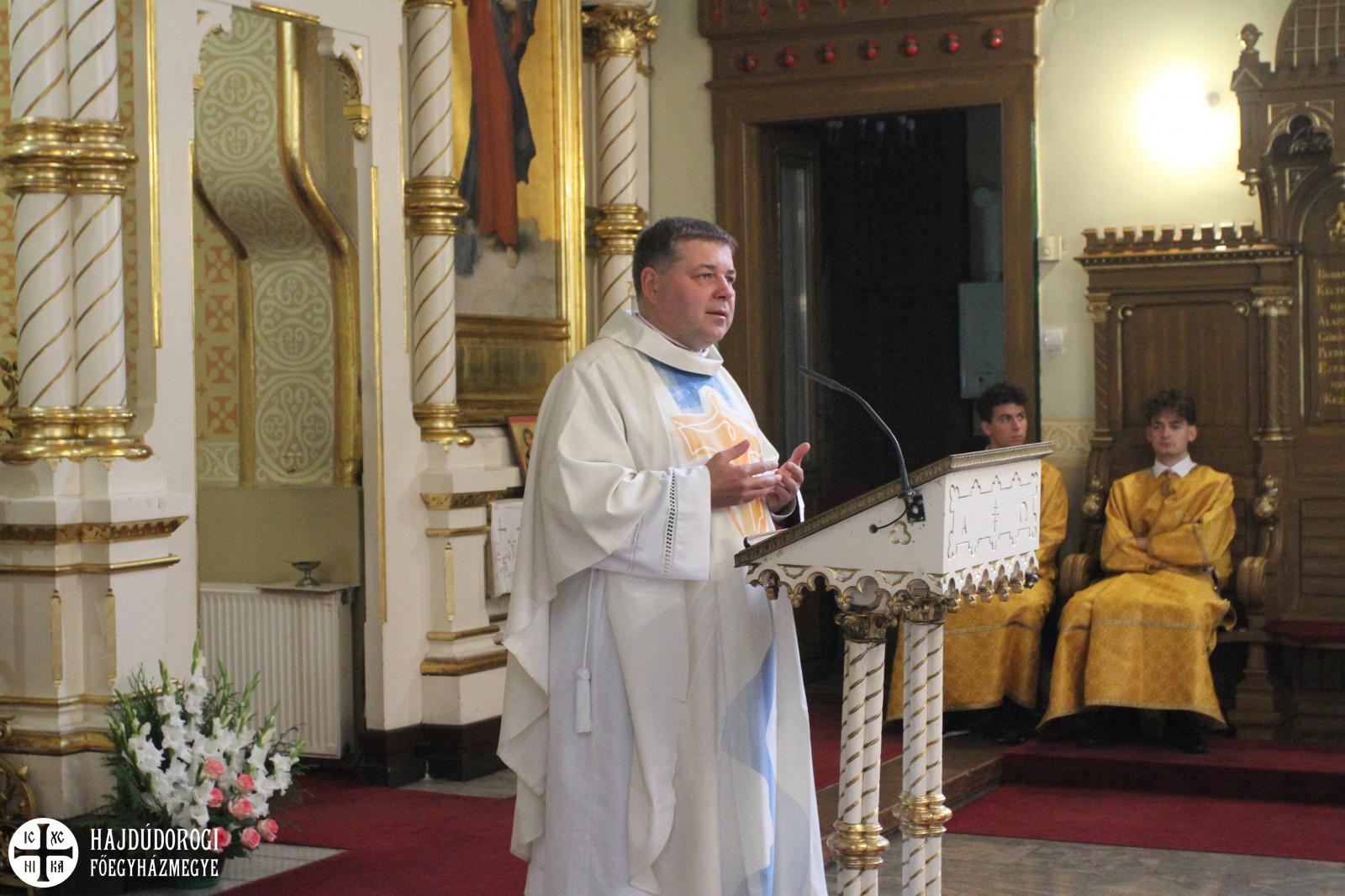 “Maga az Istenszülő, Szűz Mária volt az, aki igazán nagyot mert. Oda merte tenni egész életét Isten tenyerébe, sorsának, életének összes bizonytalanságát oda merte neki adni. Azt merte mondani az angyal üdvözletére, hogy Legyen nekem a te igéd szerint, azaz rád bízom az életemet, pedig nem tudom, mi lesz a nyereségem. Egy dolgot azonban biztosan tudhatott: ha Istenre bízzuk az életünket, a szeretteink életét, akkor baj nem történhet. Mária valószínűleg sejtette, hogy ez az igen nem lesz egyszerű, tudjuk, végül meg kellett élnie saját gyermeke halálát, ami egy szülőnek a legszörnyűségesebb. Tamás atya hangsúlyozta: ha Istenre bízzuk az életünket, az nem azt jelenti, hogy minden a saját terveink szerint fog alakulni. “A vigasz az, hogy aki meri bátran Isten szerint alakítani az életét, az biztosan győztes lesz. Szűz Mária életében is voltak olyan pillanatok, amikor nem értette mi, miért történik vele, de változatlanul mert bízni Istenben. És a végén minden értelmet nyert. Az Istenszülő adott elsőként tanúságot nekünk, hogyan lehet Istenre bízott életet élni, igazán győztessé válni a nehézségeken keresztül is.”