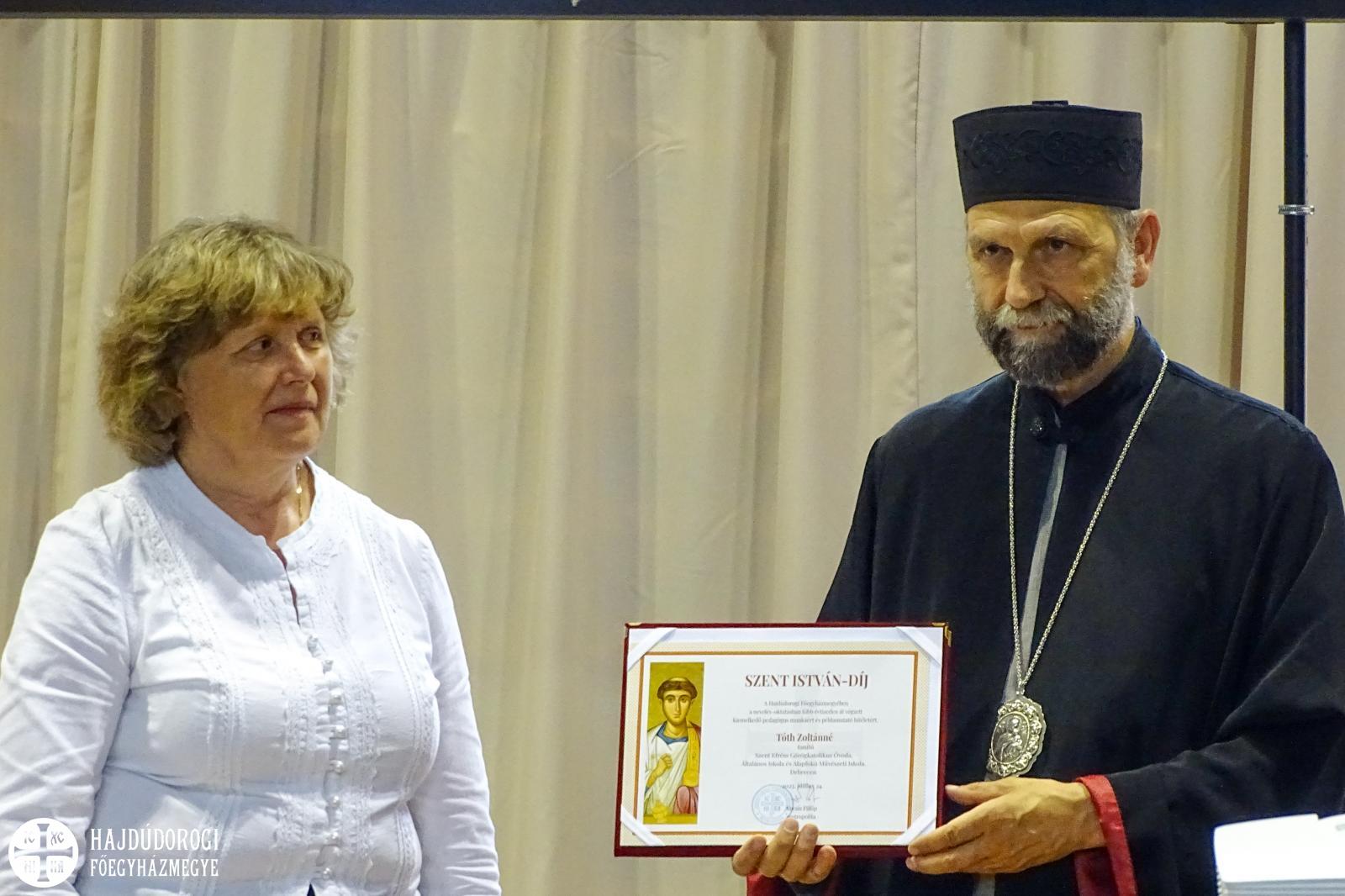 A Hajdúdorogi Főegyházmegyében a nevelés-oktatásban több évtizeden át végzett kiemelkedő pedagógus munkájáért és példamutató hitéletéért Szent István-díjban részesült Tóth Zoltánné tanítónő, a debreceni Szent Efrém Görögkatolikus Óvoda, Általános Iskola és AMI pedagógusa.