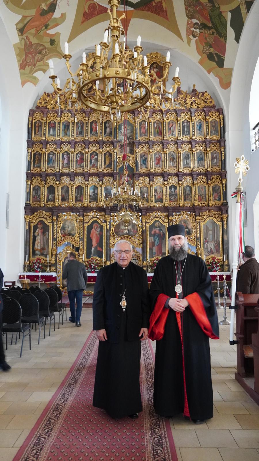 A köszöntő szavak után a jelenlévők énekkel köszöntötték az idős főpapot, aki ezután Fülöp metropolitával megtekintette a székesegyházat. A templom és az ikonosztáz történetét Dalanics Zoltán parókus atya mutatta be, majd a hajdúdorogi görögkatolikusok nevében egy Monostory Viktória által készített rézkarcot ajándékozott I. Józsefnek. A pátriárka és titkára egy gyönyörű, kétszólamú, arab nyelvű Istenszülő-imádságot énekelt, melyet minden bizonnyal először hallottak székesegyházunk falai.